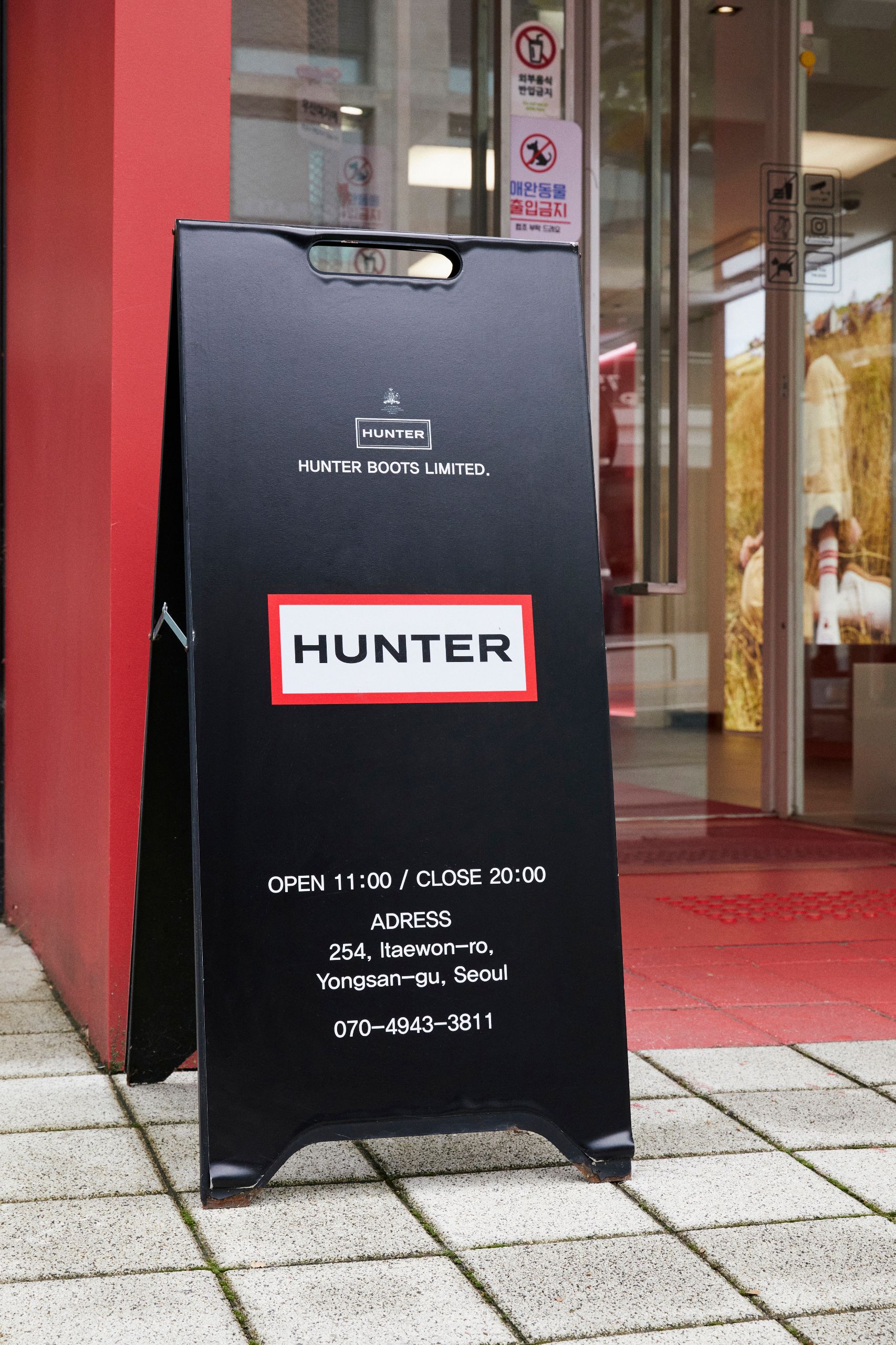 한남동의 수많은 건물들 사이에서 헌터만의 특색을 잘 보여줄 수 있는 방법에 대해 고민했어요. 입구에서부터 시그니처 로고를 떠올릴 수 있도록 레드 컬러 바탕으로 게이트를 구성하였죠. 특히 고객들이 들어서자마자 마주치는 레인부츠 오브제는 헌터의 정체성을 각인시킨 한남 플래그십 스토어의 가장 중요한 포인트에요.