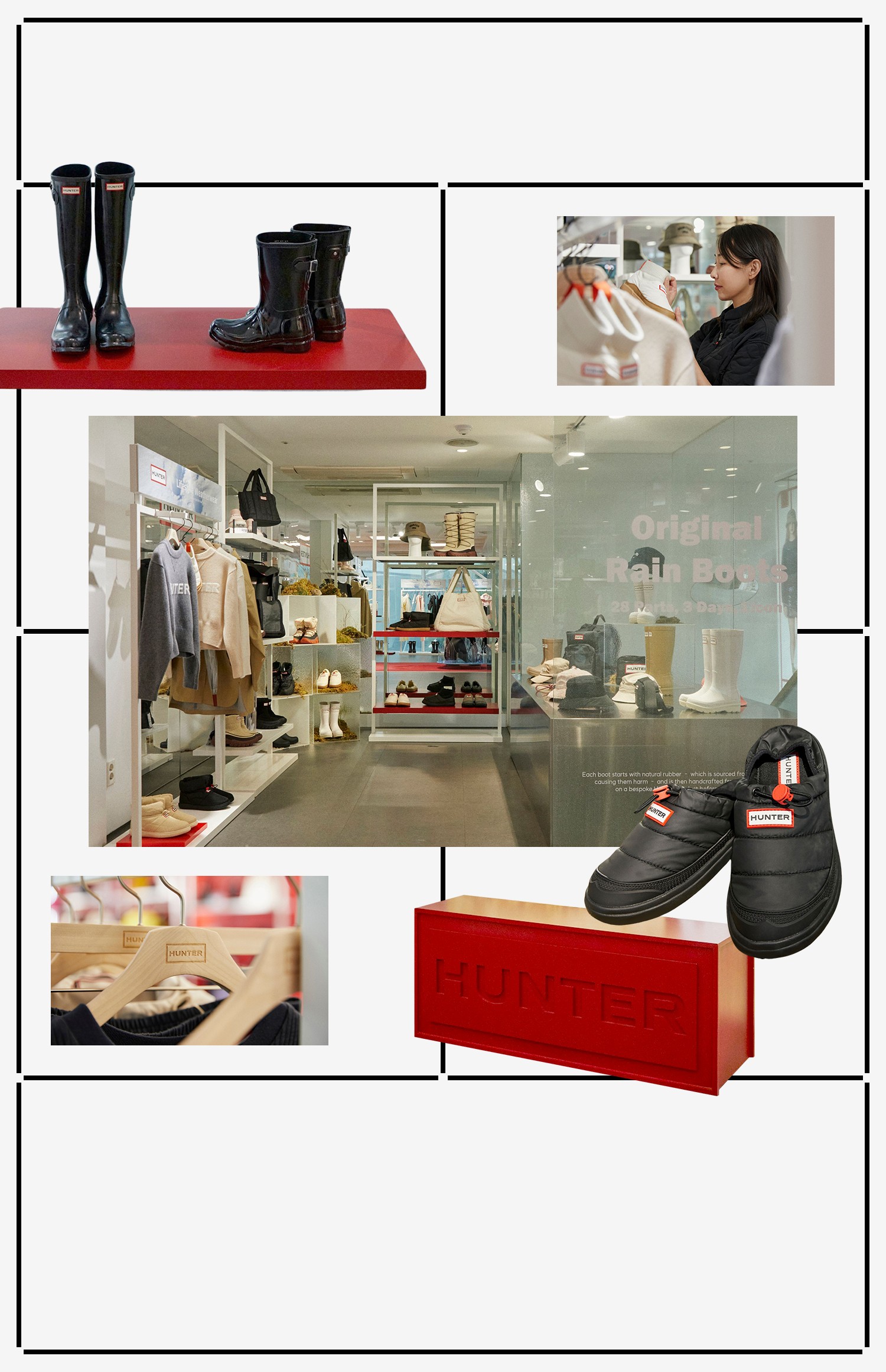 고객들에게 단순한 쇼핑 공간을 넘어 브랜드의 철학과 가치를 느낄 수 있는 문화적 허브가 되었으면 해요. 헌터의 헤리티지를 바탕으로 확대되는 제품들의 조화를 즐길 수 있는 공간이길 바라죠. 또한 지속 가능한 라이프스타일을 고객들이 보다 다채롭게 경험할 수 있도록 하는 것이 헌터의 궁극적인 목표입니다.