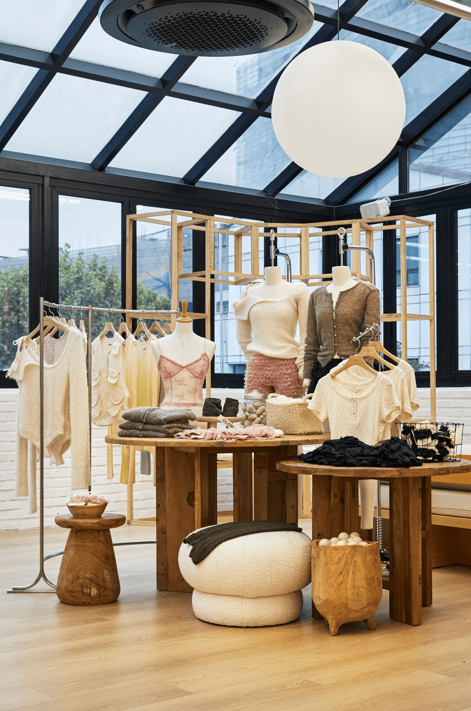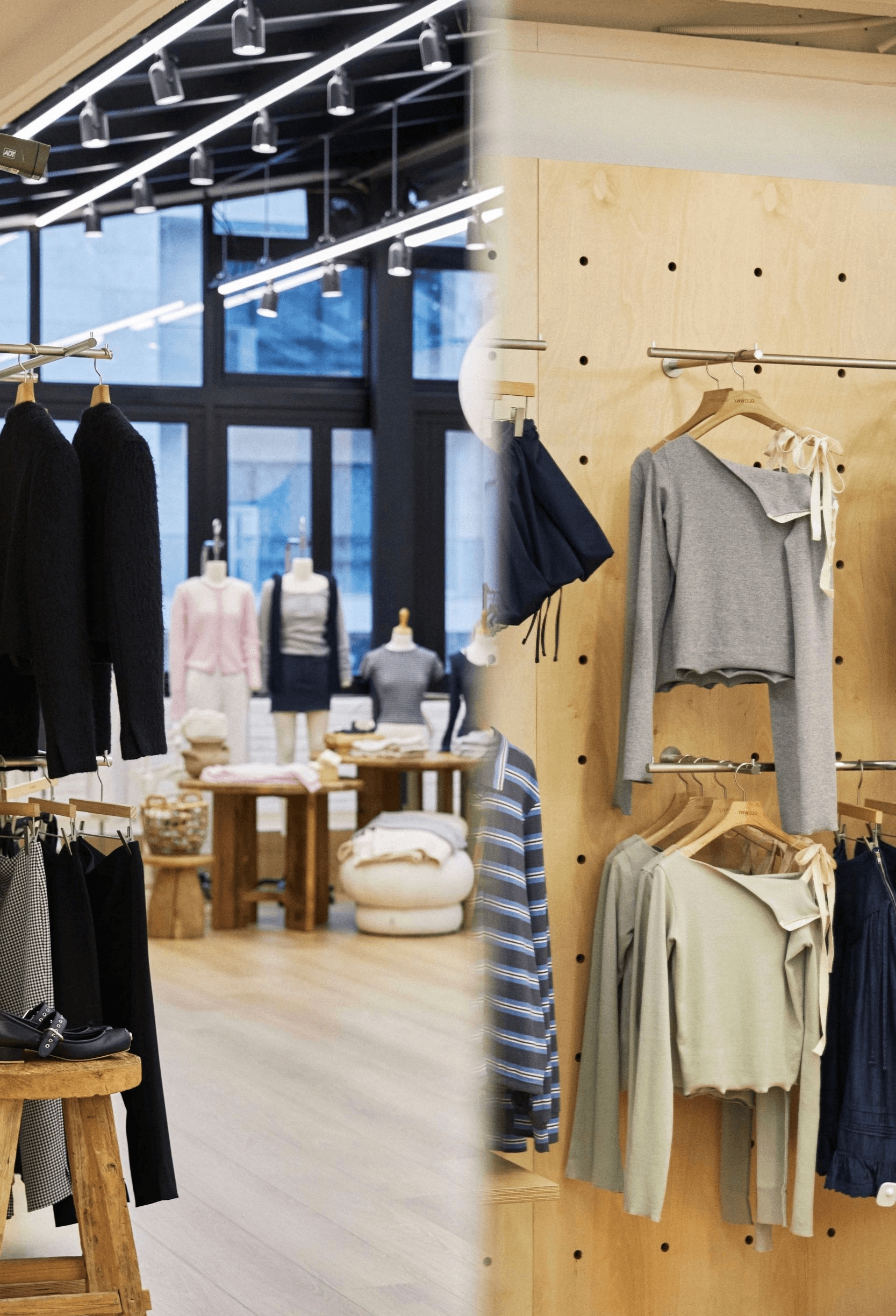 무엇보다도 고객 경험의 질을 높이는 것이 팀 글로니의 과제였습니다. 이전 쇼룸의 단점을 보완해 피팅 룸의 개수를 10개로 늘려 대기 시간을 최소화했고, 쇼핑 중간중간 쉬어갈 수 있도록 소파와 포토 부스를 마련했습니다. 이뿐만 아니라 직접 고른 음악 플레이리스트와 가구, 소품 등으로 브랜드를 온몸으로 체험할 수 있도록 쇼핑 이상의 영감을 제공하고 있습니다.