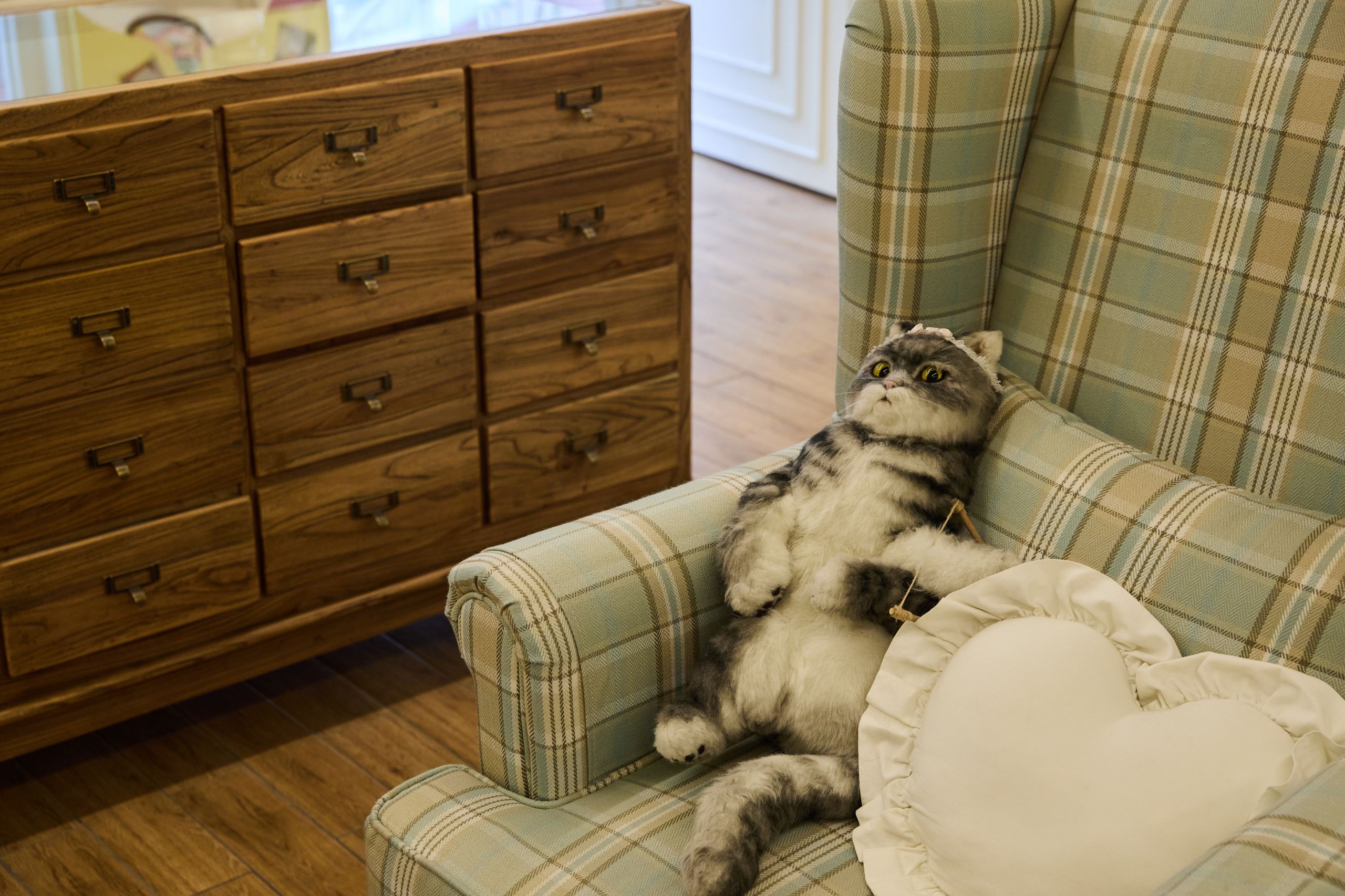 디렉터 쇼룸에는 아주 귀여운 친구들이 있어요. 바로 거실에 있는 고양이와 방에 누워있는 아기 리트리버인데요. 이 인형들은 쇼룸의 마스코트 같은 존재예요. 가끔 실제 살아 있는 동물인 줄 알고 너무 귀여워하시는 분들이 계신데, 그 진심 어린 반응을 보면 동물을 사랑하는 사람들끼리만 통하는 따뜻한 공감대가 느껴져요.