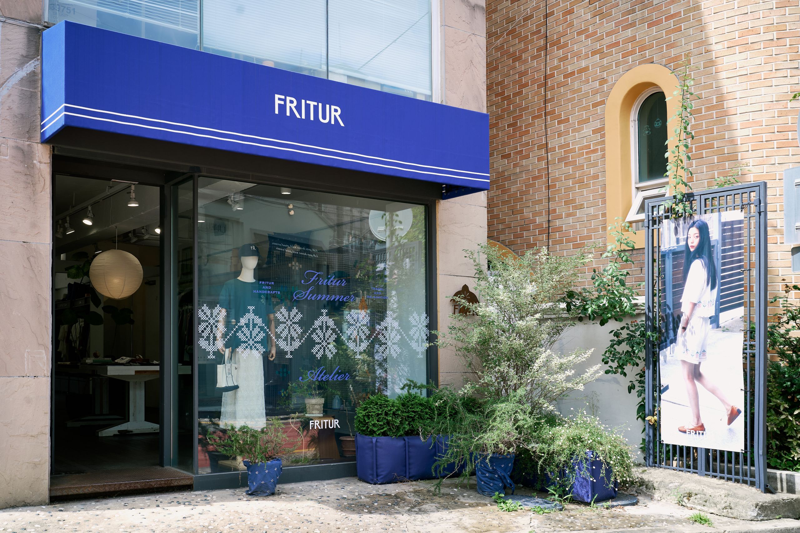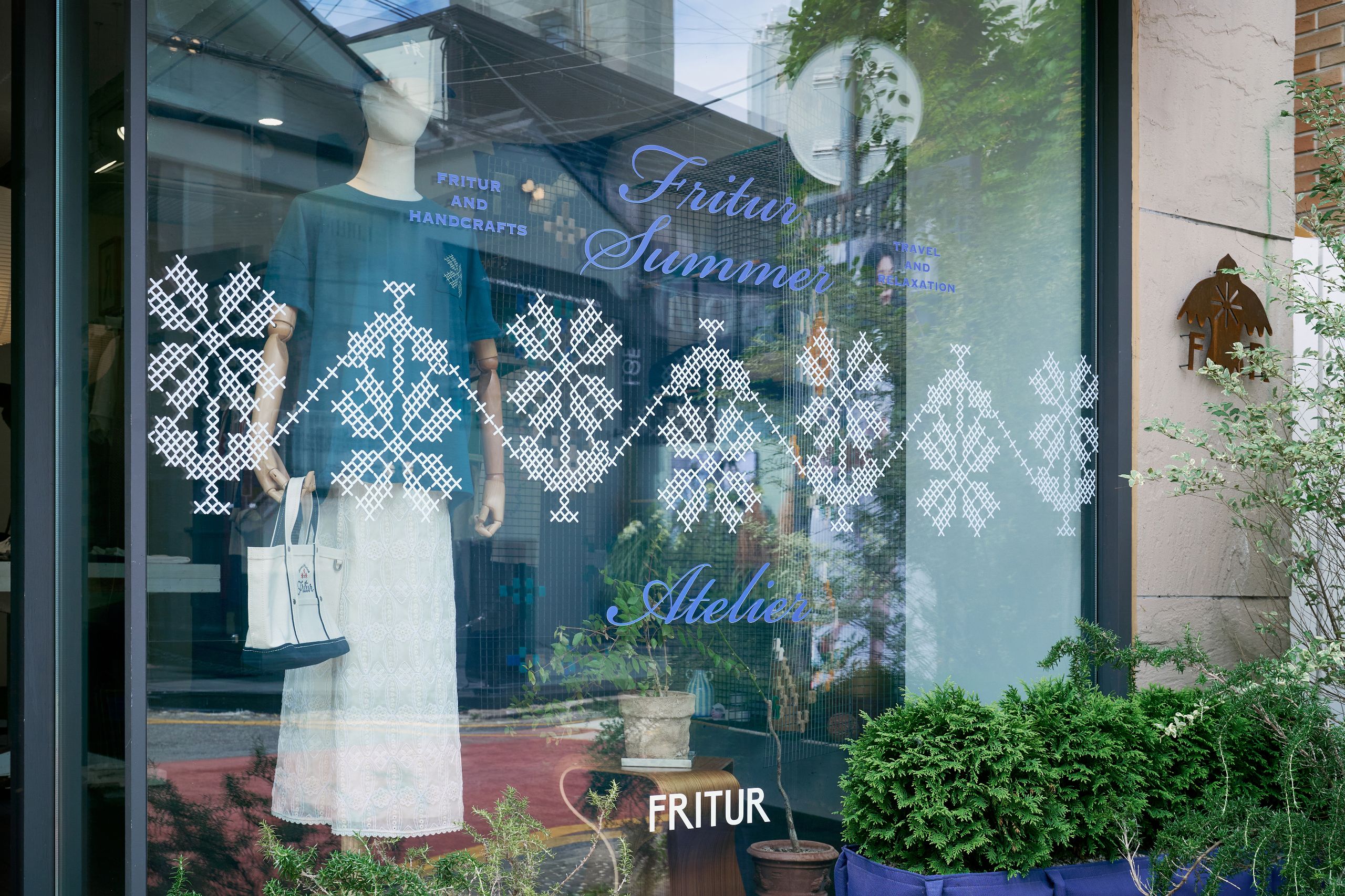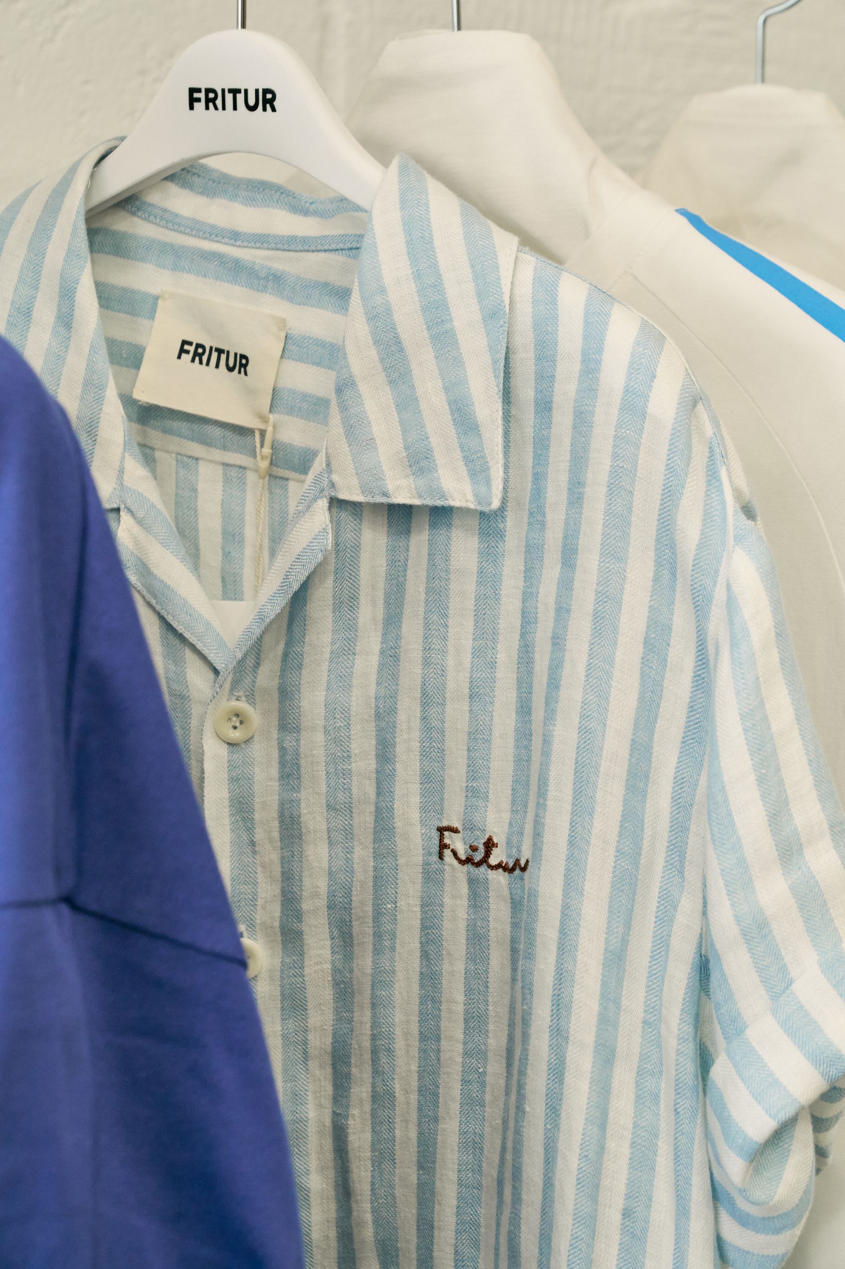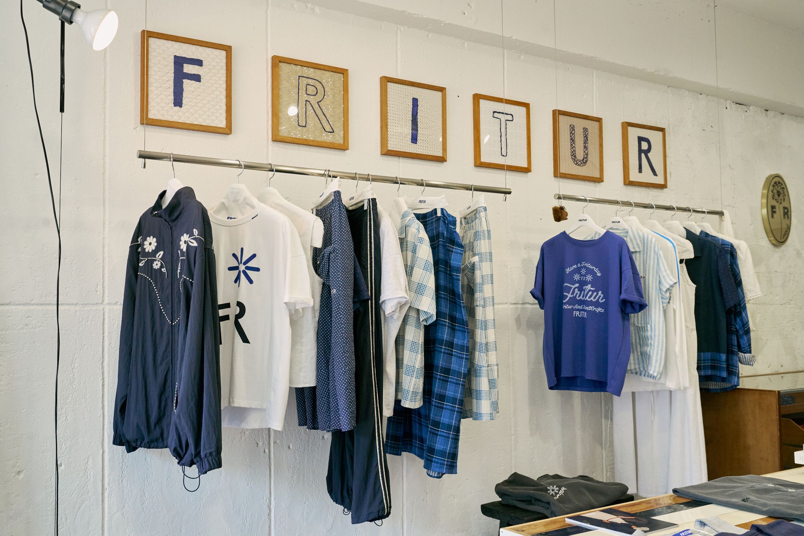 디렉터 브랜드를 온전히 표현하기 위해 프리터의 슬로건인 'FRITUR AND HANDCRAFTS'를 VMD에 그대로 재현했습니다. 외관엔 브랜드 컬러인 블루를 사용했고 내부는 네덜란드 디자이너인 피트 하인 이크의 패치 워크 스타일의 테이블로 중심을 잡았어요. 손으로 자수를 넣은 액자와 스테인레스 벽 장식의 디테일에도 프리터의 미학을 담았습니다. 이번 시즌은 통기성 좋은 소재에 섬세한 자수를 넣은 리넨 셔츠를 소개하고 싶습니다. 프리터의 여름이 셔츠에 담겨있어요.