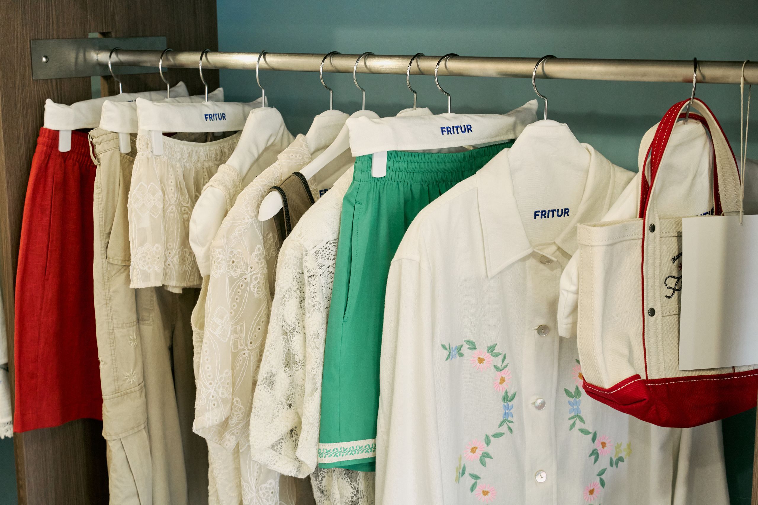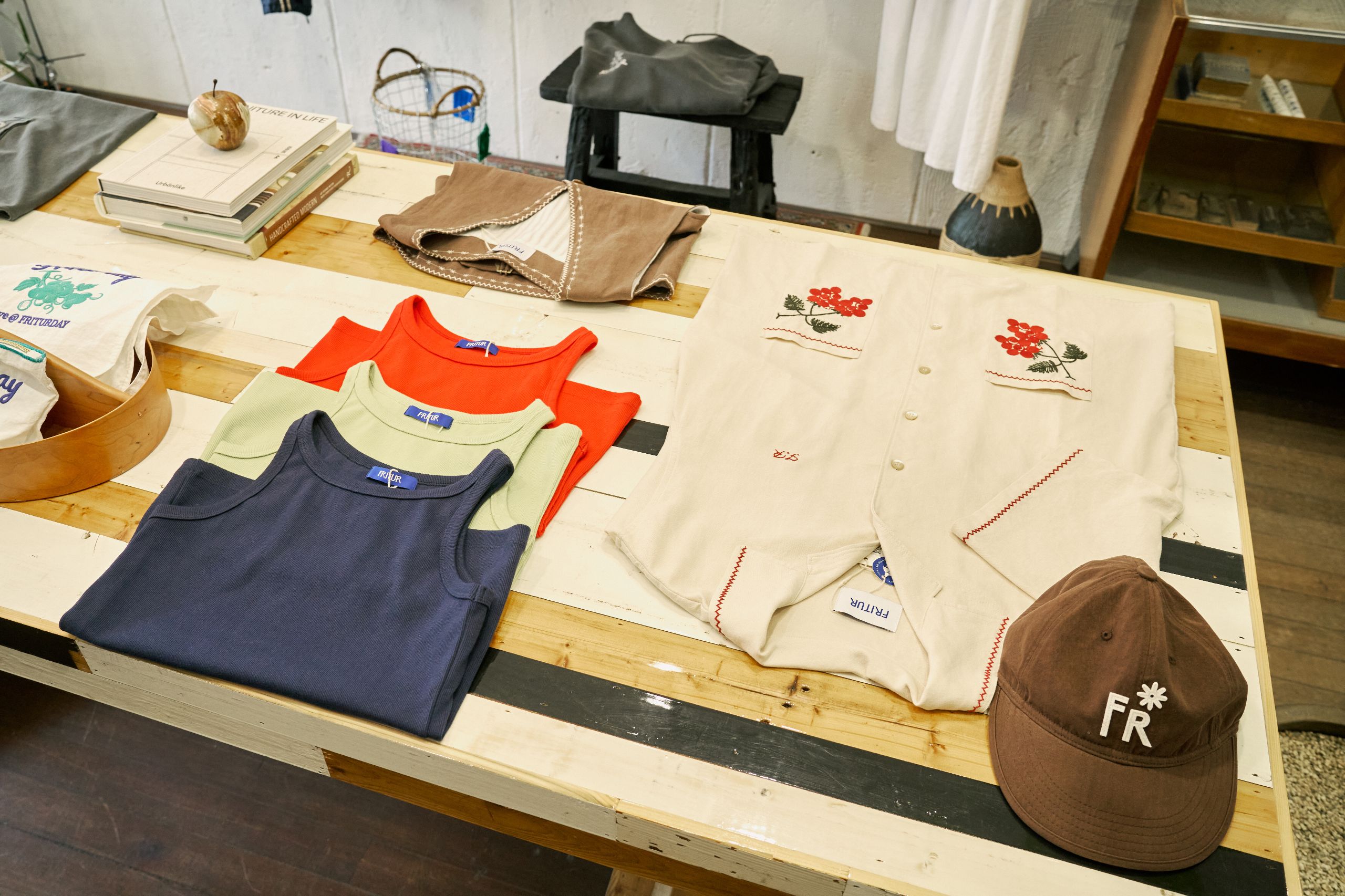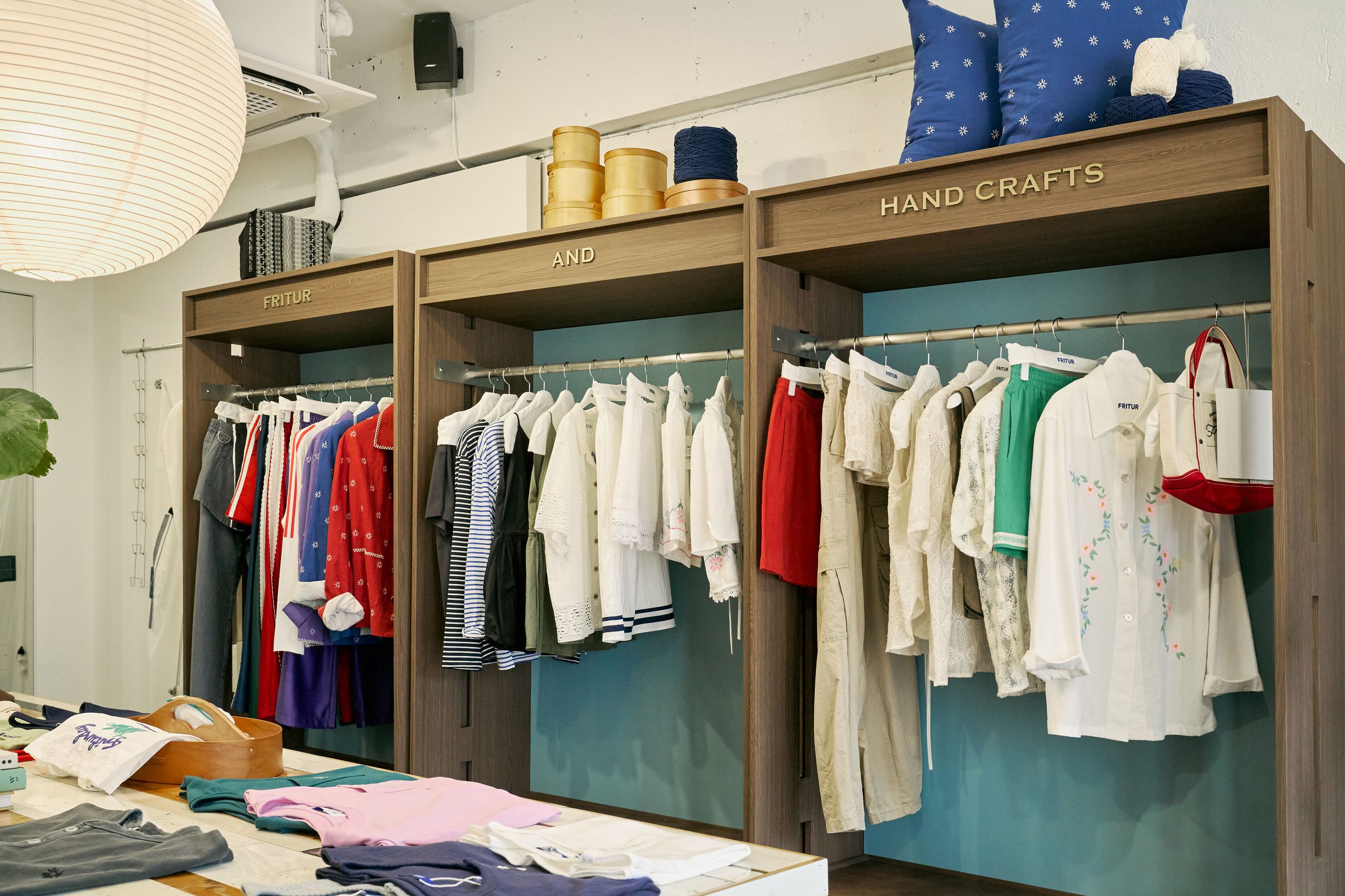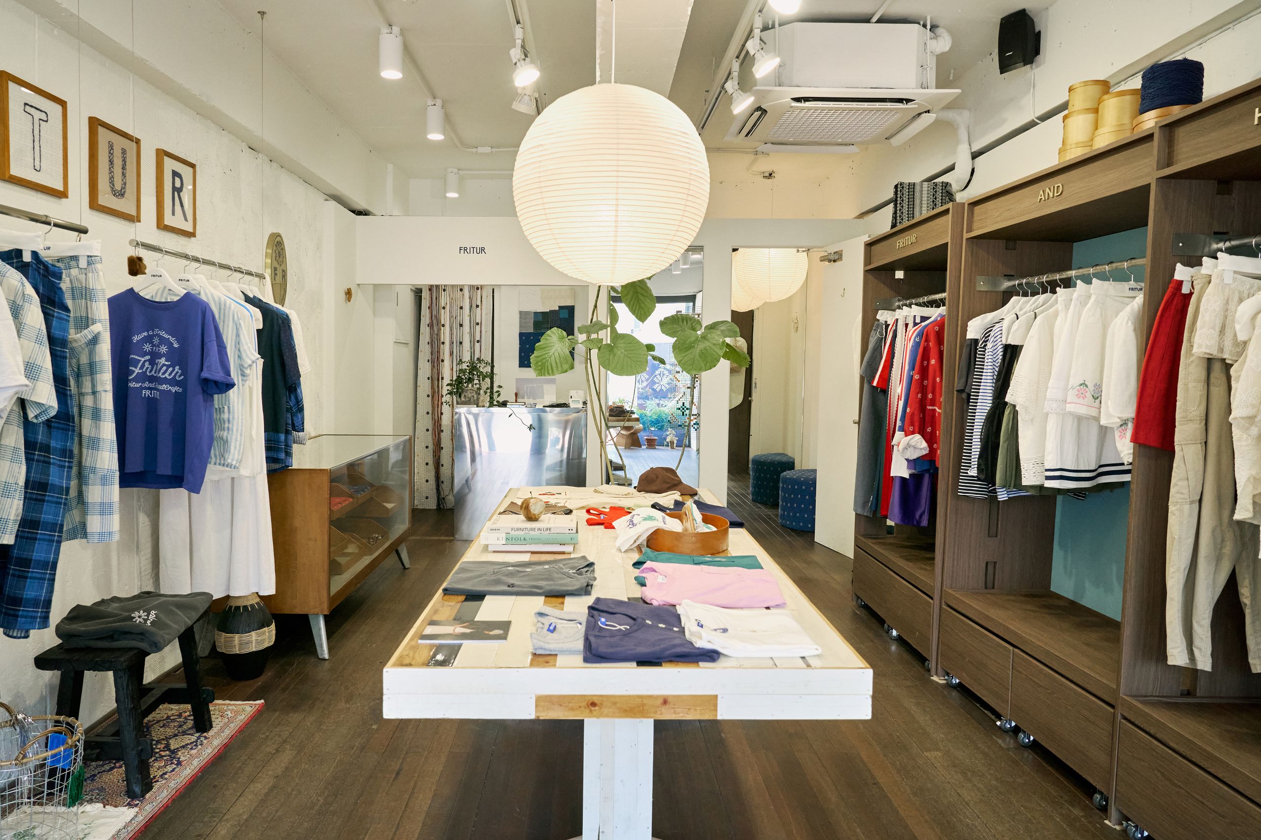 디렉터 브랜드를 온전히 표현하기 위해 프리터의 슬로건인 'FRITUR AND HANDCRAFTS'를 VMD에 그대로 재현했습니다. 외관엔 브랜드 컬러인 블루를 사용했고 내부는 네덜란드 디자이너인 피트 하인 이크의 패치 워크 스타일의 테이블로 중심을 잡았어요. 손으로 자수를 넣은 액자와 스테인레스 벽 장식의 디테일에도 프리터의 미학을 담았습니다. 이번 시즌은 통기성 좋은 소재에 섬세한 자수를 넣은 리넨 셔츠를 소개하고 싶습니다. 프리터의 여름이 셔츠에 담겨있어요.