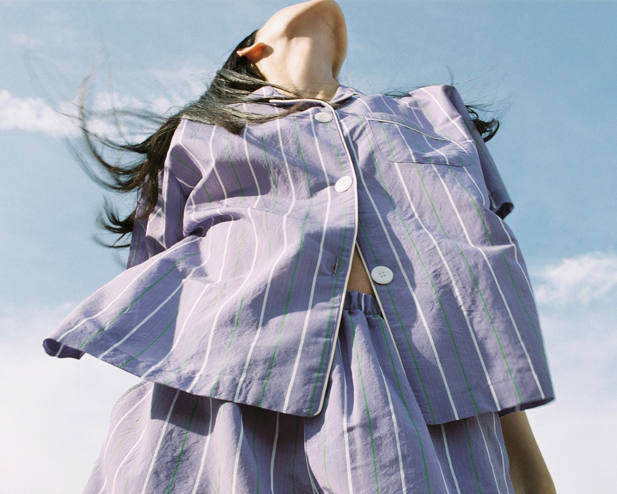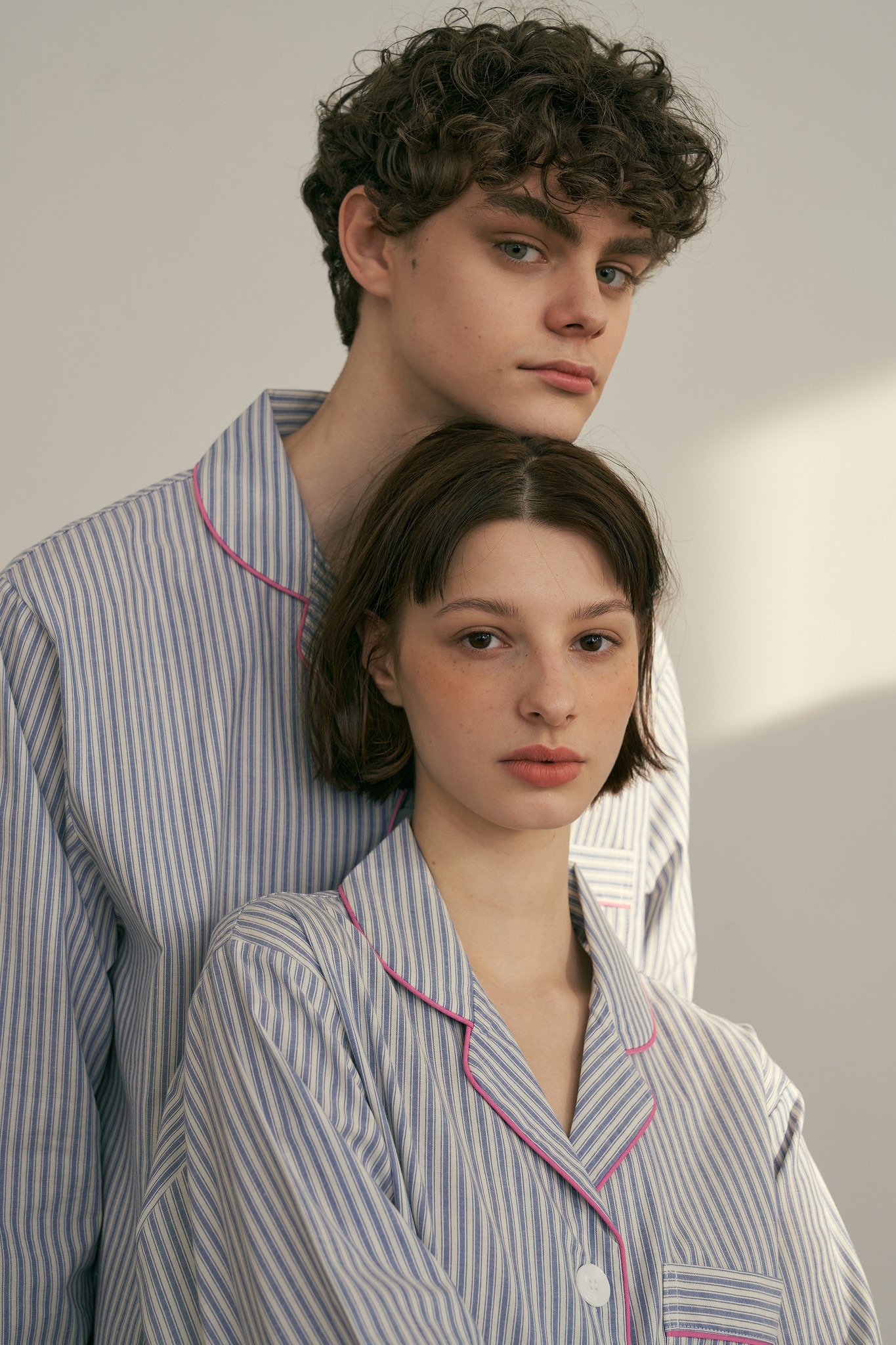 호주 블루마운틴스 여행에서 받은 영감으로 만든 패턴입니다. 산이 겹겹이 쌓인 모습을 파란 스트라이프로 표현한 거예요. 면 40수라는 기본 원단을 쓰긴 했는데, 조스라운지에서 밀도를 조절해 한여름을 제외한다면 1년 내내 입을 수 있을 만큼 편안한 잠옷이라고 감히 얘기할 수 있을 것 같습니다. 이 제품은 사실 출시 초기에는 별 반응이 없었는데 이후 입소문을 타면서 자연스럽게 베스트셀러에 이름을 올리게 되었어요.