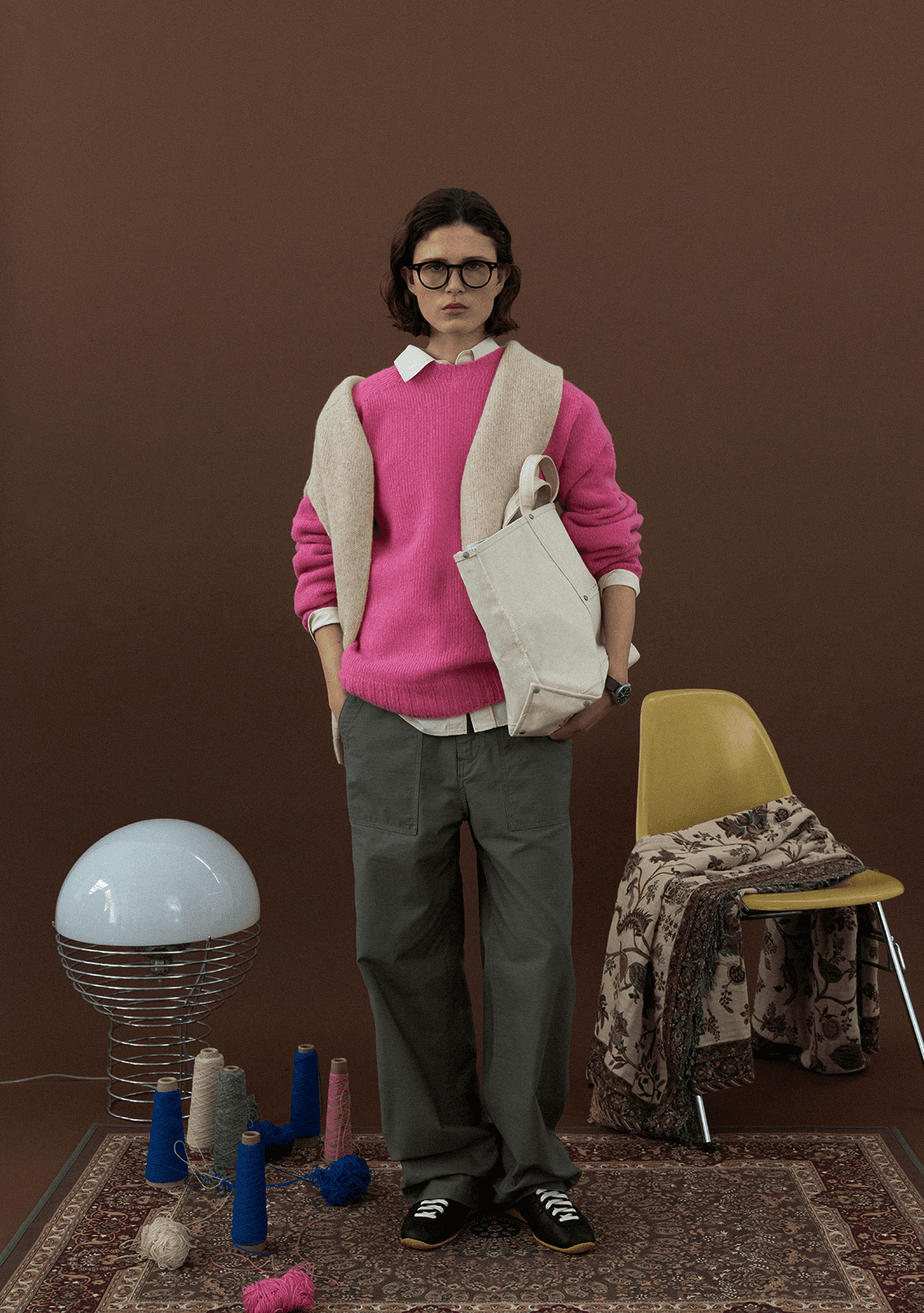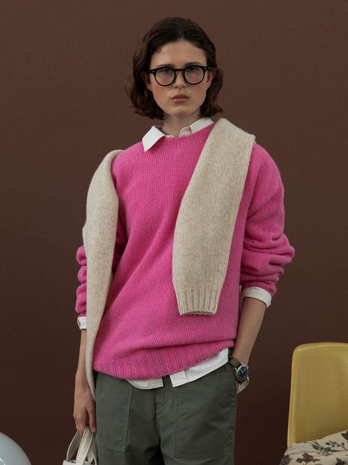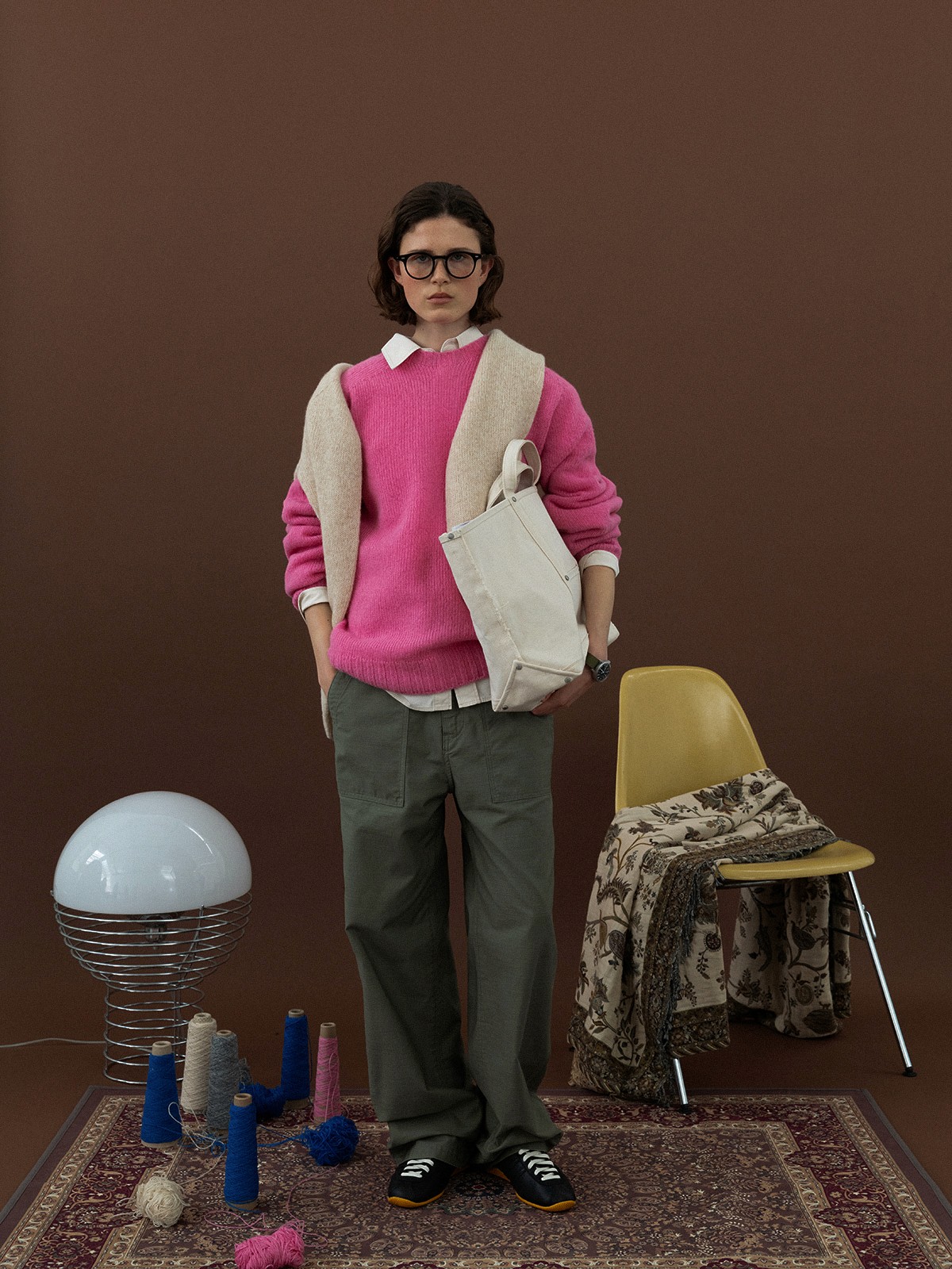 워크웨어의 정수와 가을의 깊이를 느낄 수 있는 색 위주의 컬렉션 사이 눈에 띄는 포인트를 발견할 수 있었어요. 선명한 핑크와 블루를 활용한 홀가먼트 스웨터가 바로 그 주인공이죠. 컬렉션 전반의 통일감을 해칠까 제작을 망설이기도 했지만, 가을철 레이어링의 재미를 더욱 크게 전달하고픈 마음이 더욱 커 과감히 시도하게 됐다고 해요.