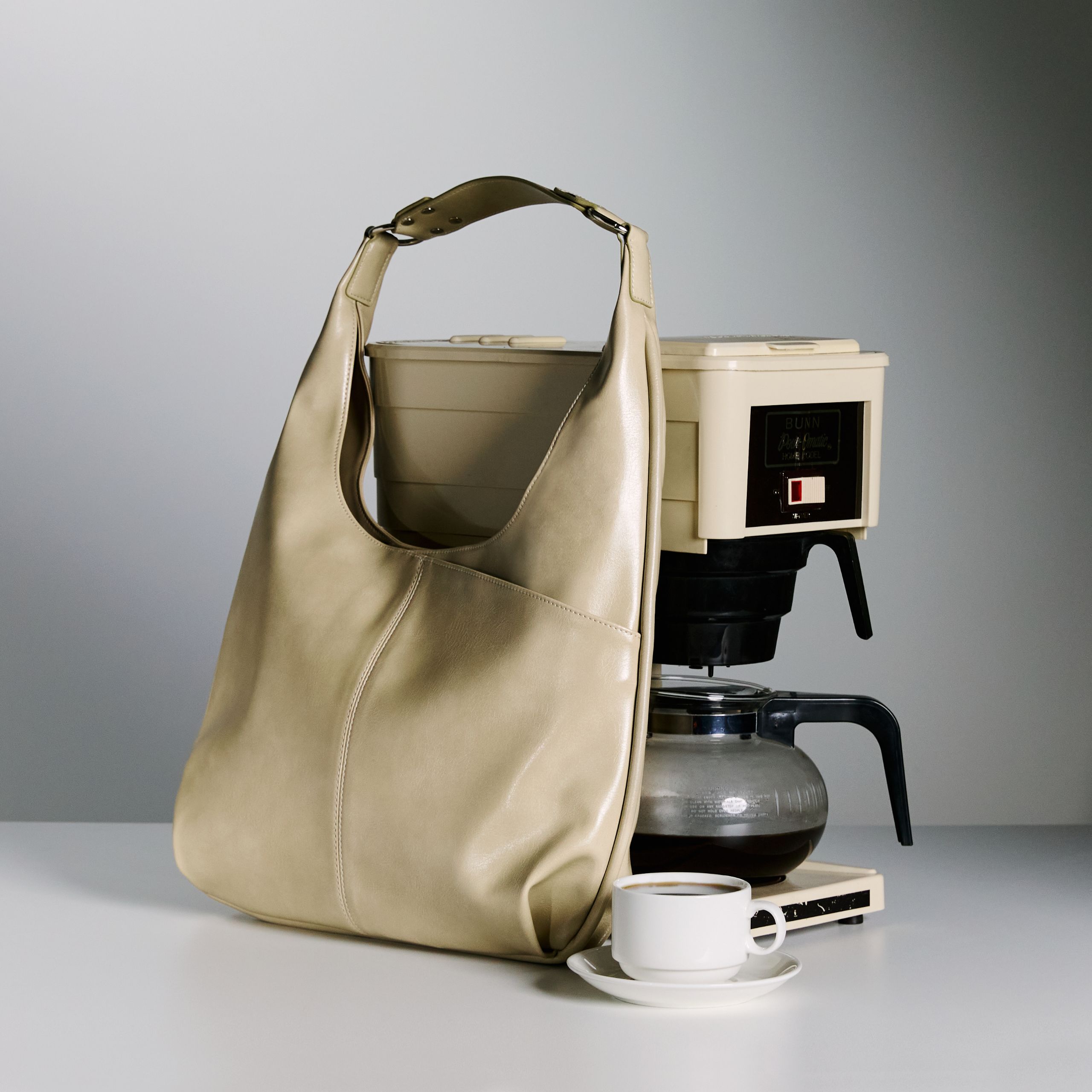 메탈 오링과 스터드 핸들이 돋보이는 호보백. 넉넉한 수납력과 튼튼하고 넓은 어깨 스트랩으로 편안함을 더했어요.