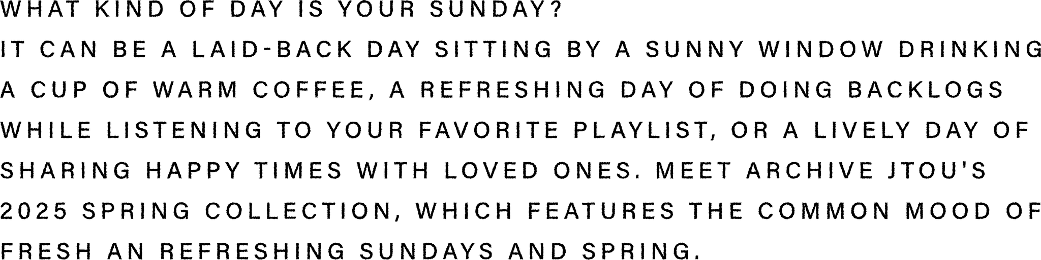 햇살이 비치는 창가에 앉아 따뜻한 커피 한 잔을 마시는 느긋한 하루가 될 수도 있고, 애정하는 플레이리스트를 들으며 밀린 빨래를 하는 상쾌한 하루가 될 수도 있고, 사랑하는 사람들과 행복한 시간을 공유하는 활기찬 하루가 될 수도 있습니다. 싱그럽고 상쾌한 일요일과 봄의 공통적인 무드를 담은 아카이브 제이투유의 2025 봄 컬렉션을 만나보세요.