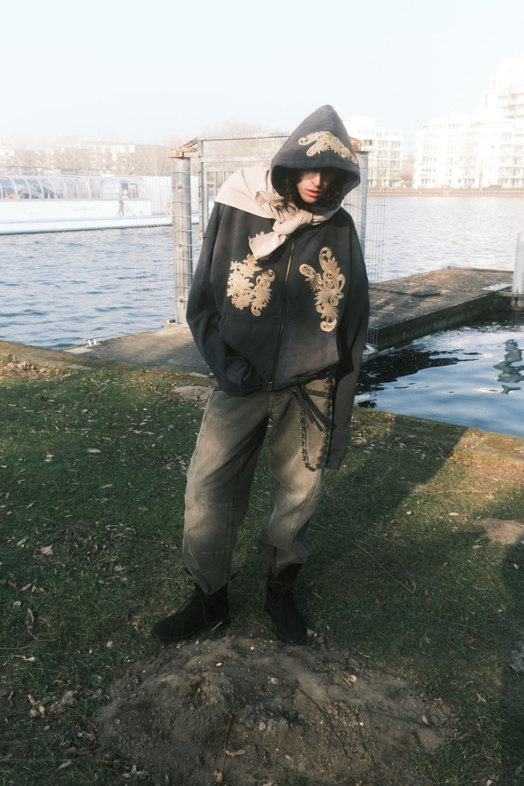 대미지 워싱과 빈티지 브러시 가공을 적용한 독특한 질감