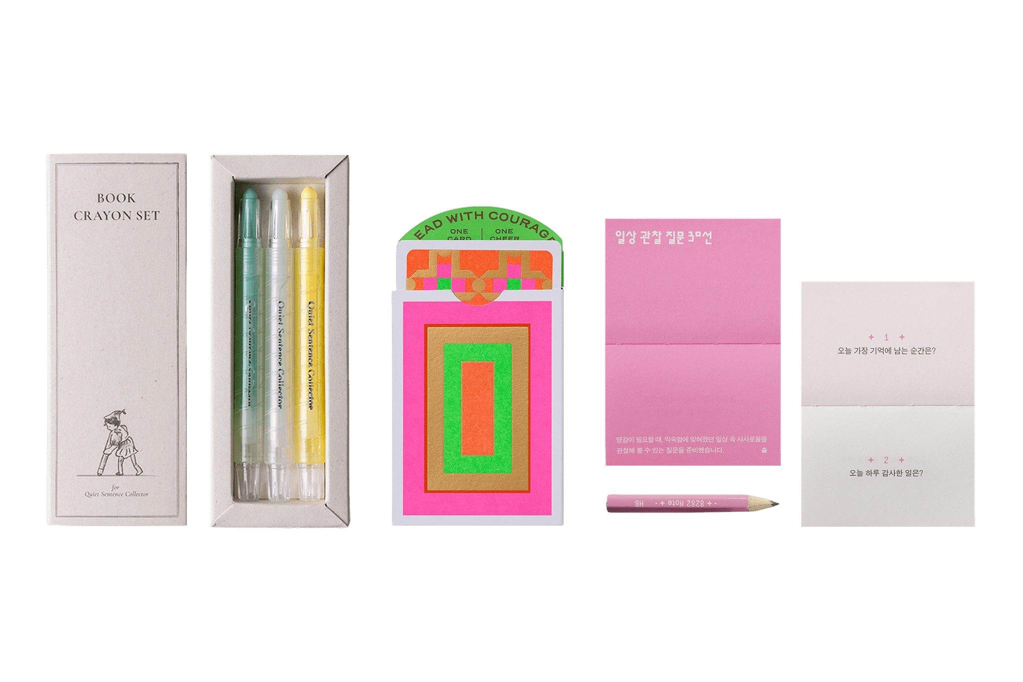 책을 읽다가 어느 한 구절이 내게 다가옵니다. 버스를 타고 가다가 마음을 물들이는 순간의 감정에 멍해지기도 하고, 매일이 최선인 나와 친구의 어깨를 오늘만큼은 토닥여주고 싶기도 해요. 나를 스치는 모든 일상 속에서 색연필과 노트 그리고 응원 카드가 당신의 마음을 표현해 줄 거예요. 문구를 좋아하는 3인과 대표 문구 브랜드가 선보이는 특별한 협업 제품을 만나세요.