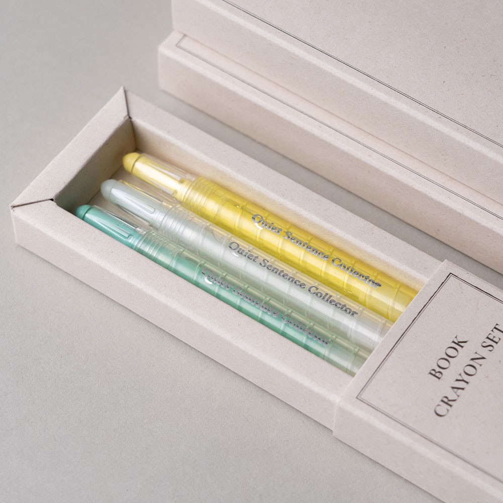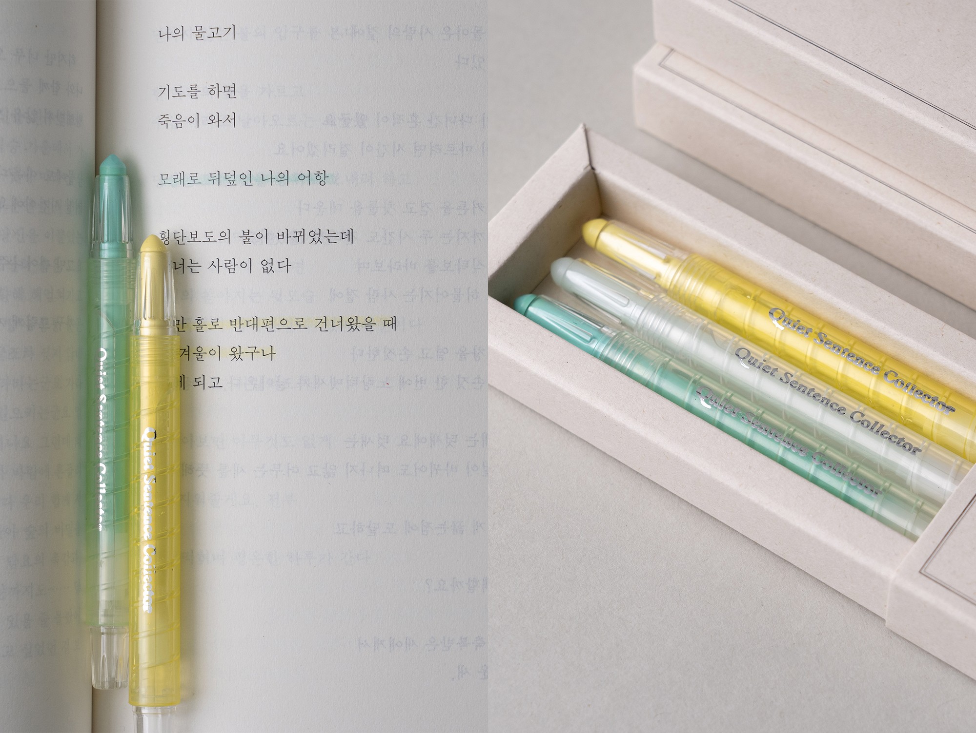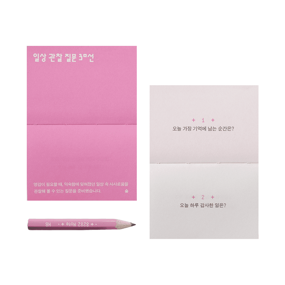 문구를 사랑하는 3인이 대표 문구 브랜드와 매일 함께하기 좋은 아이템을 선보입니다. 휴대하기 편한 아담한 길이의 색연필과 어디서든 쉽게 꺼내어 기록할 수 있는 노트 그리고 매일 한 문장씩 전하기 좋은 응원 카드까지. 당신의 순간을 특별하게 간직해 보세요.