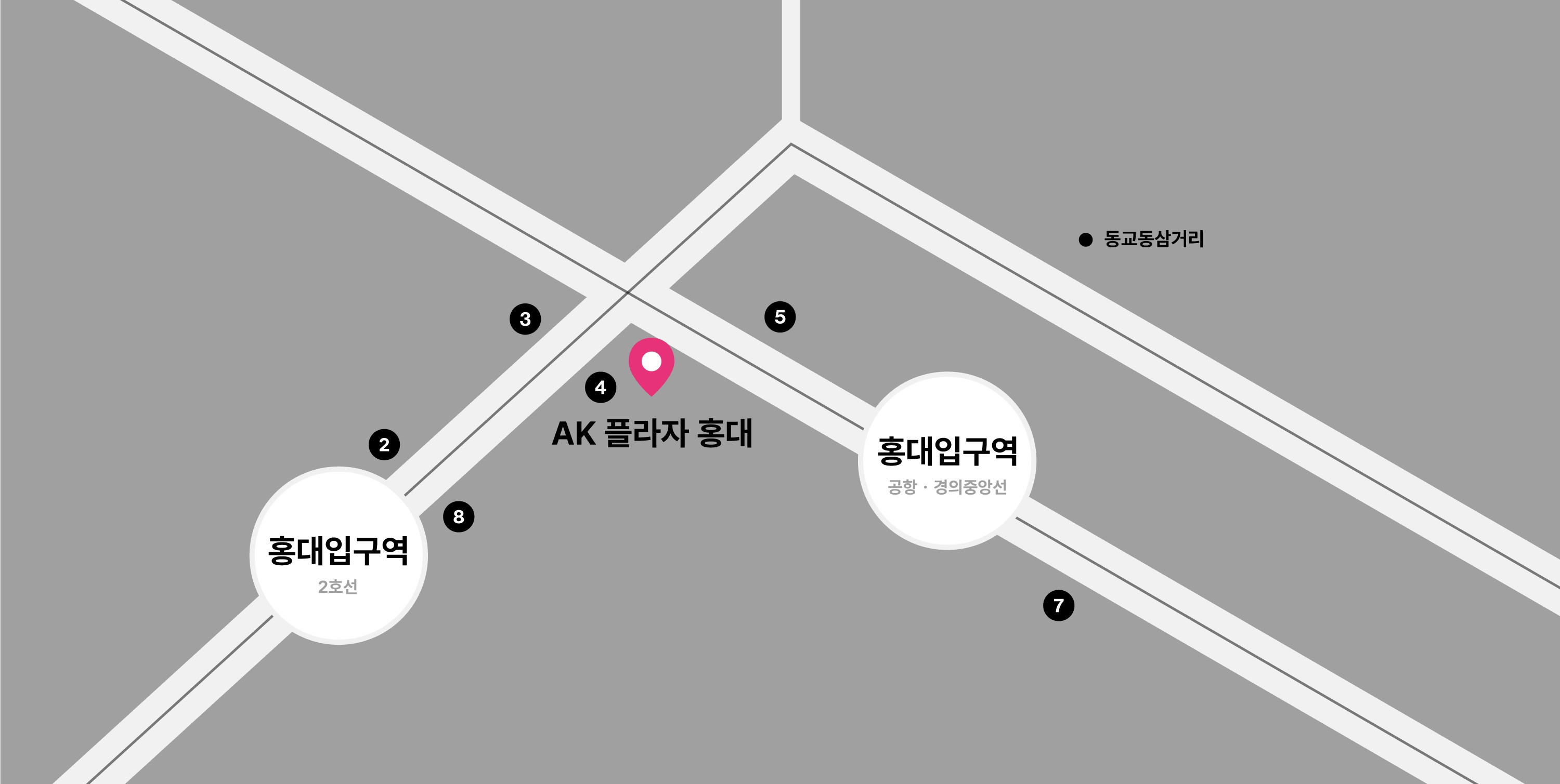 공항철도 홍대입구역 4번 출구, 지하철 2호선 홍대입구역 8번 출구에서 동교동 삼거리 방면 150M 직진