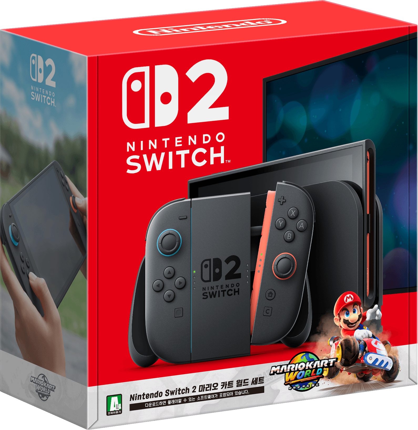 패키지 구성품 : Nintendo Switch 2 본체, Nintendo Switch 2 독, Joy-Con 2, Joy-Con 2 그립, Joy-Con 2 스트랩, HDMI 케이블, Nintendo Switch 2 AC 어댑터, USB-C 충전 케이블, 마리오 카트 월드 다운로드 버전