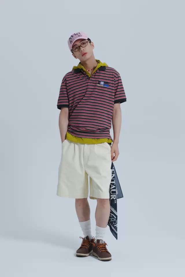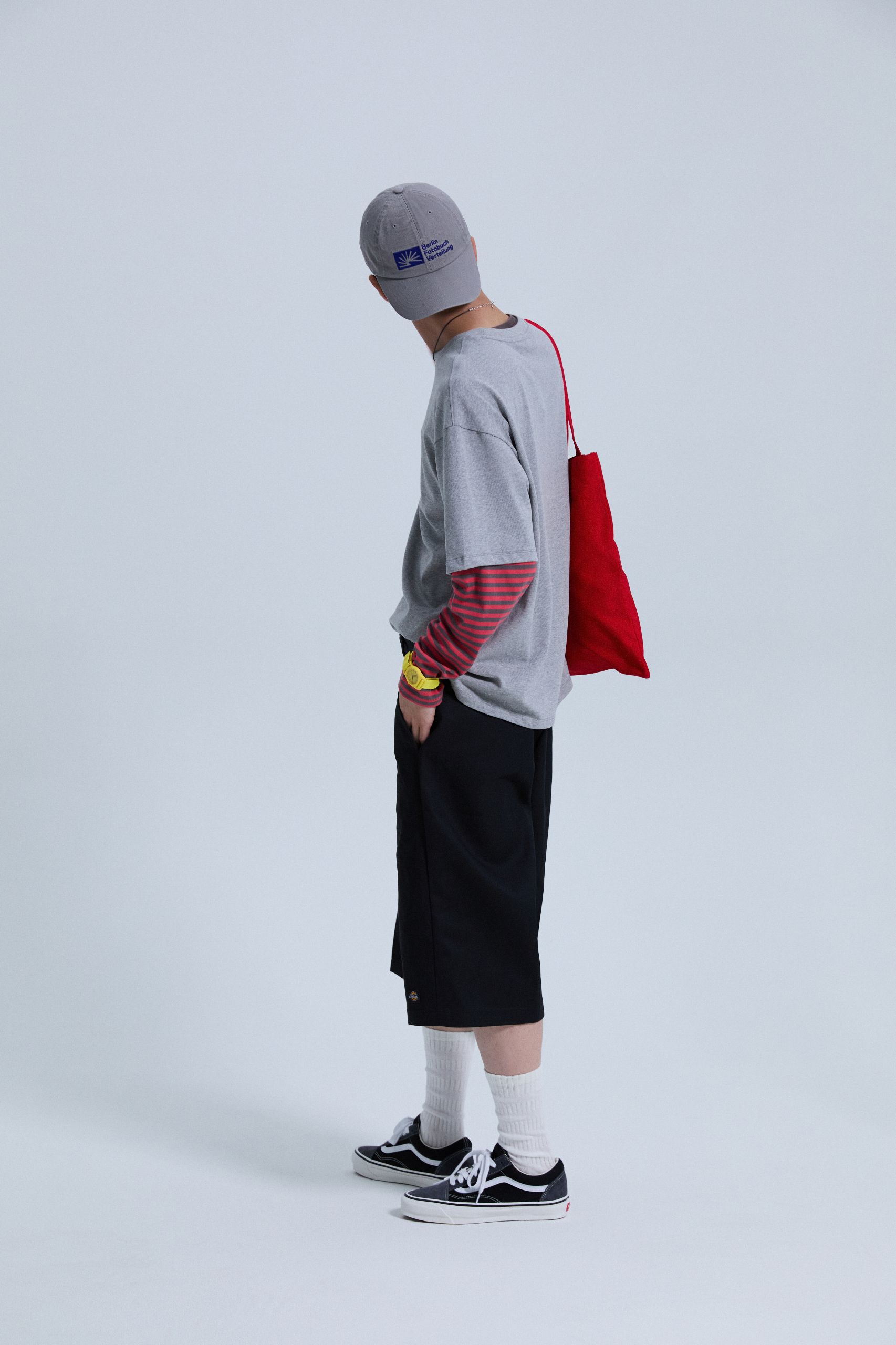 볼캡은 뒤로 쓰고, 반소매 티셔츠 안에 긴 소매를 레이어드해 장난기 있는 룩을 완성했어요. 이너 티셔츠와 톤을 맞춘 백으로 포인트를 더하고, 볼캡과 티셔츠, 쇼츠는 모노톤으로 무게감을 더했어요.