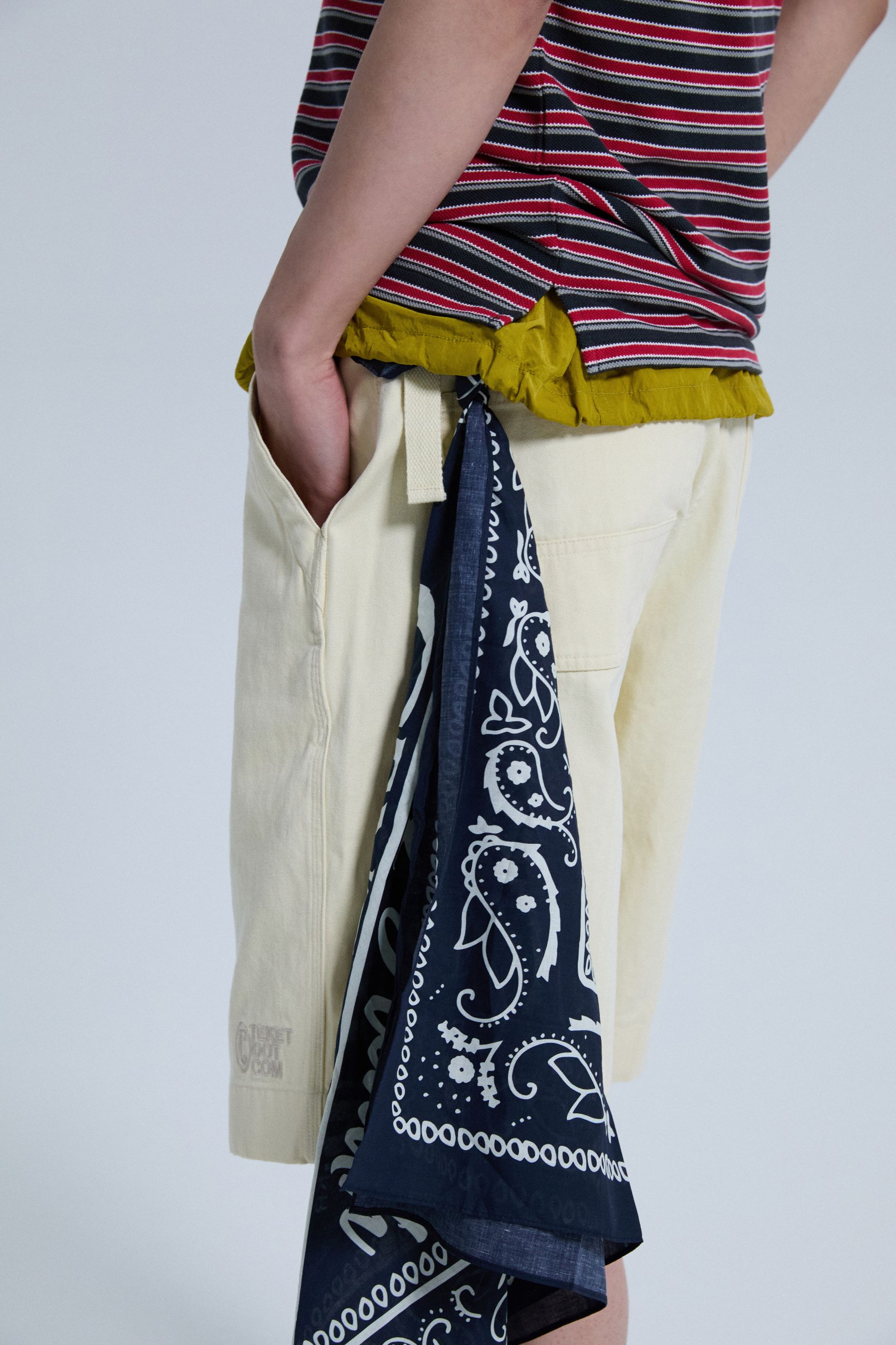 코튼 쇼츠에 반다나, 트레킹 부츠를 더해 아웃도어 감성을 더했어요.