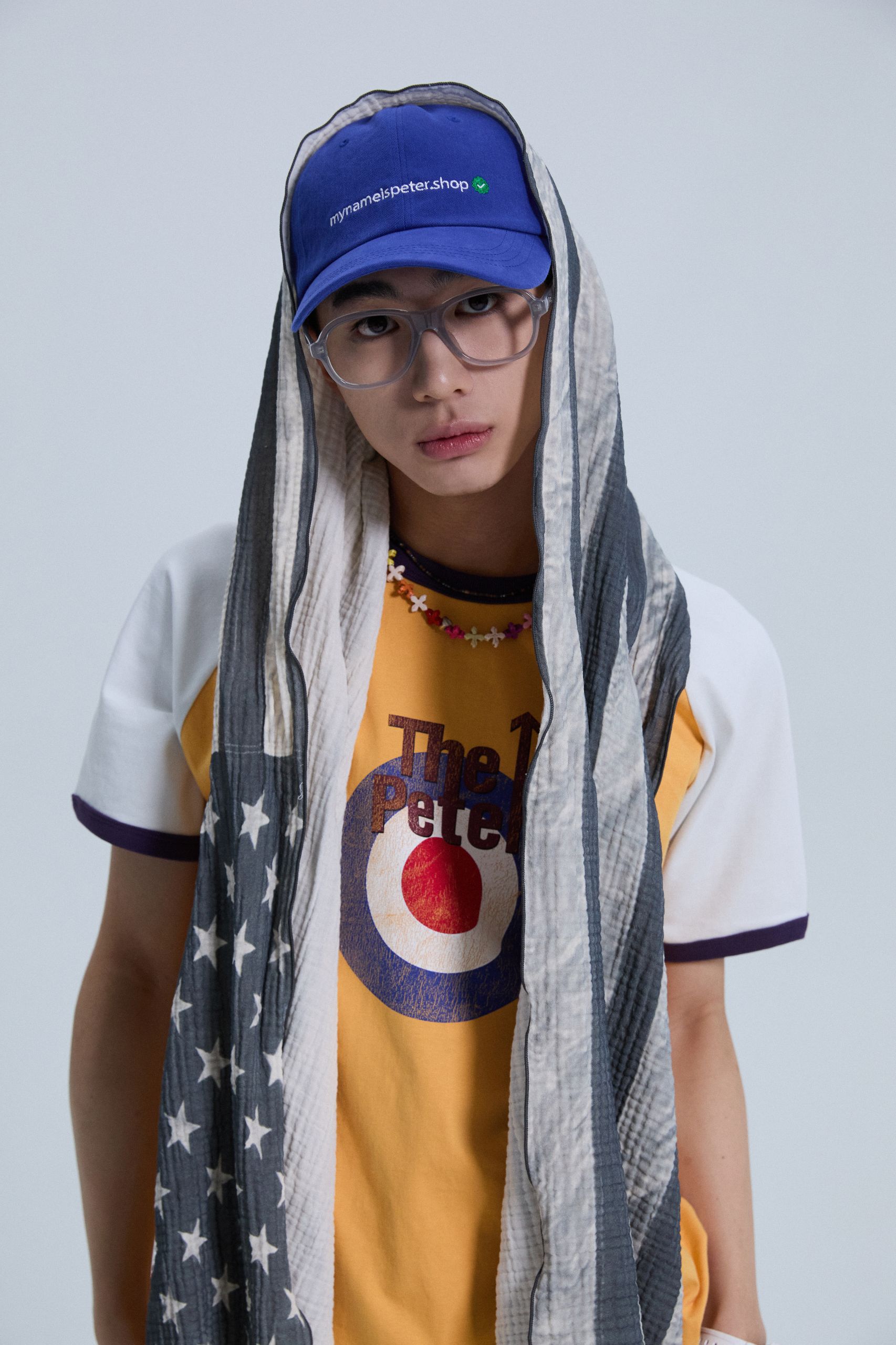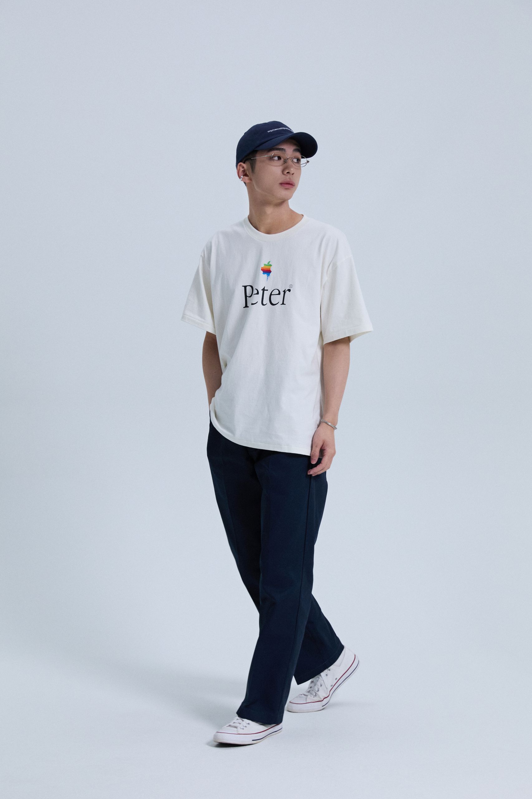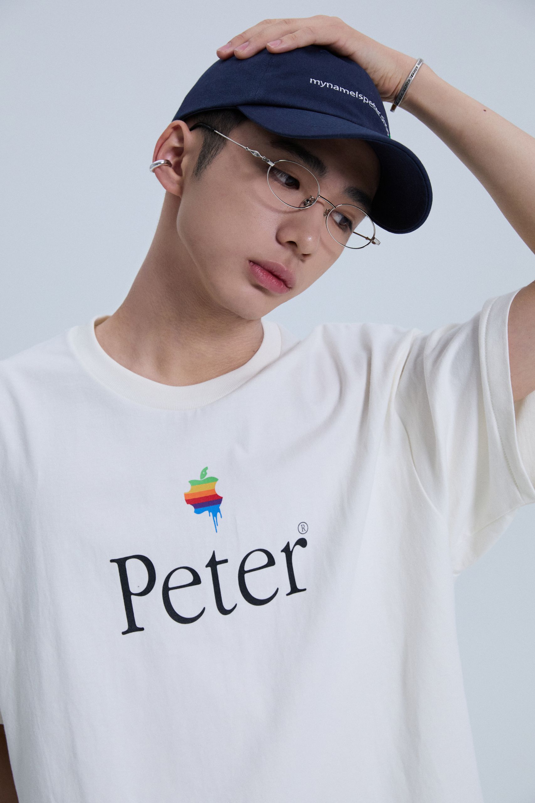 흰색 티셔츠에 면 팬츠는 베이직의 대명사죠? 은색으로 통일한 액세서리로 특별함도 잊지 않았어요. 티셔츠의 '피터' 프린팅으로 볼캡의 메시지가 더욱 강조될 수 있어요.