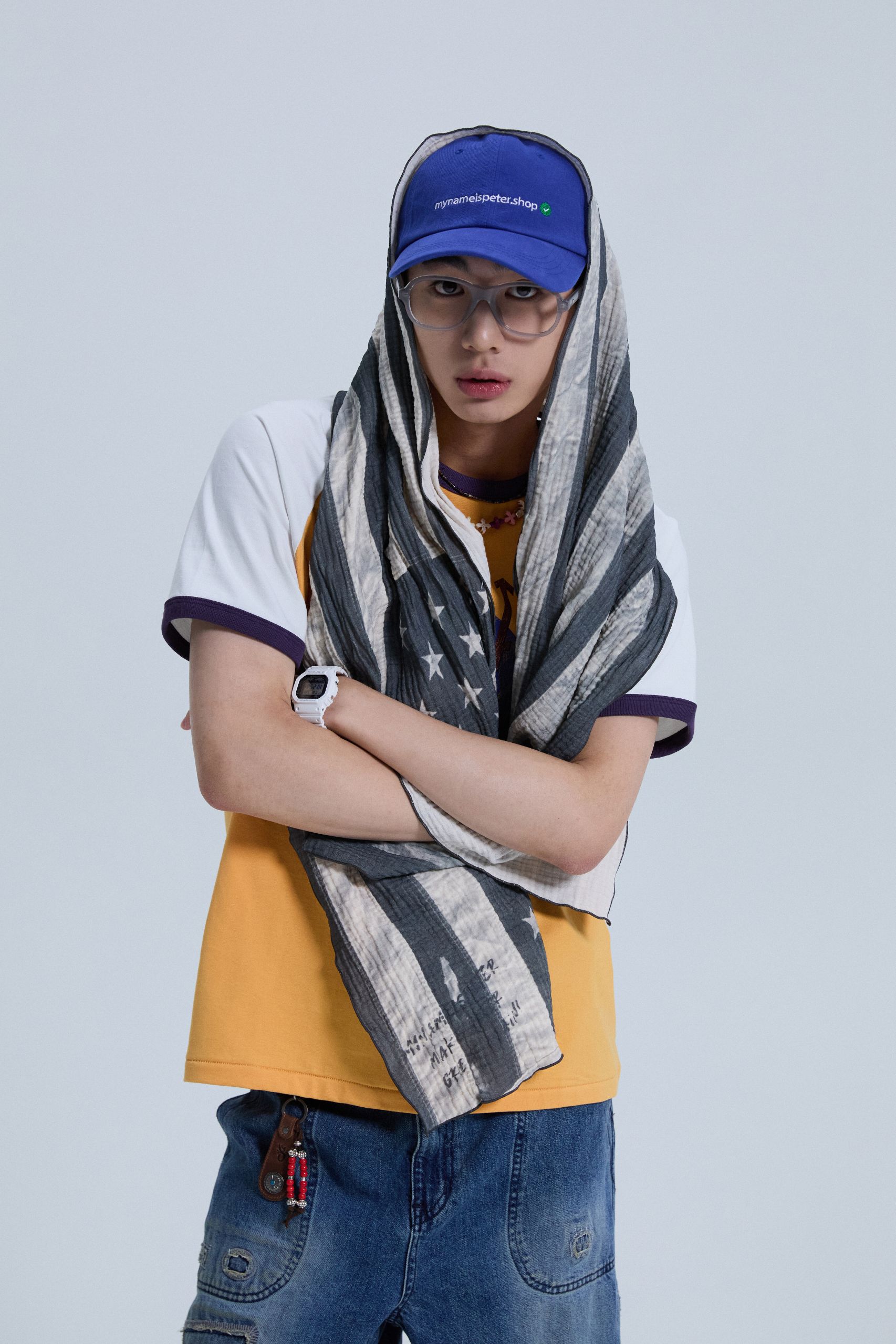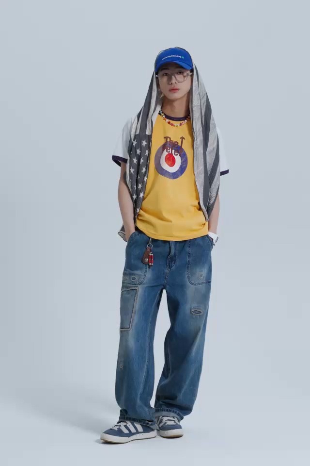 레트로 프린트가 눈에 띄는 링거 티셔츠와 다양한 액세서리로 화려하게 연출하되, 볼캡과 데님, 신발은 파란색 계열로 통일해 안정감을 더했어요.