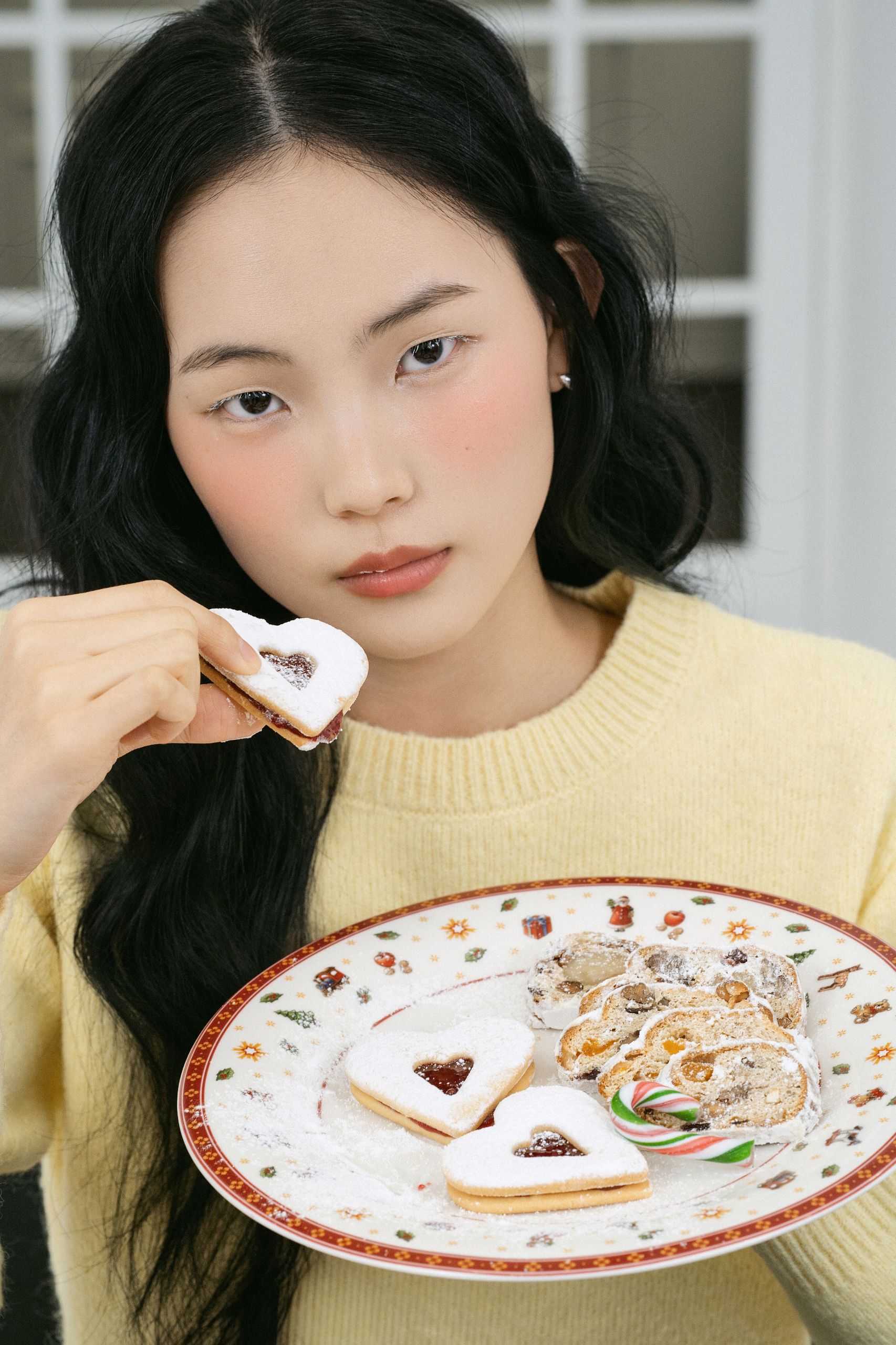 접시 위 눈송이 쿠키들이