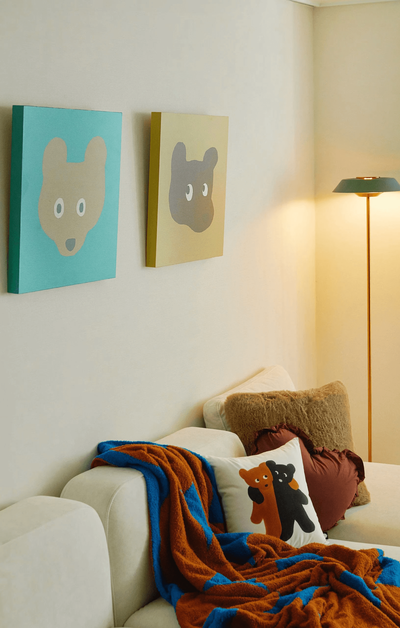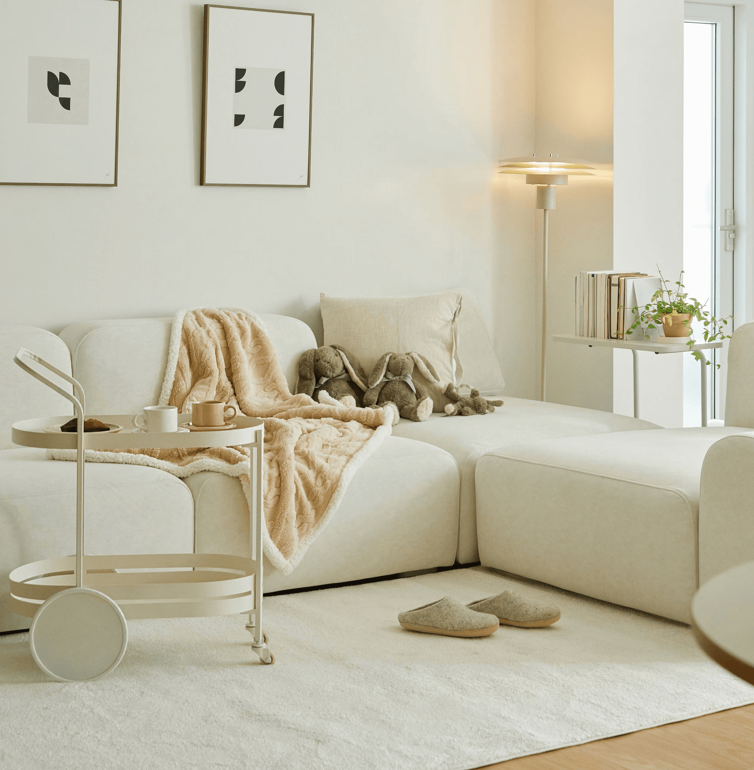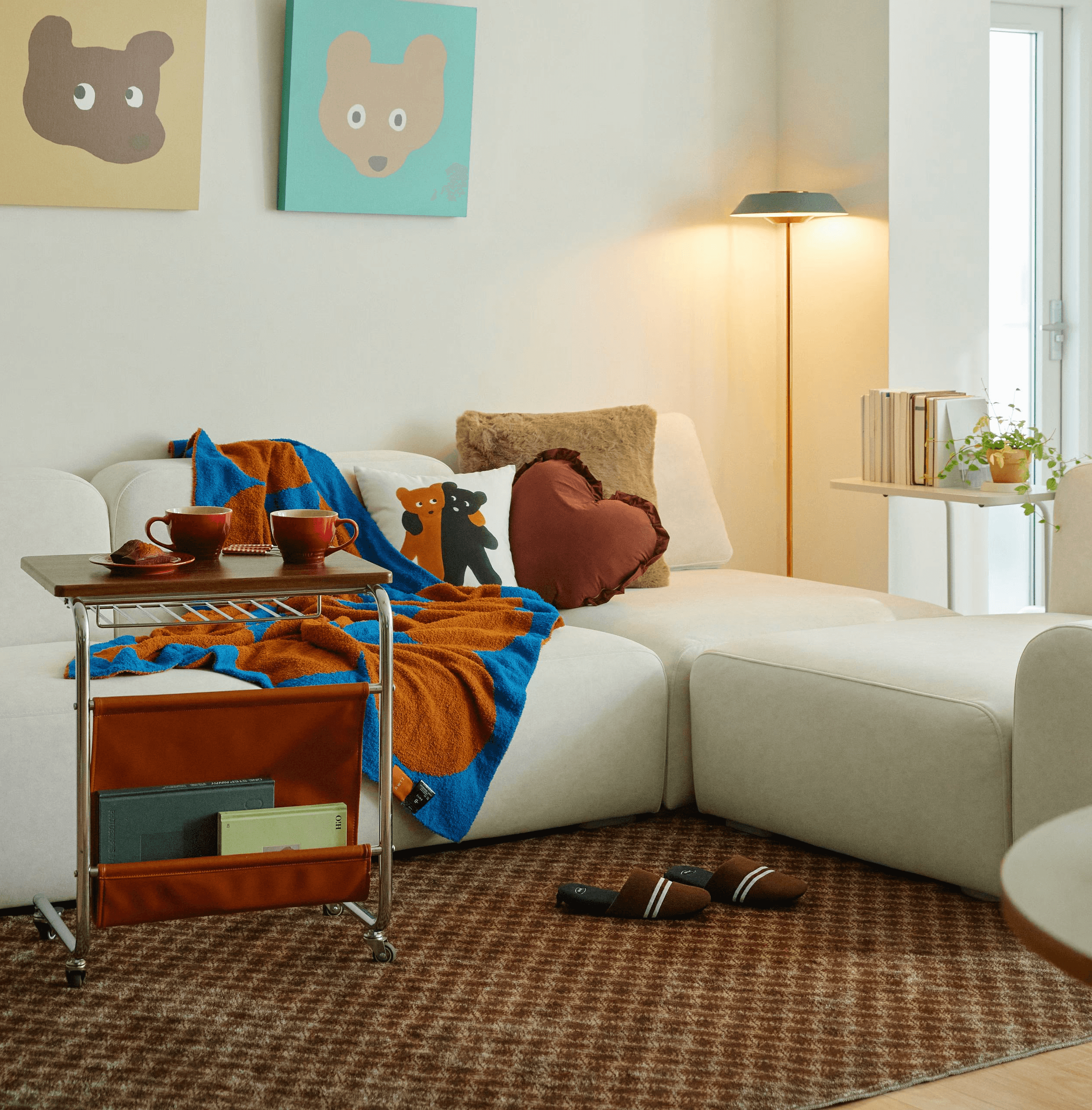 TV를 볼 때에도, 이야기를 나눌 때에도, 온기가 가득했으면 좋겠어요. 포근한 러그와 룸 슬리퍼로 플로어를, 블랭킷과 쿠션으로 소파 위를 따뜻하게 채워보세요.