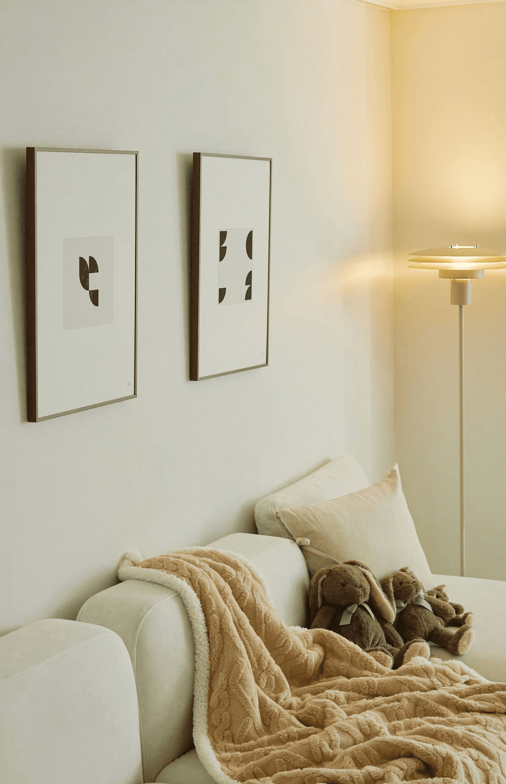 소파 옆에 플로어 램프를 하나 두면 좀 더 아늑하면서도 포근한 무드를 만들 수 있어요. 소파 위쪽으로도 취향에 맞는 액자를 걸어보세요. 감각적인 분위기 연출이 가능합니다.