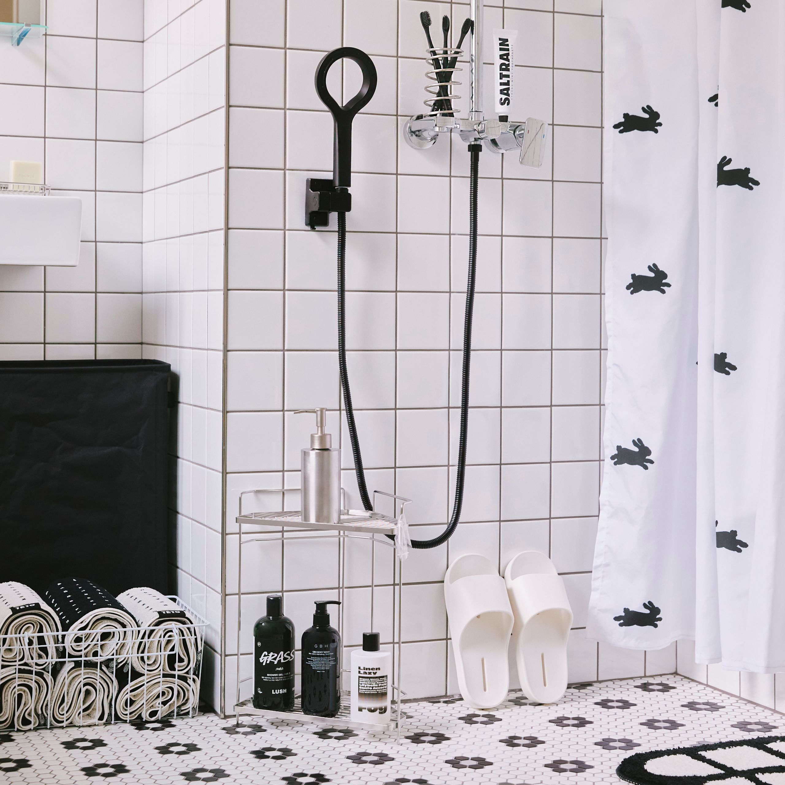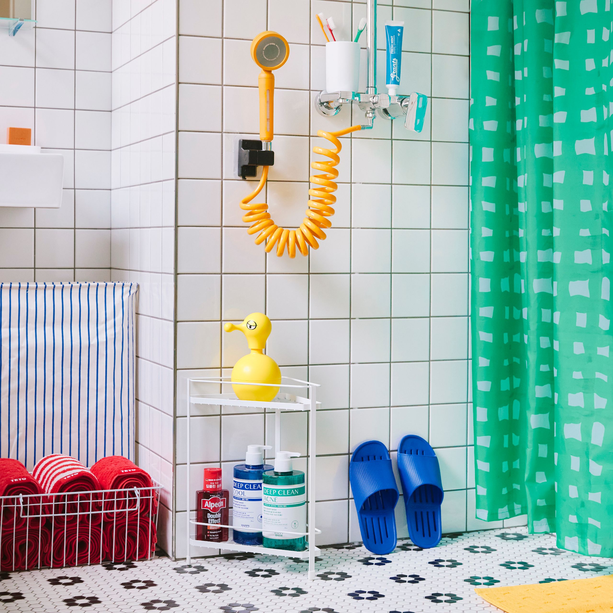 기능적으로도 필요하지만 보기에도 즐거울 샤워 커튼, 테마를 고려해 교체한 샤워기와 호스, 가능하다면 샴푸와 보디 워시 용품까지 컬러 팔레트를 통일해 보세요.