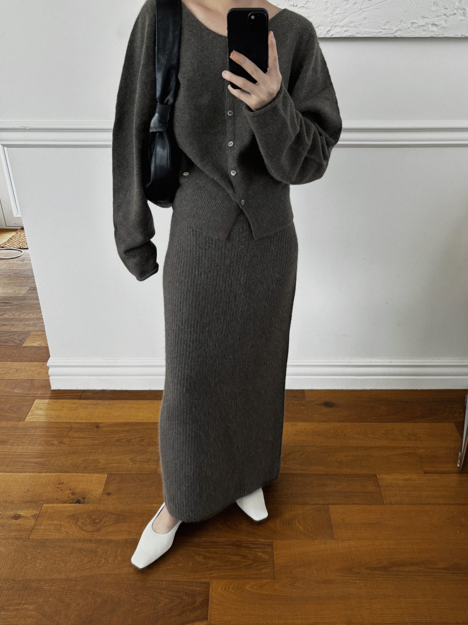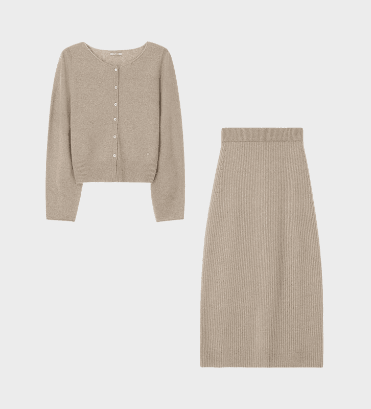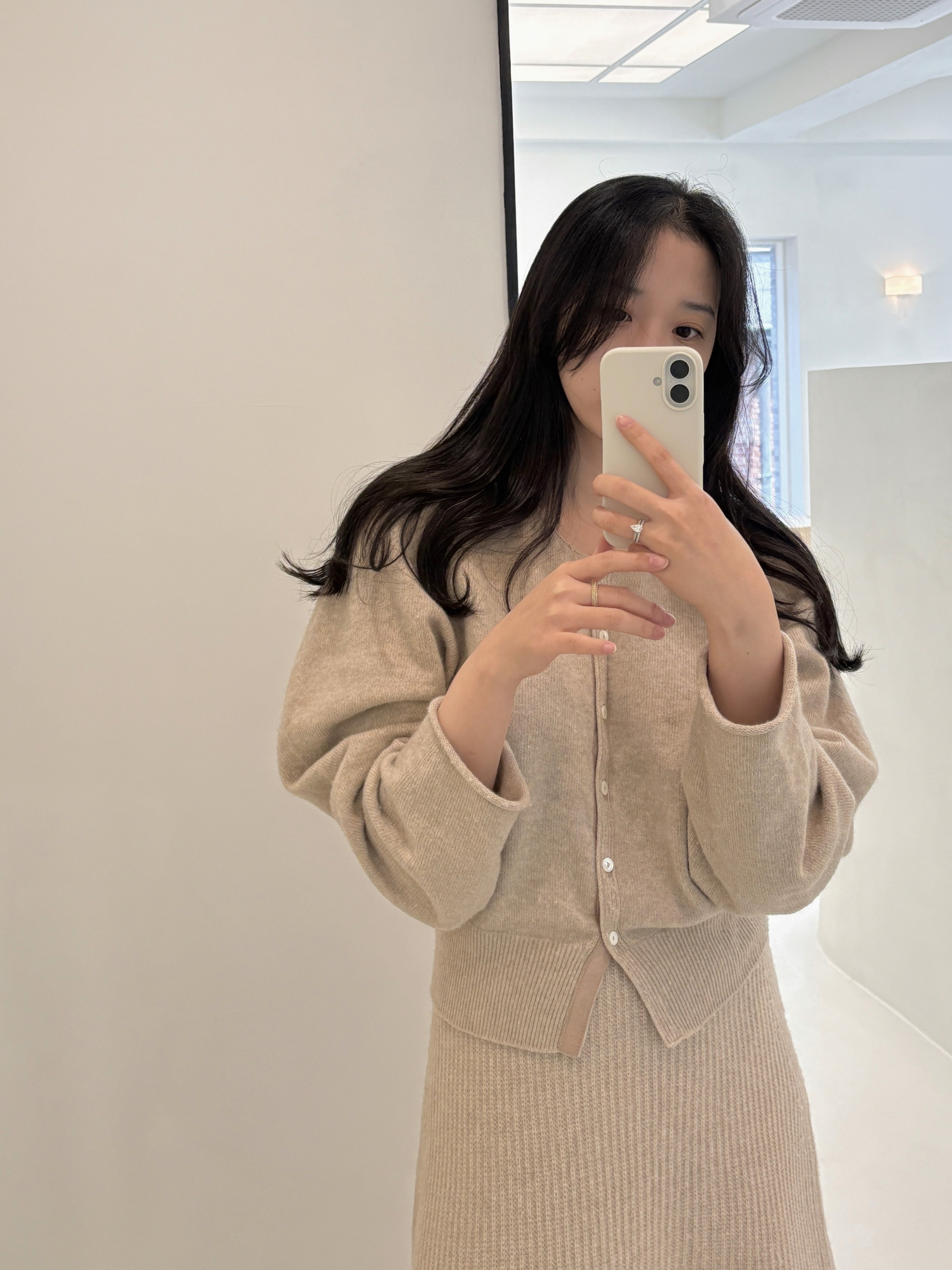 세련된 실루엣으로 고급스러움을 더한 니트 셋업입니다. 단품으로도, 한 벌로도 활용 가능하며 차분한 샌드베이지와 케일브라운 컬러가 돋보이는 아이템입니다.