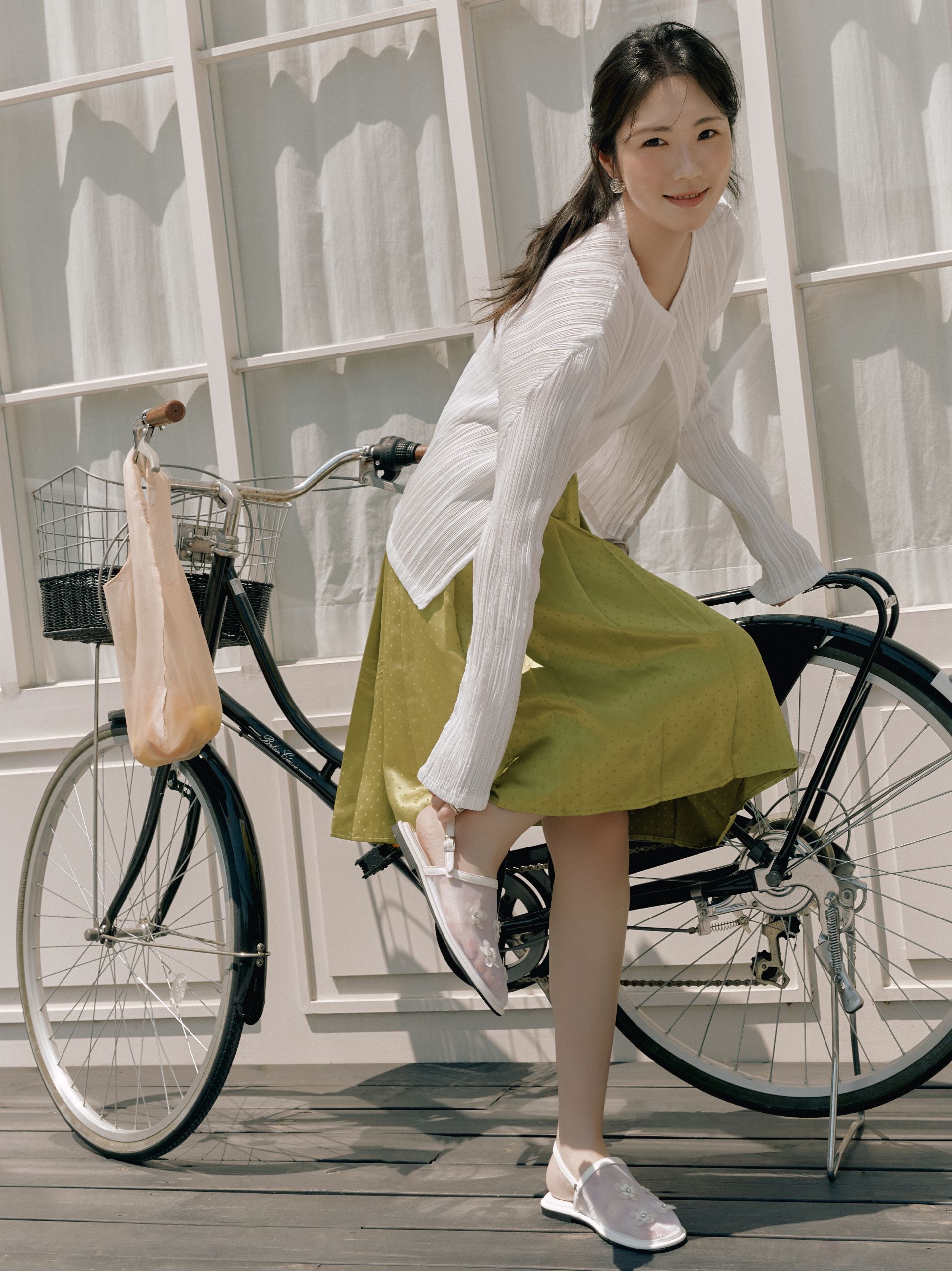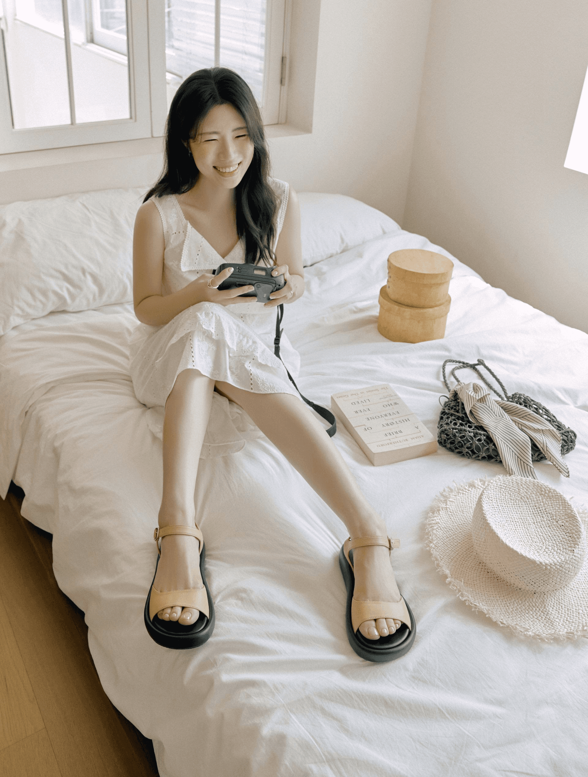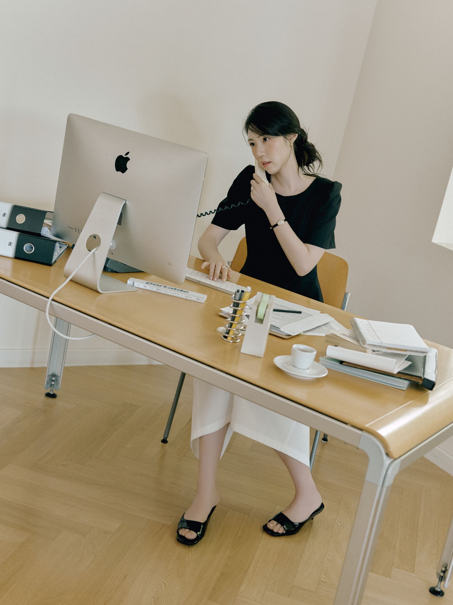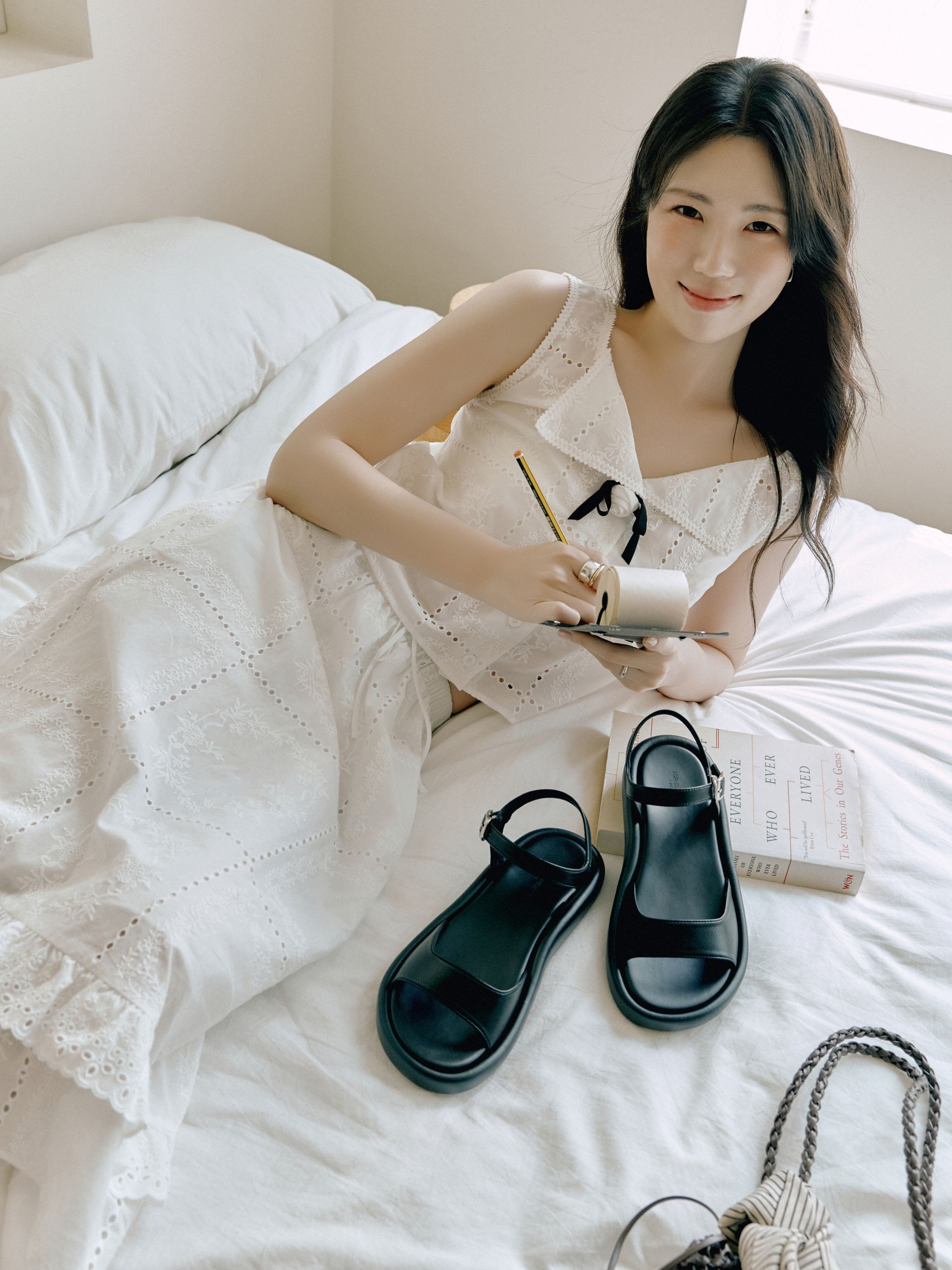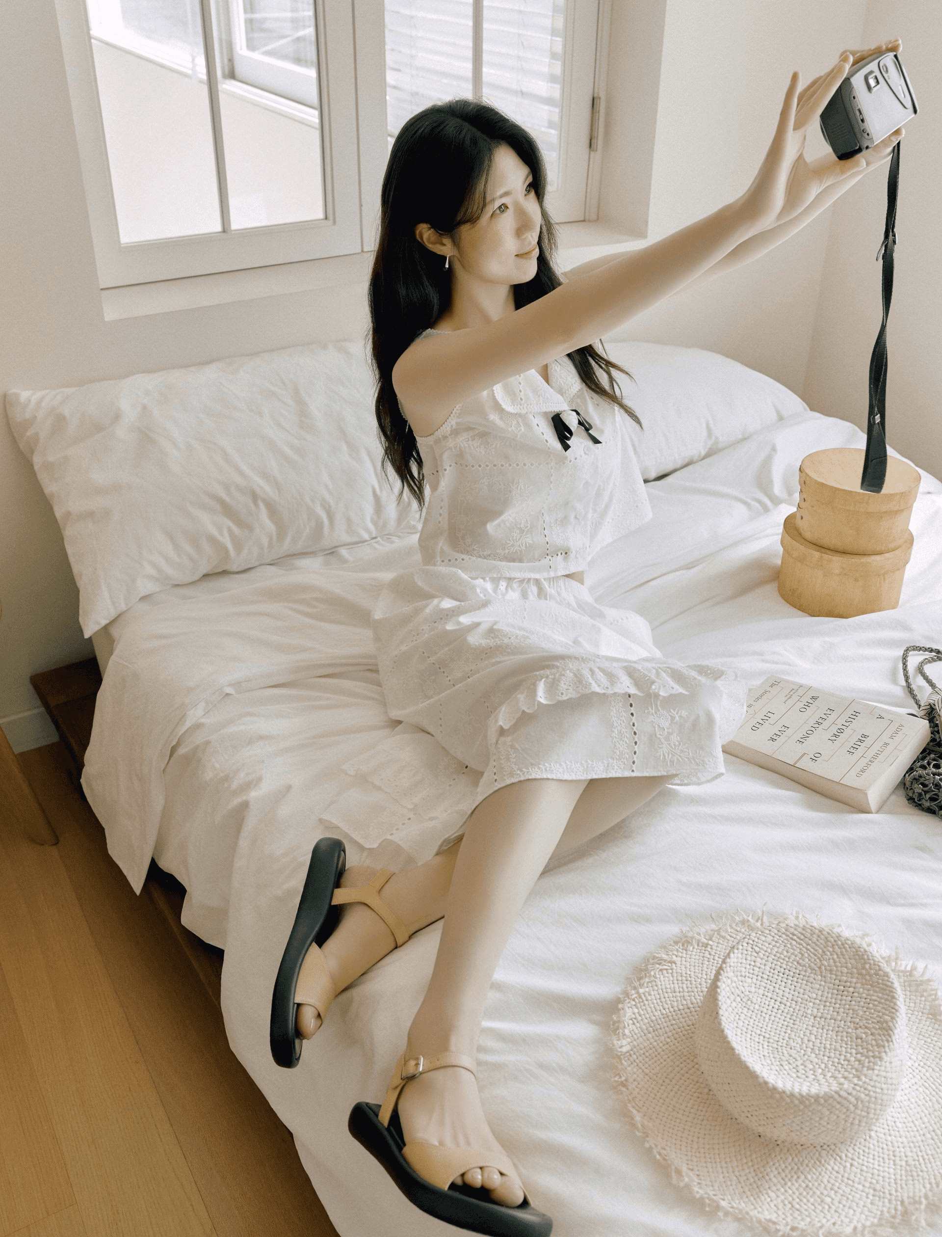 여름 컬렉션인 만큼 데일리룩은 물론 휴양지에서도 어울리는 아이템들로 구성했어요. 2000년대 감성을 담은 클래식 디자인의 크루도 뮬은 룩의 완성도를 높여주고, 자르딘 플로르 샌들은 발끝까지 사랑스럽게 연출되어서 특히 애정하는 아이템이에요.