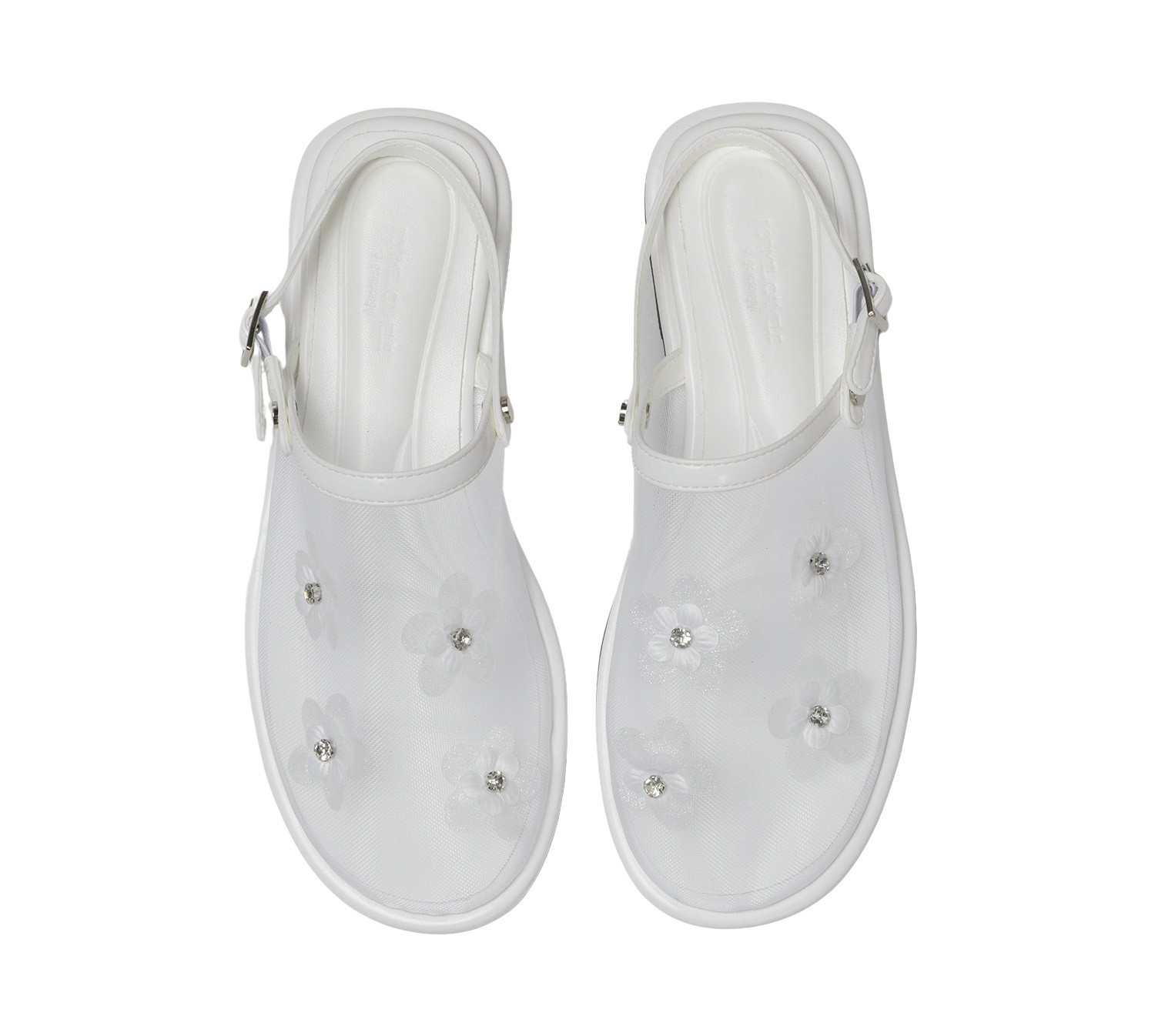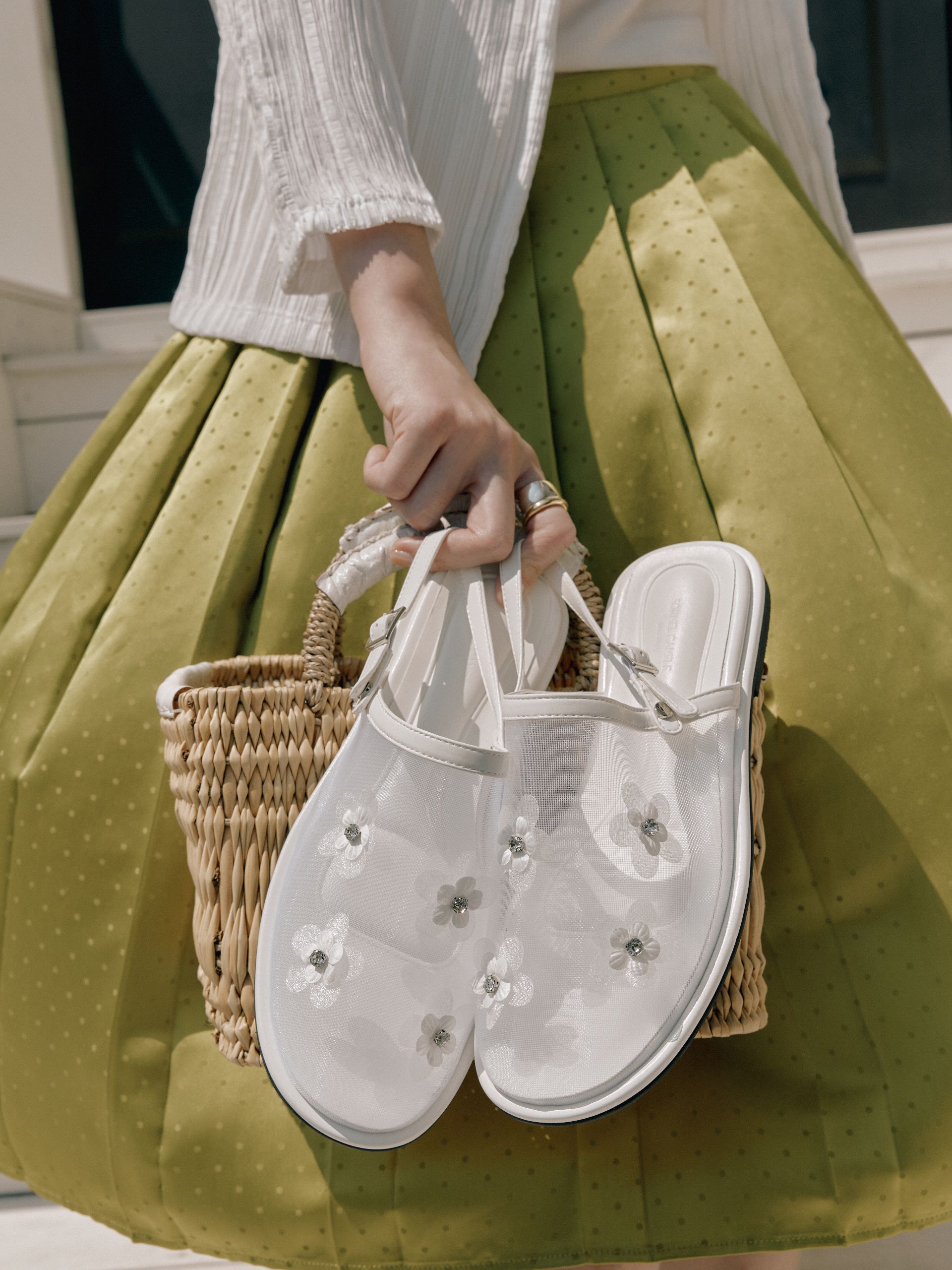 망사와 오간자 소재 꽃 장식의 뮬 슬링백