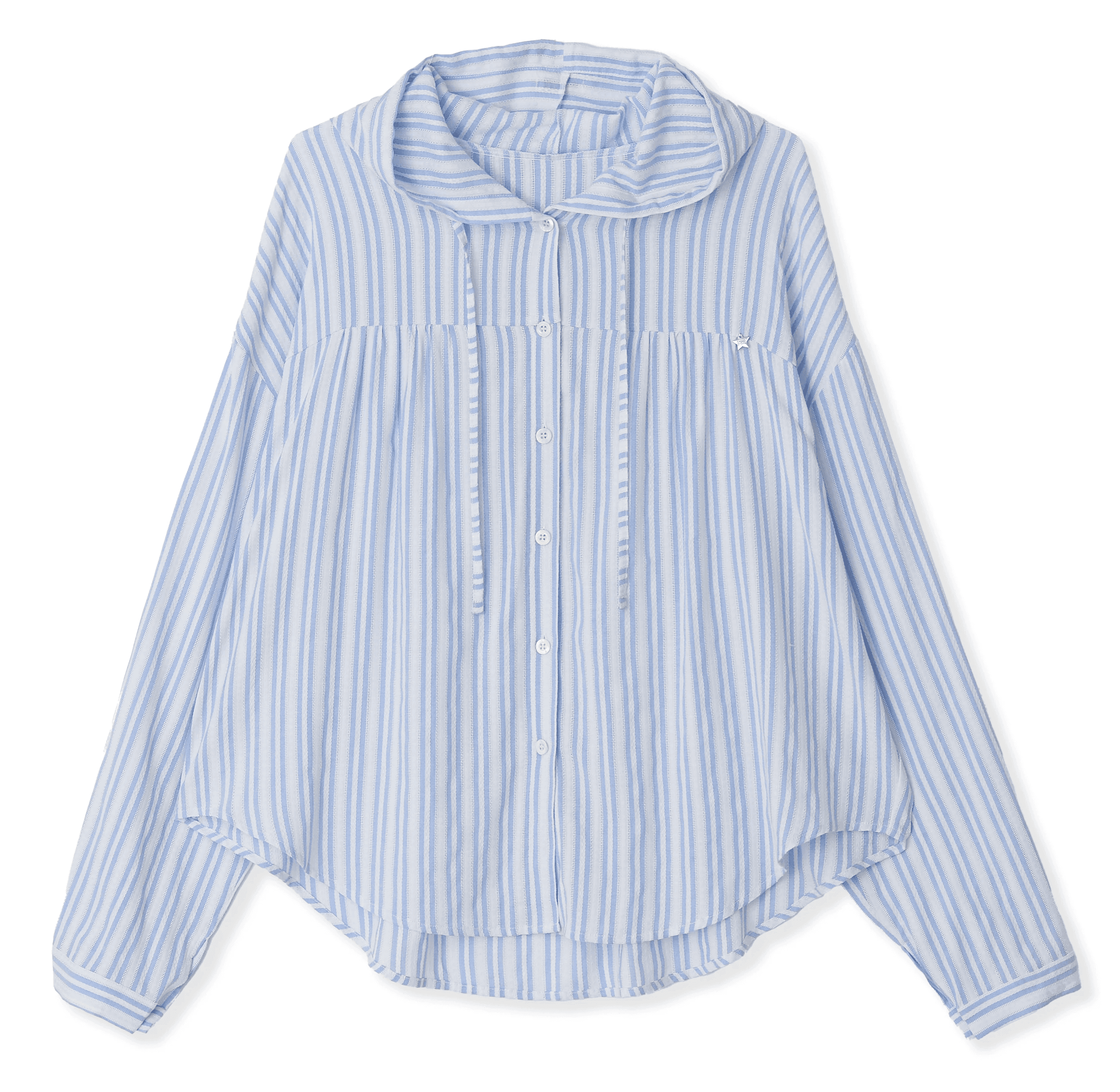 은은한 스트라이프 패턴의 후드 블라우스를 추천해요. 넉넉한 실루엣으로 캐주얼하게 스타일링하기 좋고, 무엇보다 아일렛 원단으로 제작되어 여름철 실내외 큰 일교차에 가볍게 걸치기 좋아요.