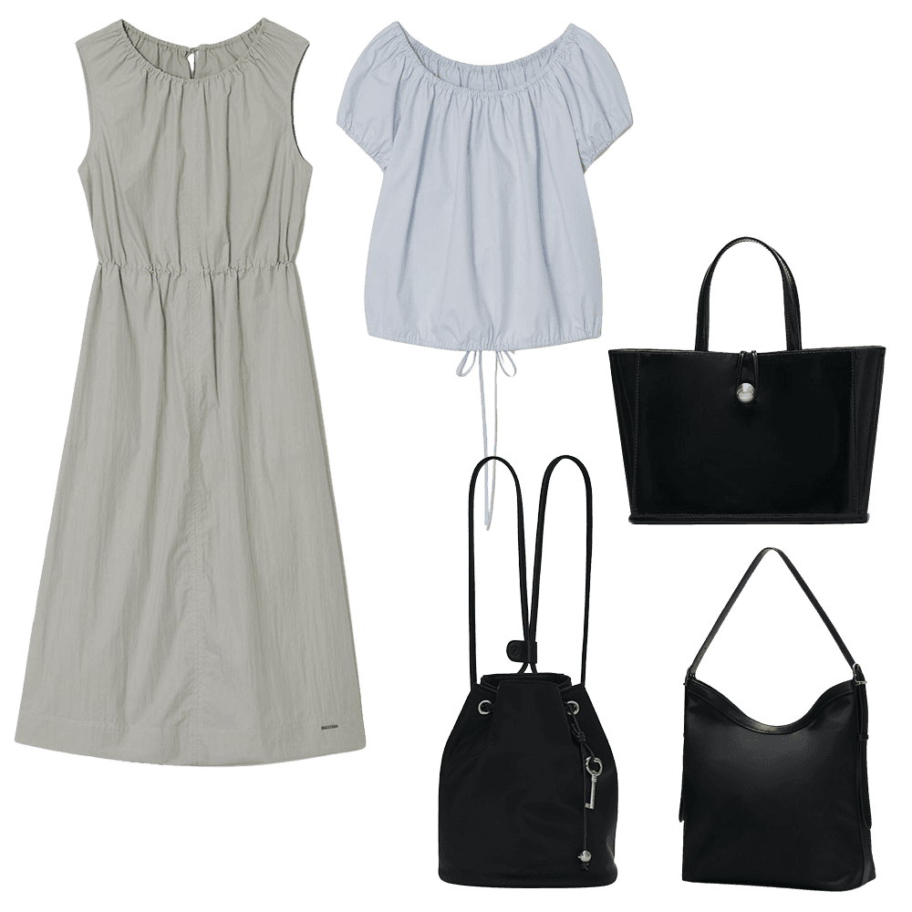 한여름에도 쾌적하게 착용 가능한 피그먼트 코튼 원단과 플리츠, 밴딩 디테일을 활용해 활동성이 뛰어나면서도 실루엣에 자연스러운 멋을 더했어요. 함께 선보이는 나일론 백은 생활 방수가 가능하며 가벼운 소재로 제작되어 데일리로 활용하기 좋아요.