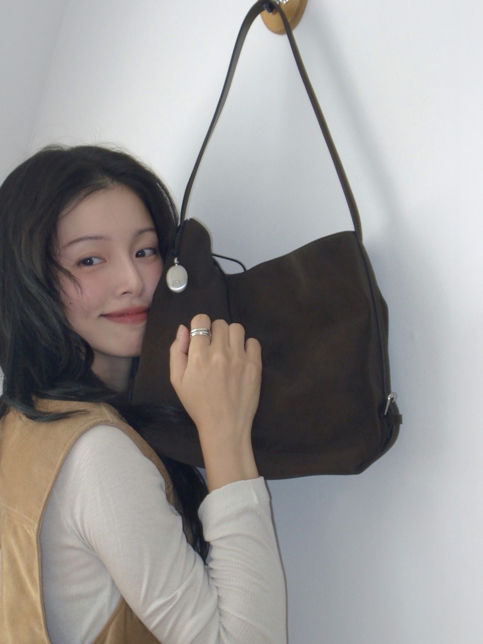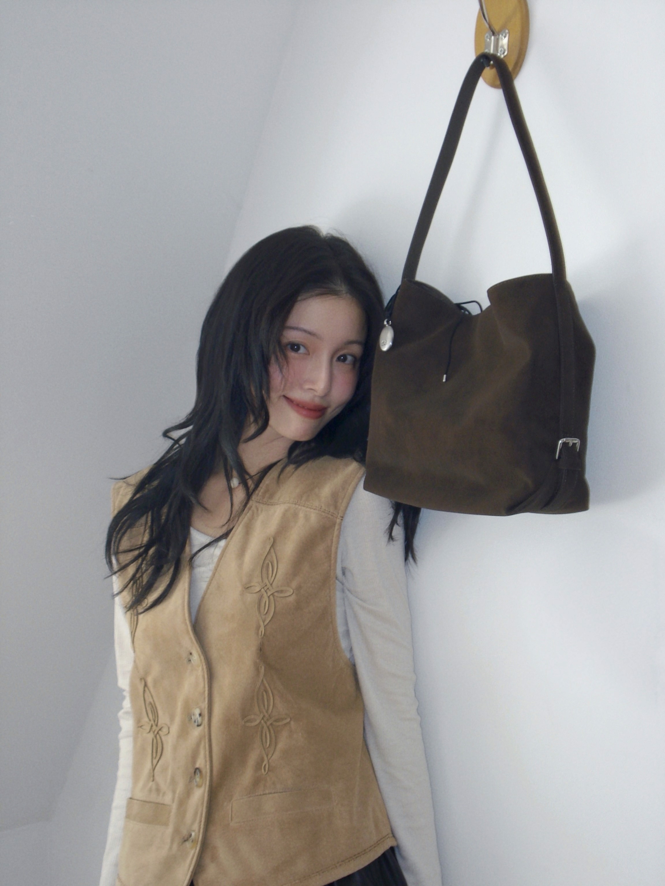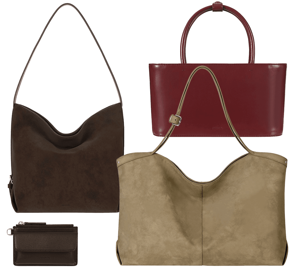 이번 컬렉션에서는 ‘미오 버킷백’이 가장 마음에 들어요. 특히 마론 컬러는 누벅 질감과 부드럽고 유연한 실루엣이 매력적이라 가을에 잘 어울릴 것 같아요. 수납도 넉넉하고, 벨트 디테일이 은은한 포인트를 더해주네요.