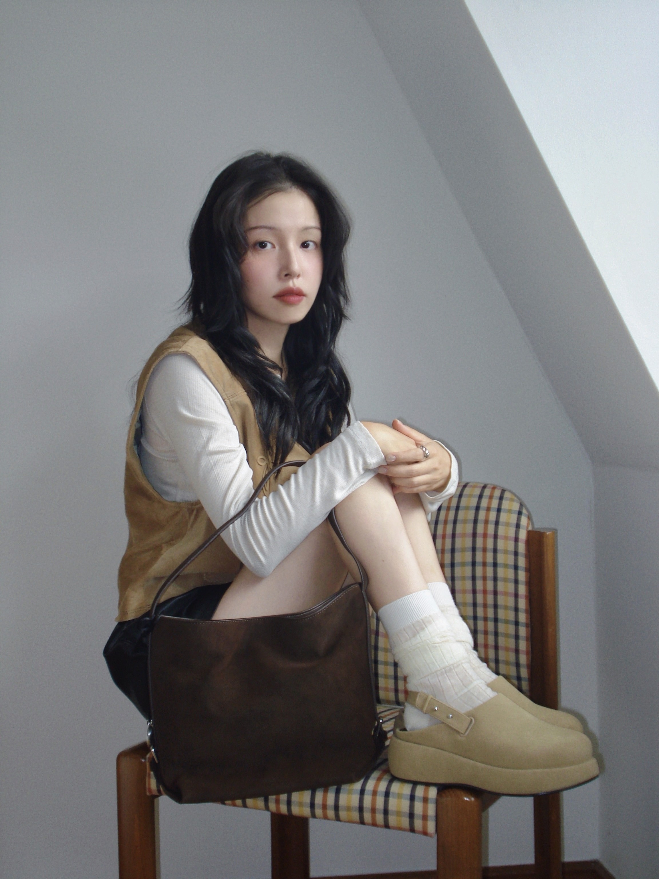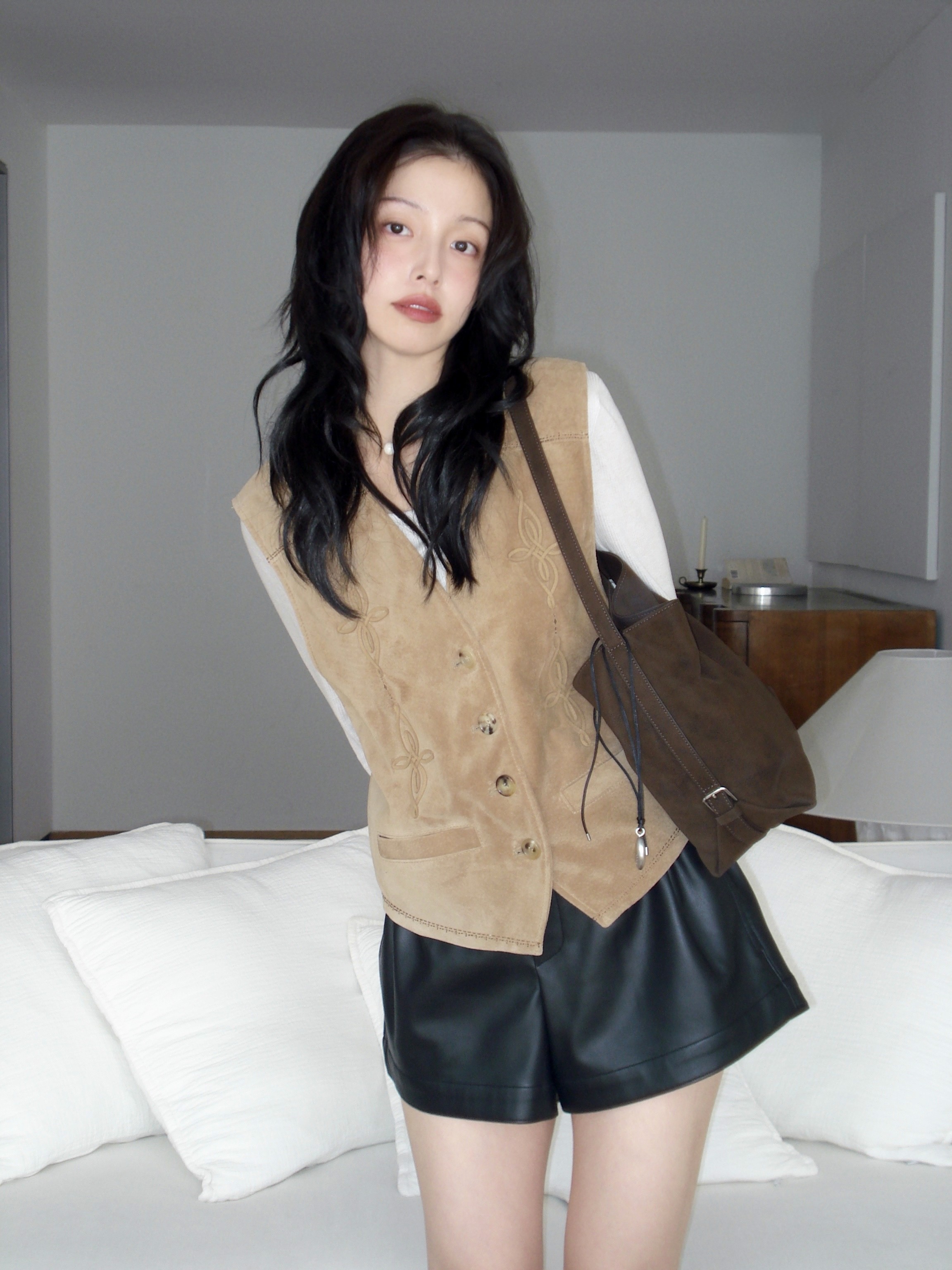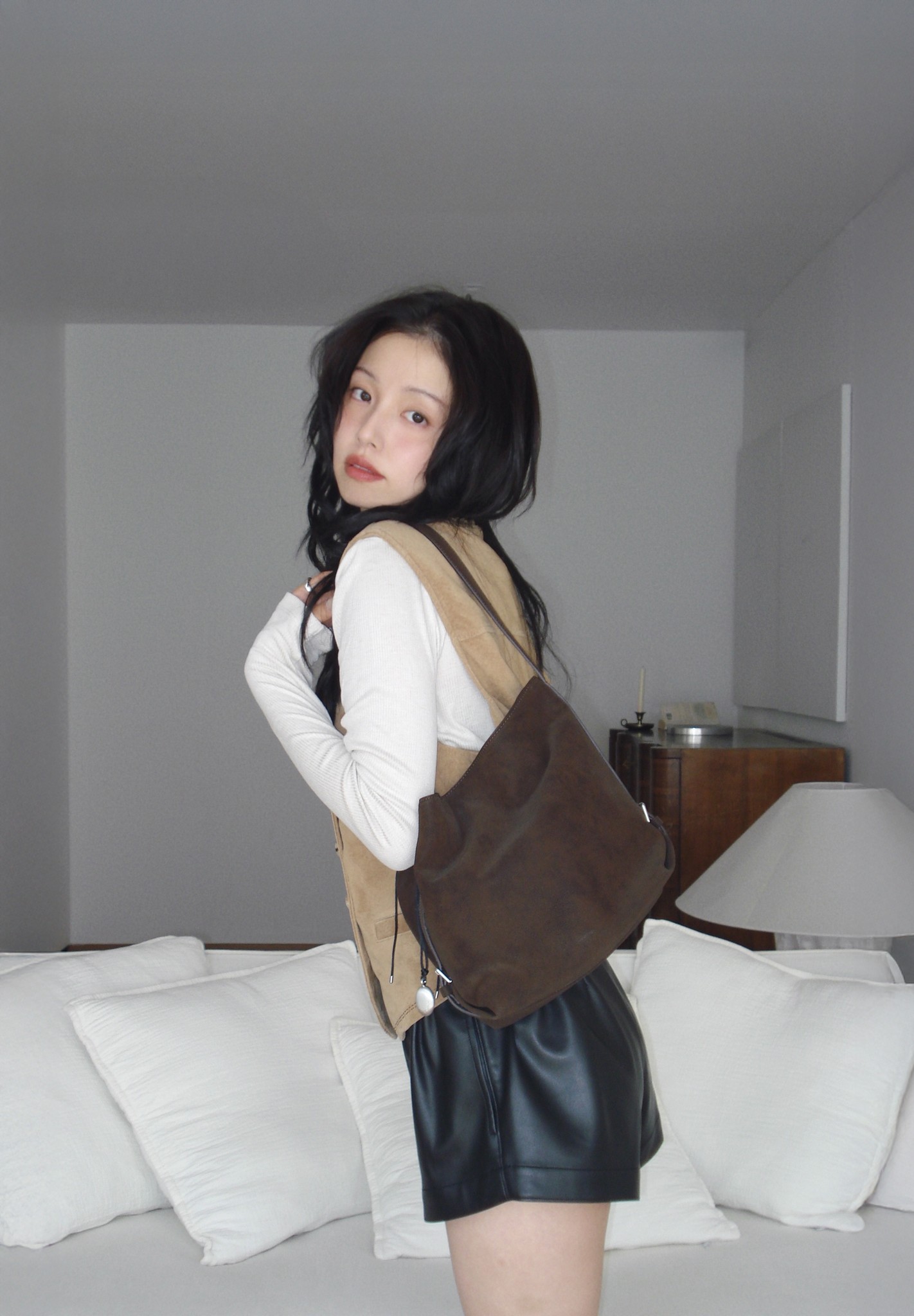 이번 컬렉션에서는 ‘미오 버킷백’이 가장 마음에 들어요. 특히 마론 컬러는 누벅 질감과 부드럽고 유연한 실루엣이 매력적이라 가을에 잘 어울릴 것 같아요. 수납도 넉넉하고, 벨트 디테일이 은은한 포인트를 더해주네요.