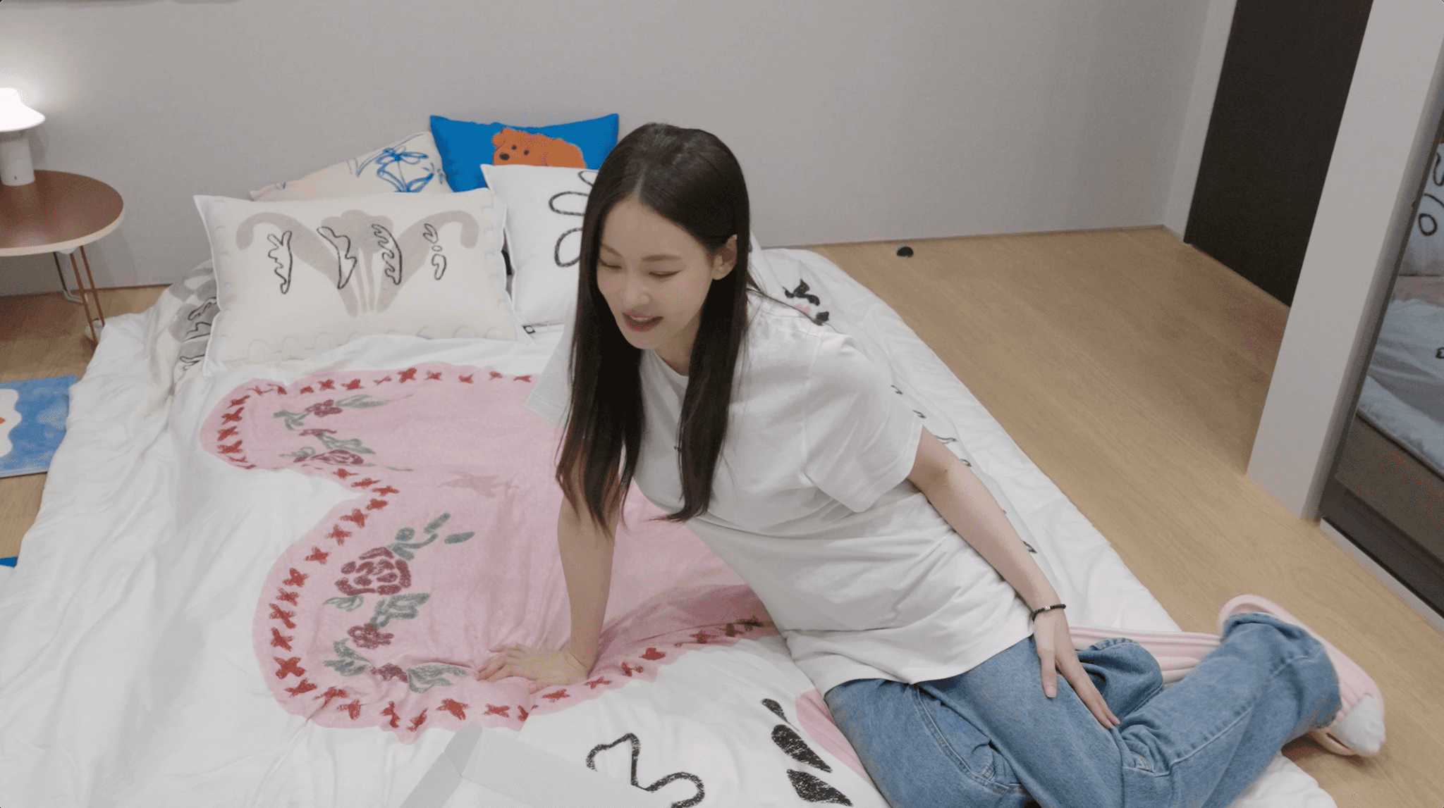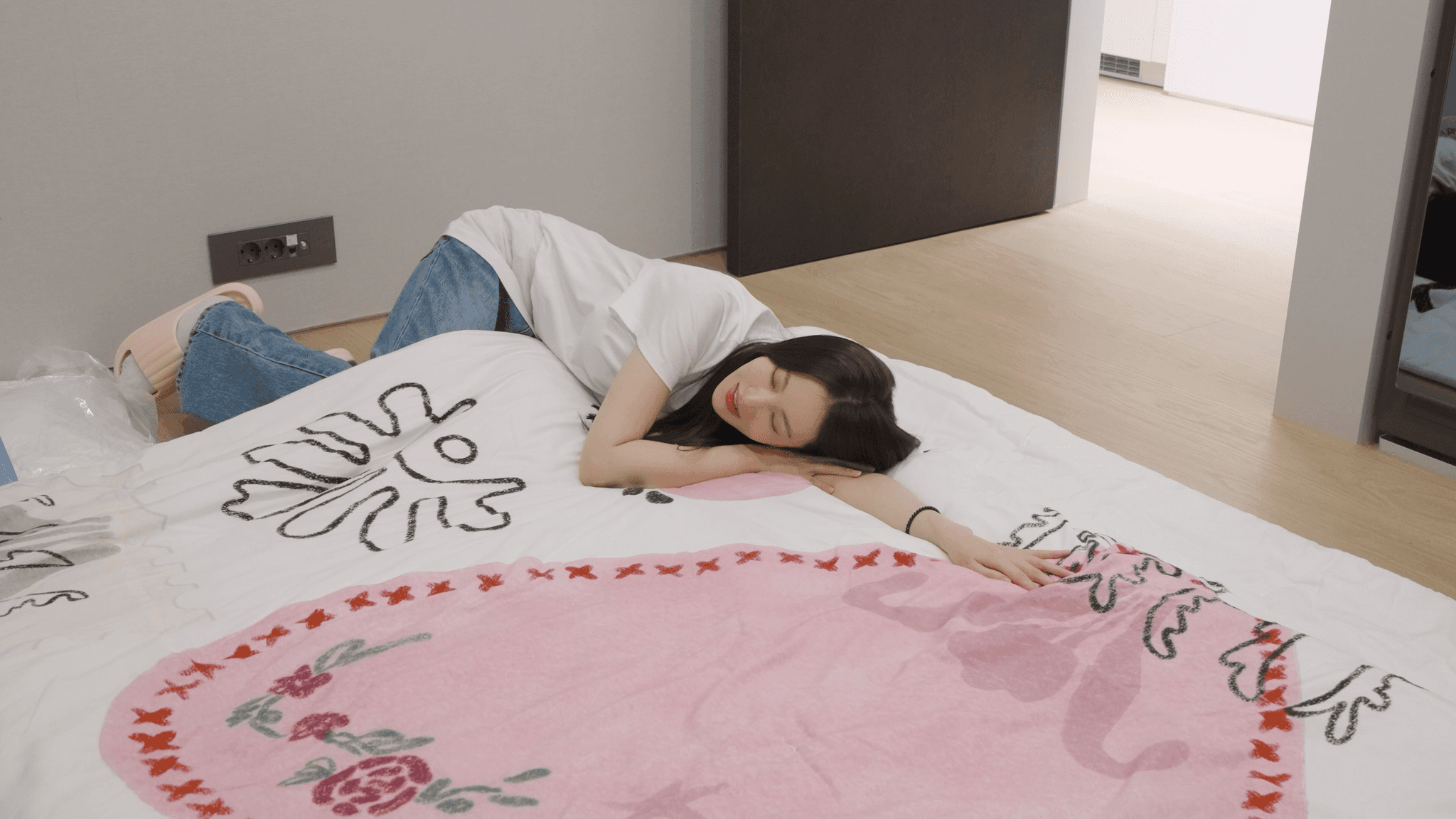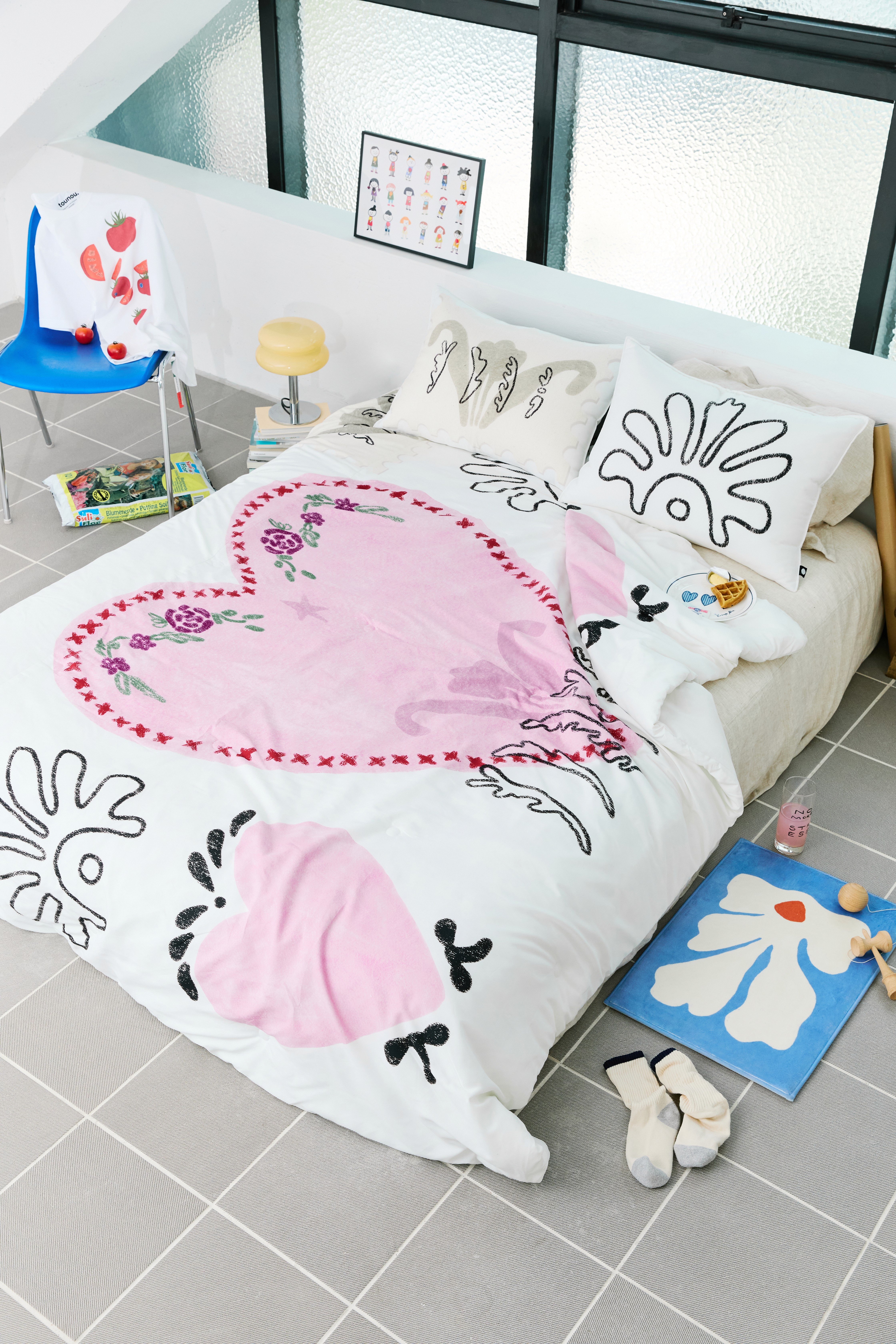 사람마다 공간을 꾸미는 취향이 다르듯, 제 기준에 귀엽고 예쁜 것을 중심으로 구성해 봤어요. 전체 색감은 블루와 핑크로 맞추고 다양한 볼거리를 위해 숲, 바다, 하트 등의 요소를 넣어 꾸며봤습니다. 추천 아이템은 고민할 필요도 없이 '웜 하트 알러지 케어 차렵이불'이에요. 협업 전부터 장바구니에 담아뒀었는데, 실물을 보자마자 '와, 역시 내 스타일이야!' 싶었죠. 가벼운데 포근하기까지 해요. 피부가 예민한 편인데 알러지 케어 원단이라 더 마음에 들어요.