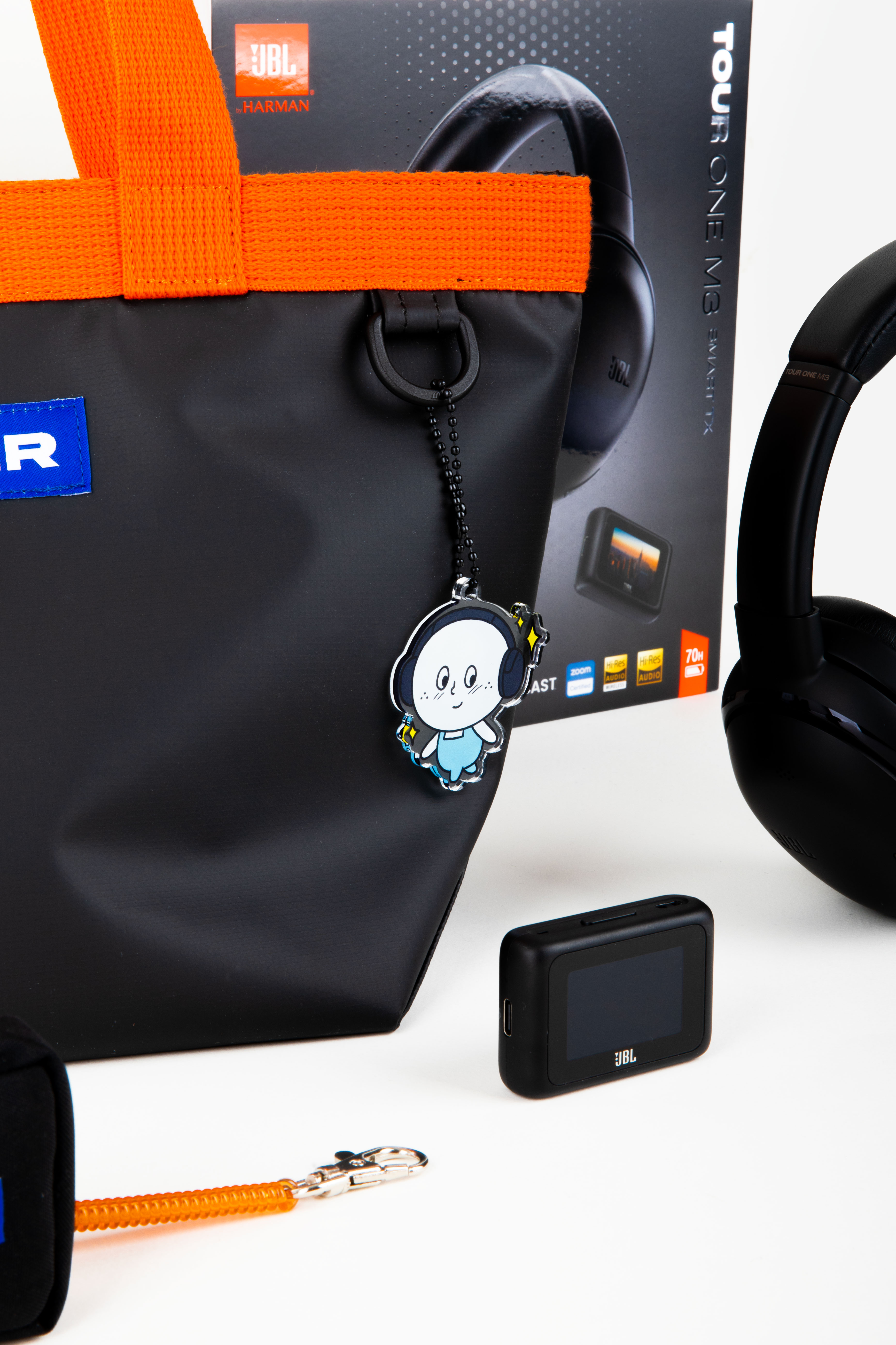 JBL 전용 파우치 2종을 추천합니다. JBL 헤드셋과 트랜스미터에 딱 맞게 제작했답니다. 특히 생활 방수가 되는 튼튼한 원단이라 마음 놓고 제품을 넣어 다닐 수 있어요. 키링처럼 사용하도록 고리가 달려있으니 평소 들고 다니는 가방이나 파우치에 달아도 좋습니다. 패키지에 포함된 못나니즈 키링과 매치하는 것 또한 잊지 마세요.