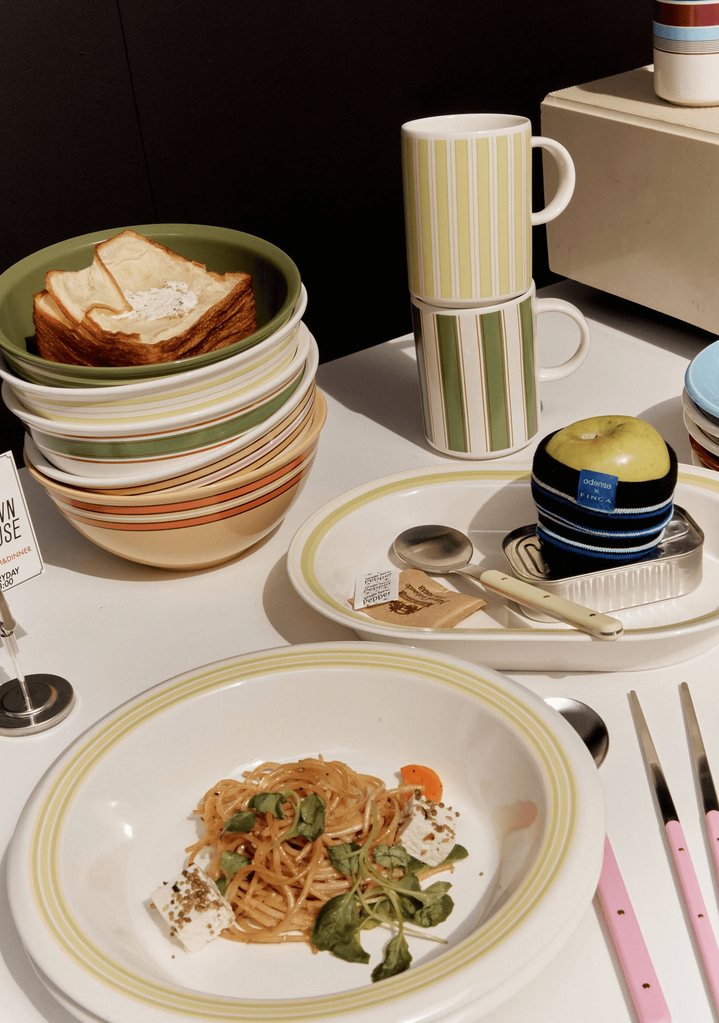 오덴세×핀카의 콜라보레이션 <Find your pattern>프로젝트는 핀카의 시그니처 스트라이프 패턴을 세라믹에 담아 '테이블 위의 패브릭' 을 표방하는 감각적인 연출을 제안합니다. 테이블웨어에 대한 각기 다른 시선을 지닌 오덴세와 핀카가 각자의 관점에서 해석한 디자인을 담은 아이템을 하나의 테이블에서 동시에 경험할 수 있는 특별한 기회를 준비했어요.