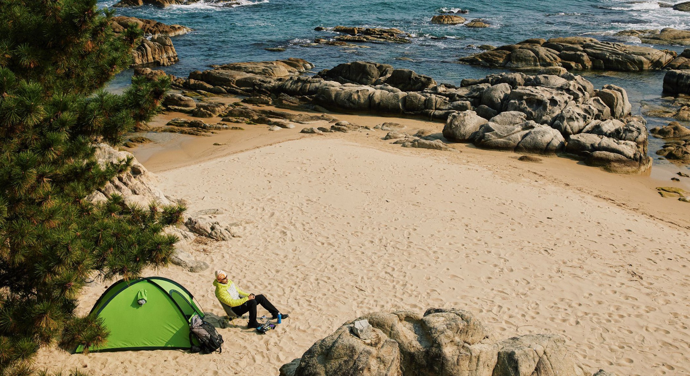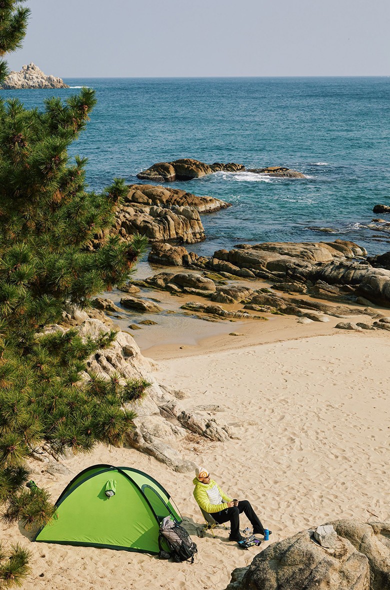 산 아래 가까운 해변에 도착했습니다. 백사장 끝 모래사장 한편에 자리를 잡습니다. 바닥은 팩이 박힐 만큼 단단하진 않지만, 암석들이 바람을 막아주니 이곳에 머무르기로 합니다.