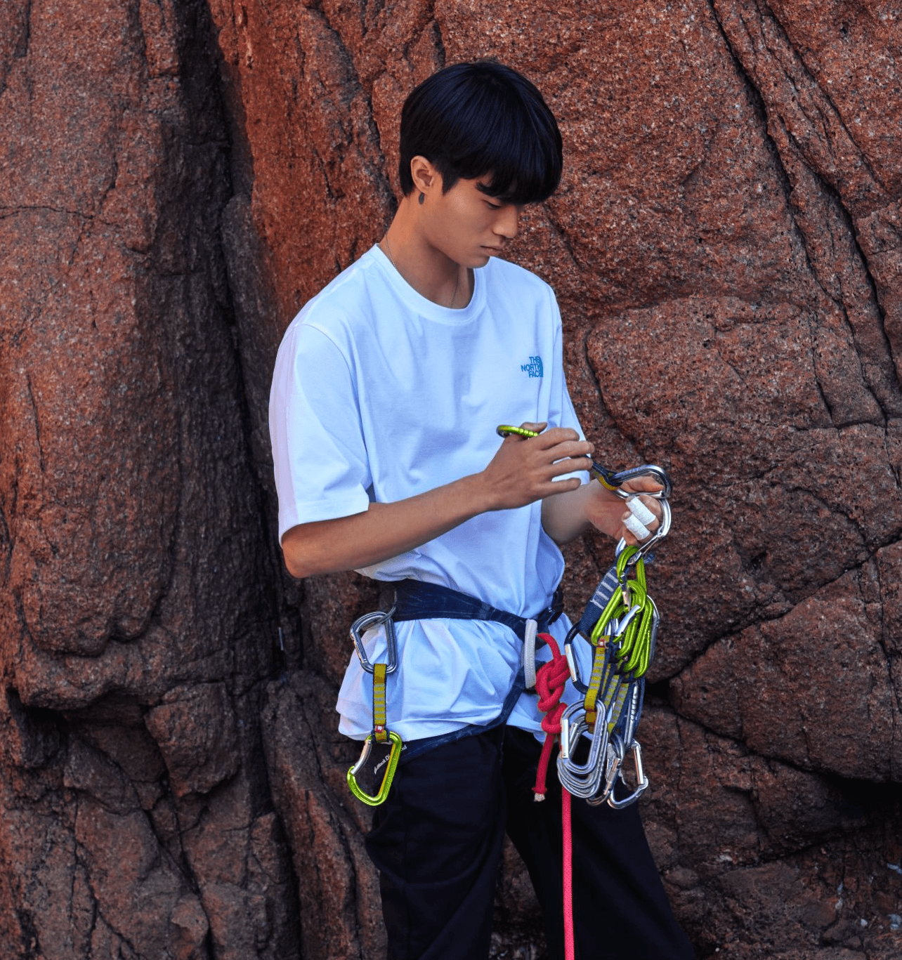 로프 없이 맨몸으로 오르는 볼더링과 달리, 리드 클라이밍은 더 높은 곳을 올라야 하기에 갖춰야 할 안전 장비가 제법 많습니다. 다운재킷과 리커버리 슈즈는 한편에 벗어두고 암벽화로 갈아 신습니다. 바닥에 로프를 펼쳐놓고 손가락에는 테이프를 감습니다. 마지막으로 허리춤에 안전벨트와 퀵드로, 초크 백을 장착하면 오를 준비는 끝입니다.