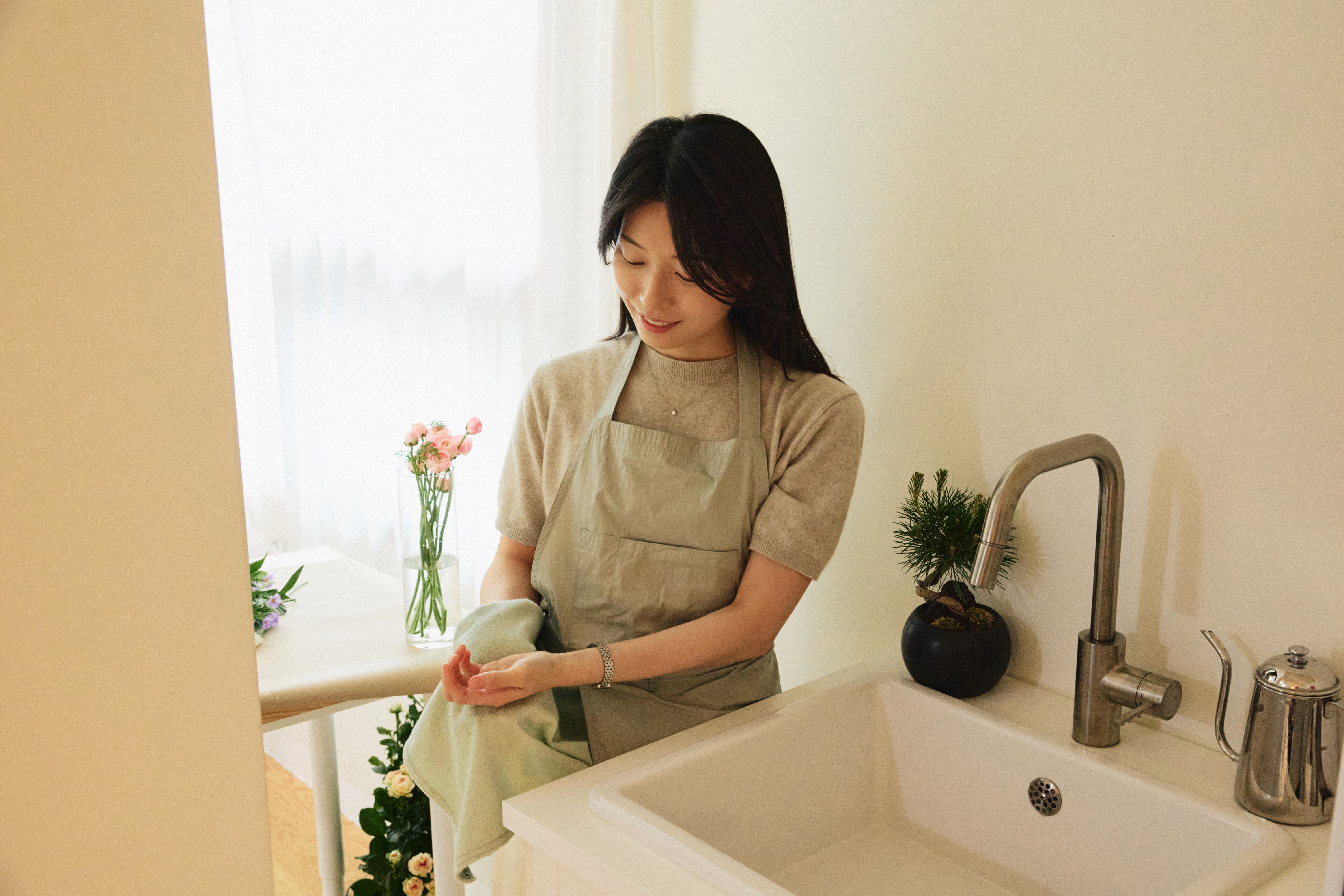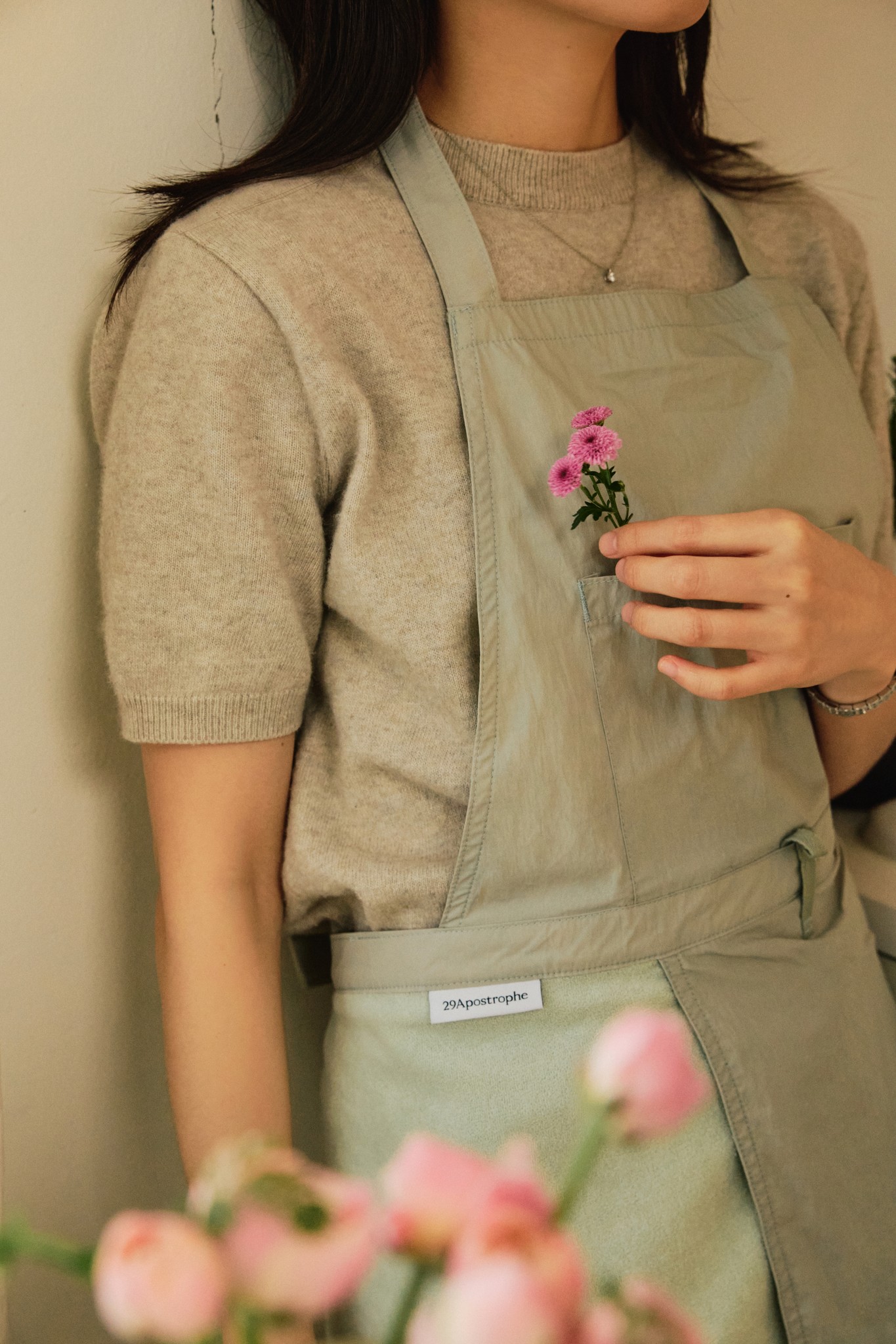 에이프런 하면 떠오르는 특정 직업군이 있죠. 요리사, 바리스타, 화가, 저와 같은 플로리스트까지, 무수히 많네요. 하지만 집에 사는 누군가라면 하나쯤 꼭 필요로 하게 되는 아이템도 바로 에이프런이죠. 집에서 청소를 하거나 요리를 할 때만 해도 우리는 에이프런을 찾게 되죠. 사사롭고 일상적일지라도, 사용자인 나를 생각하는 물건을 경험해 보고 싶은 분들에게 추천하고 싶어요.