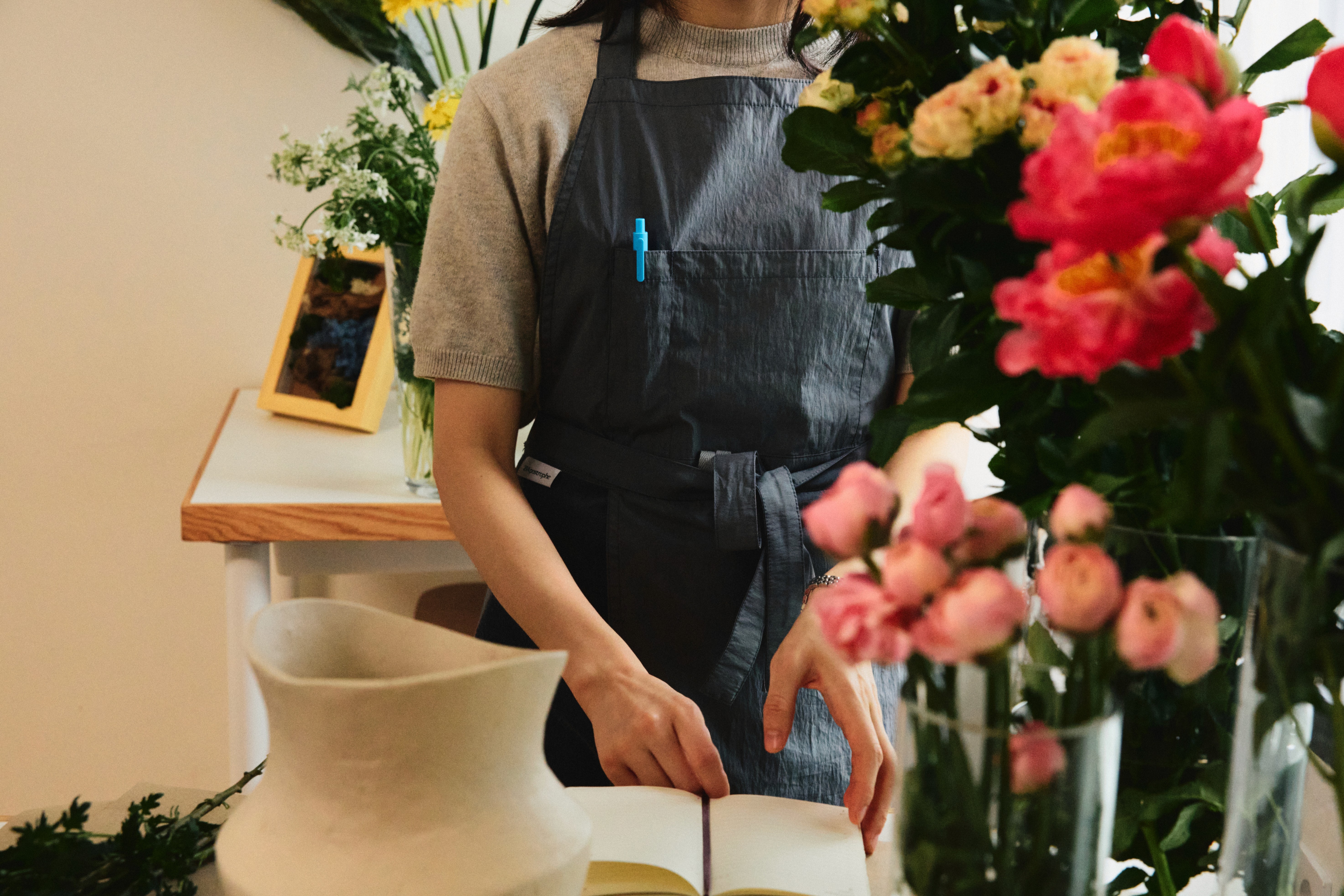 심보라 플로리스트는 꽃과 뿌리식물을 소재로 손에 잡히는 마음을 표현합니다. 꽃망울에서 시듦까지, 시작과 끝을 함께하며 아름다움의 다양한 면모를 선보이는 한 주간, 그의 곁을 지킨 에이프런에 대해 이야기 나눴습니다.