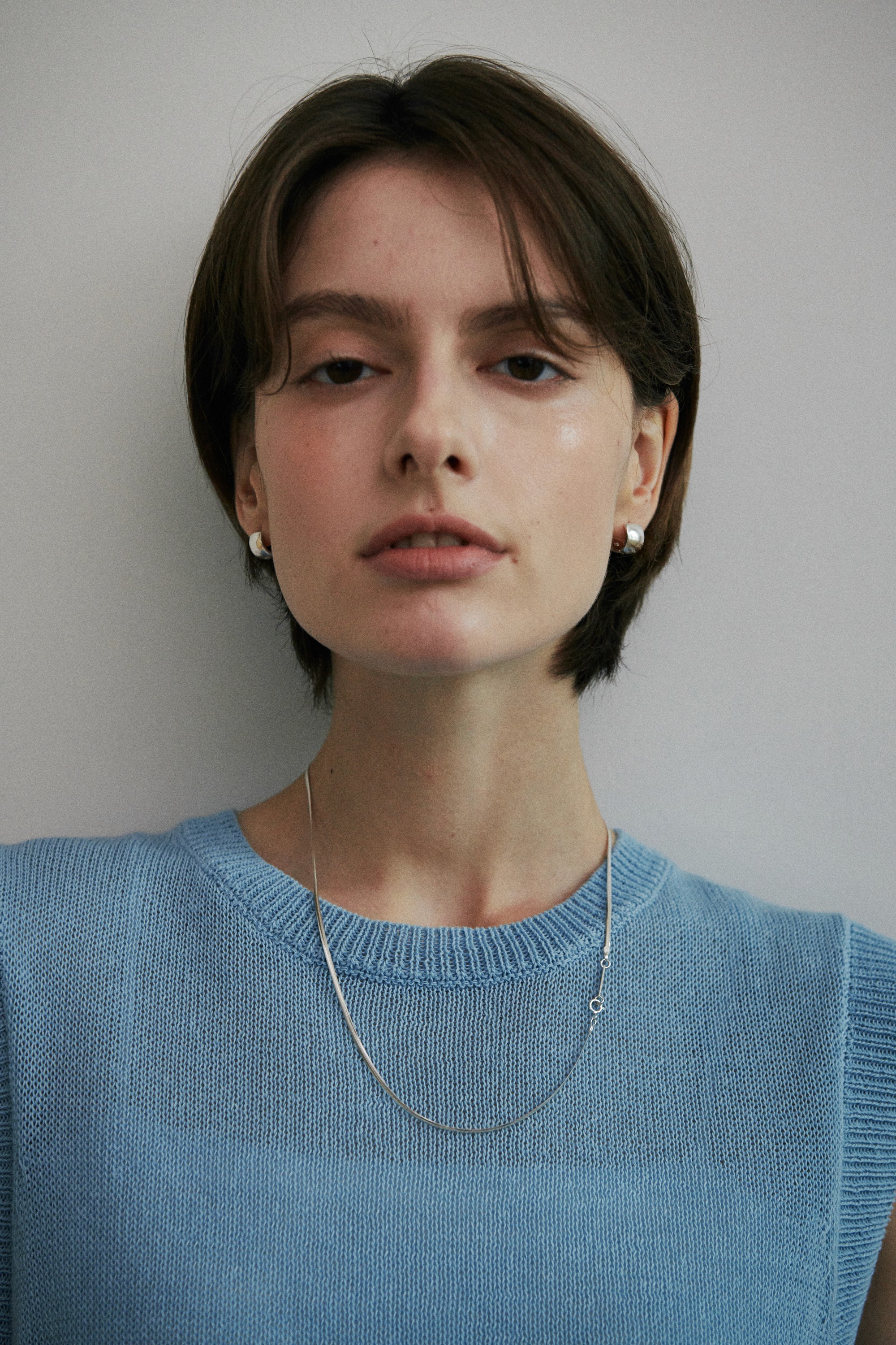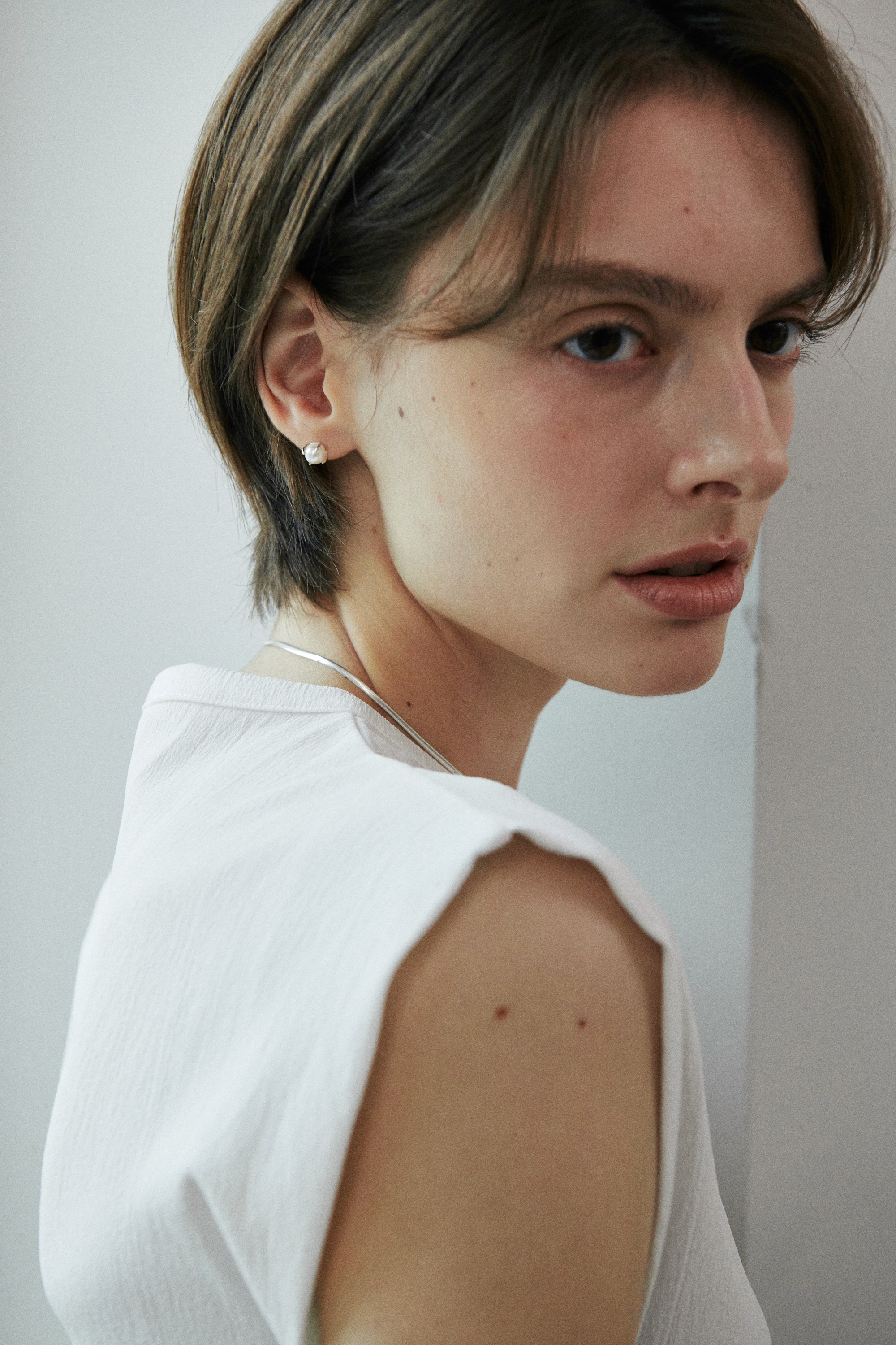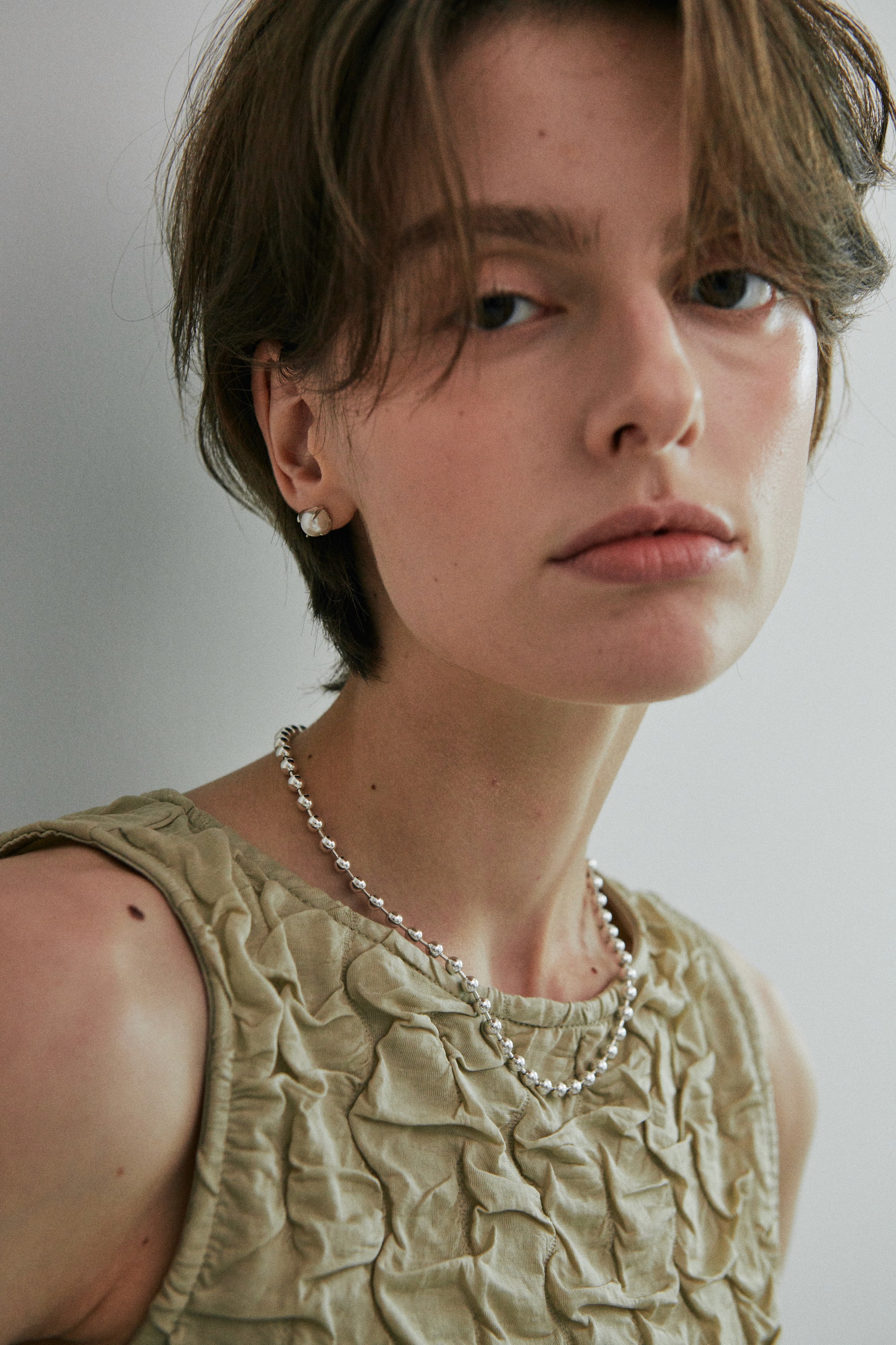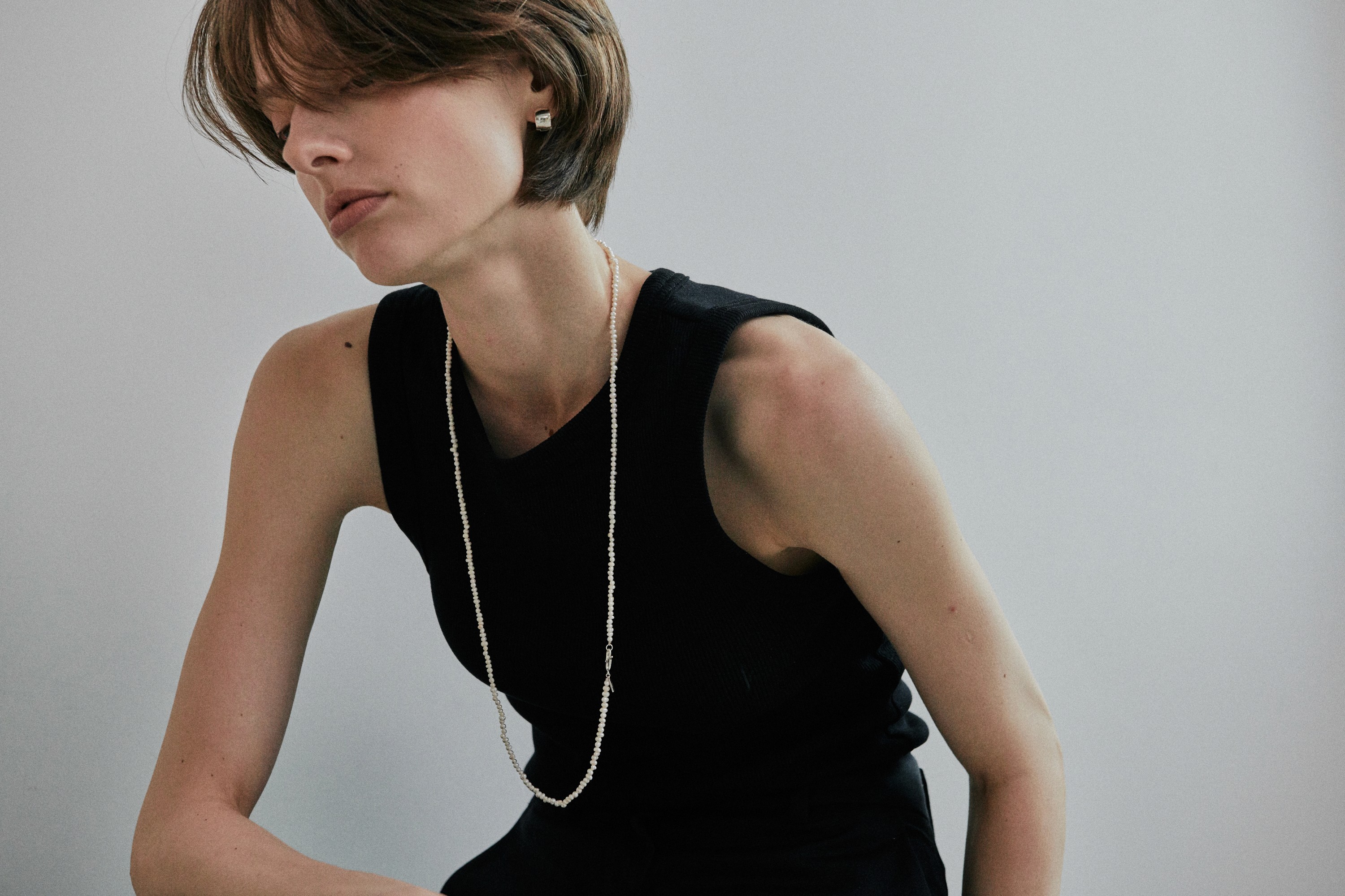 Summer, lightly but with a clear presence. A sense of faintness like the summer air and a clear overlap on top of it. Expressing the space of silhouette between blurriness and clarity. Boldly reduced silver lines, transparently overlapping pearls, bold shapes containing the flow of summer.