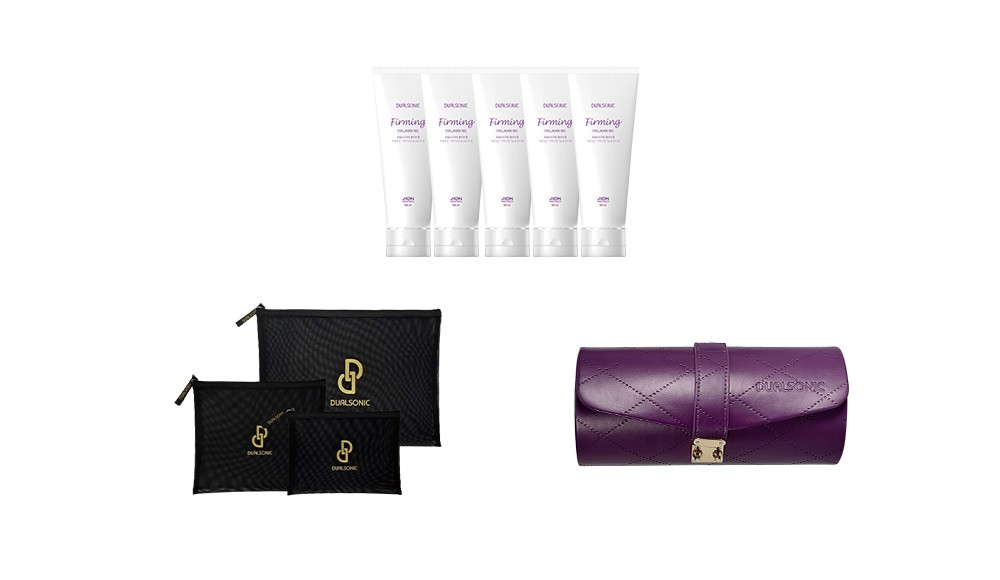 포커스 기간에 듀얼소닉의 뷰티디바이스 구매 시 '매쉬 파우치 3종, 원형 케이스, 콜라겐젤 5개'를 증정합니다.