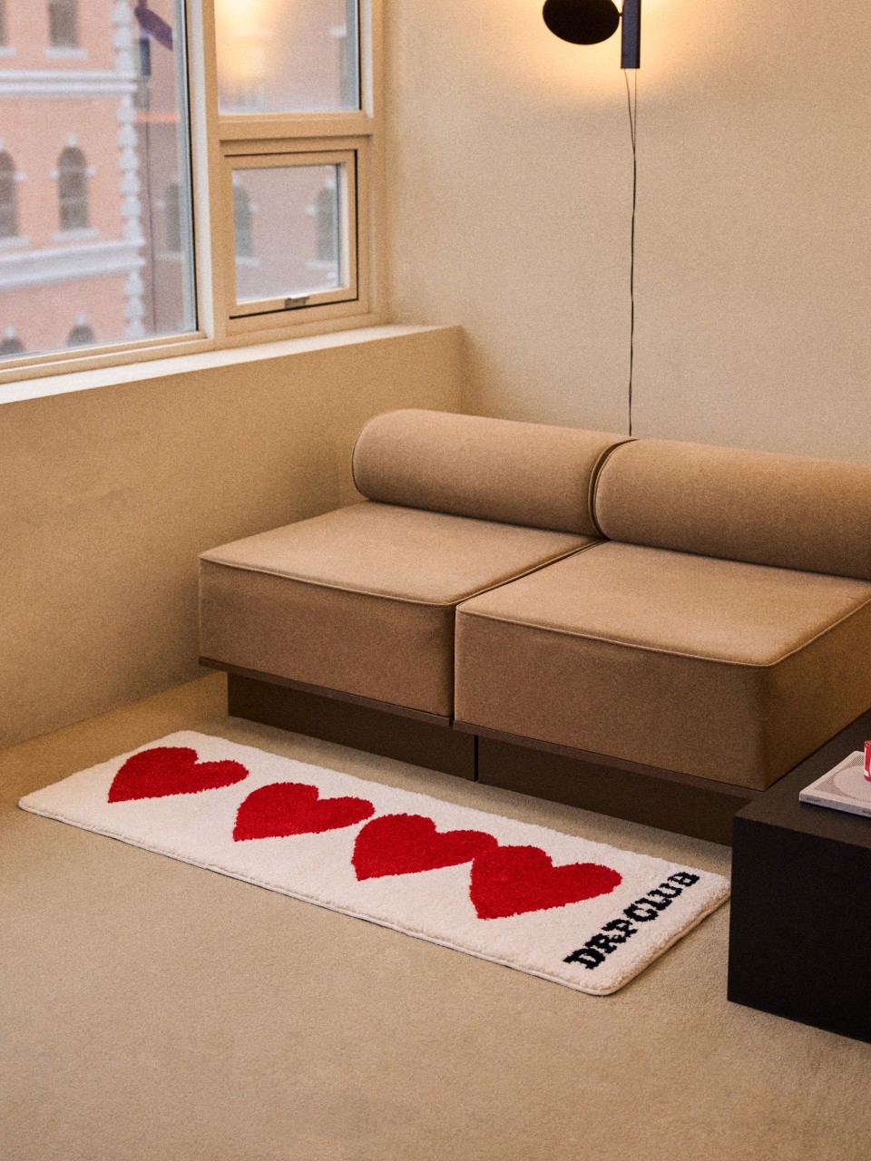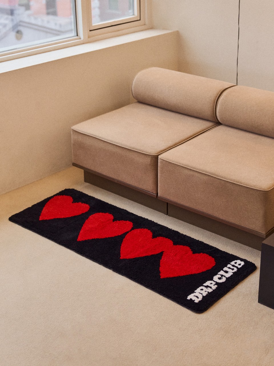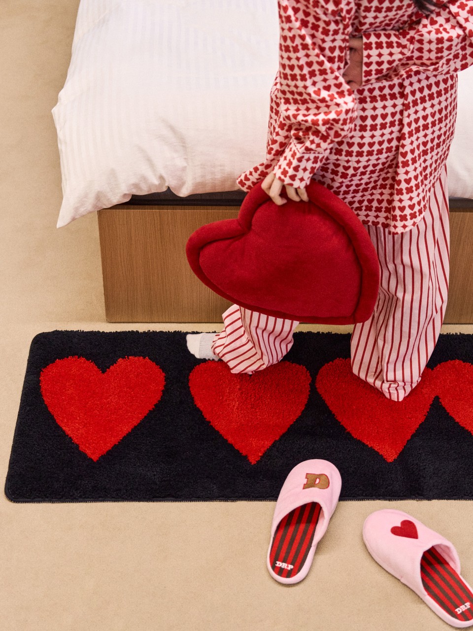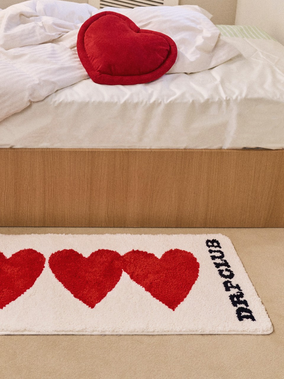 드롭드롭드롭이 전하고 싶은 연결의 순간을 하트 그래픽으로 표현했어요. 어디서든 인테리어의 중심이 되어줄 러그를 소개해요.