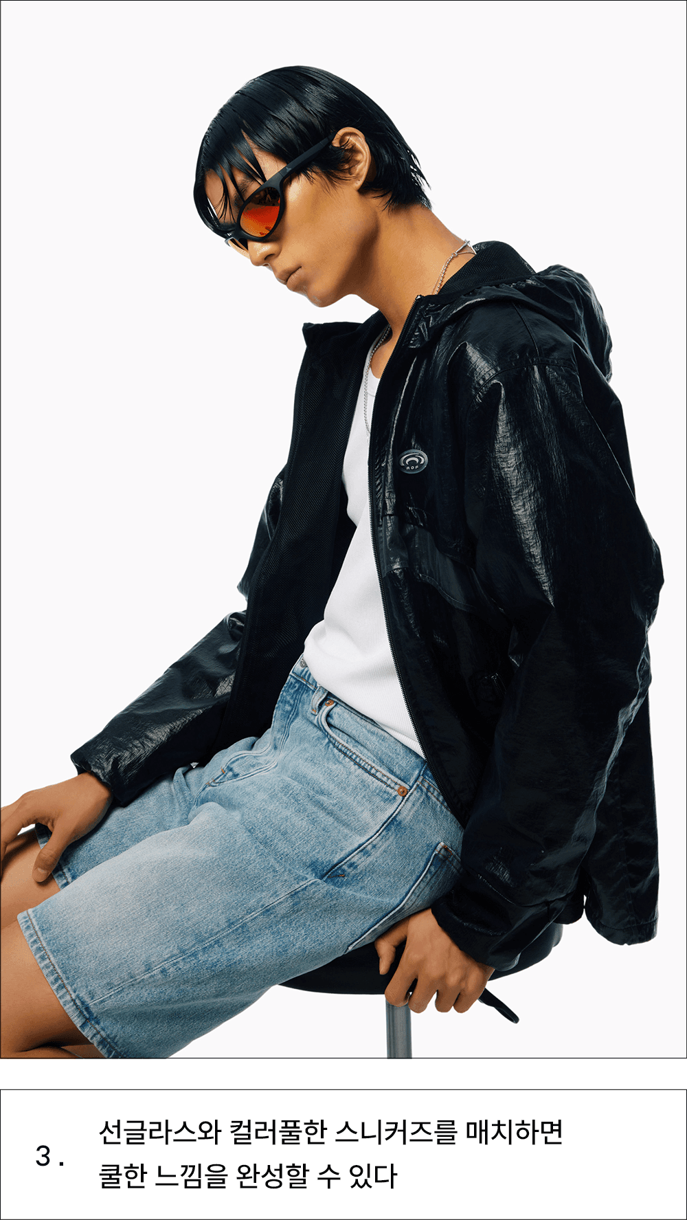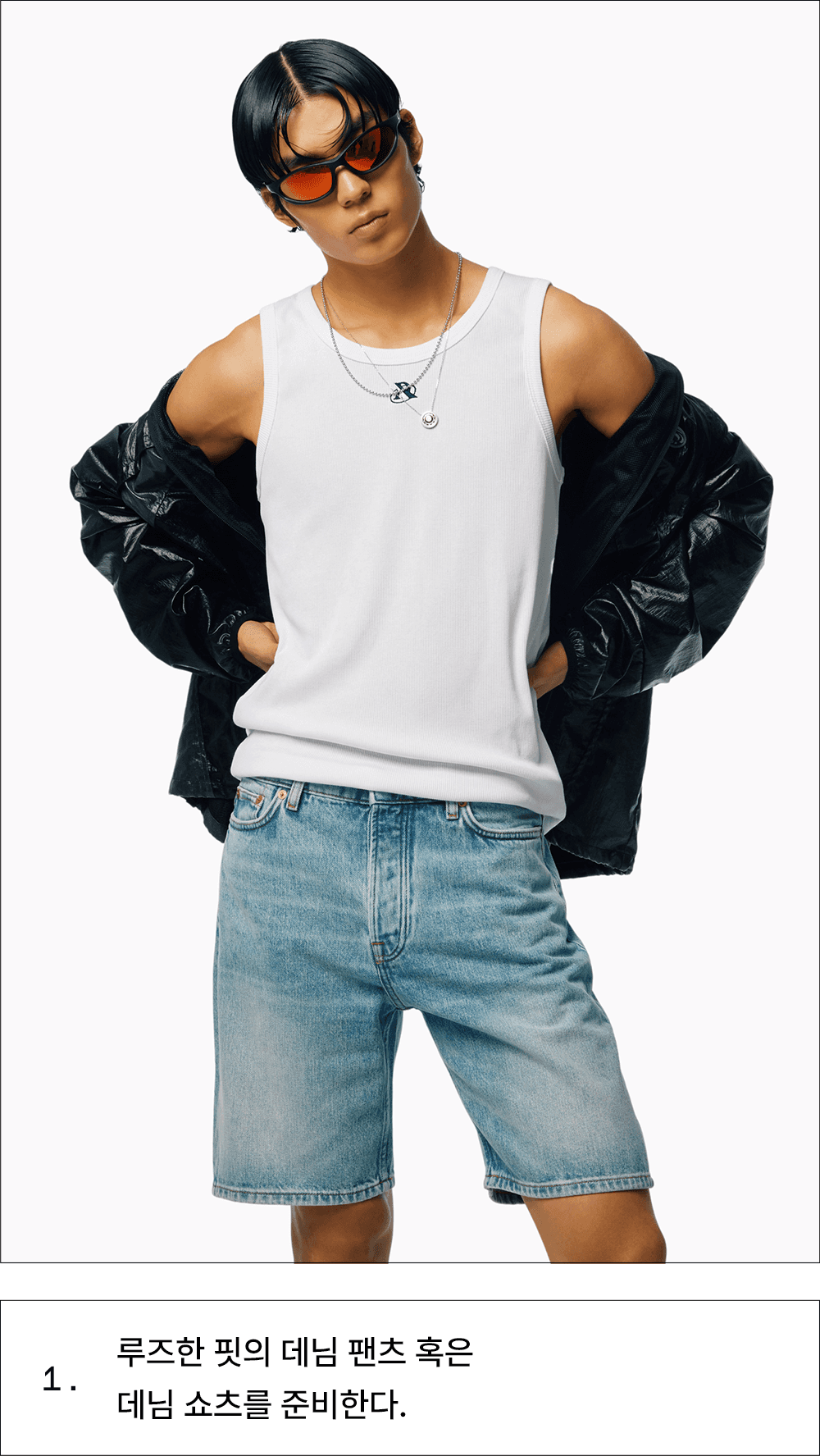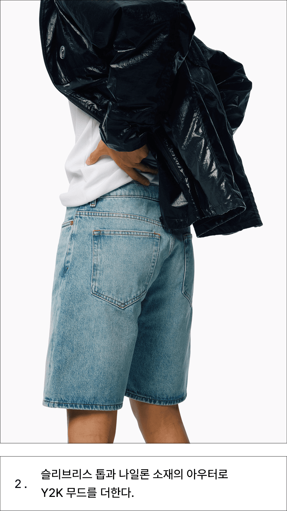 Y2K가 트렌드로 자리 잡은 이후, 젠지와 MZ 세대들은 과감한 시도를 주저하지 않고 다양한 스타일을 즐기게 되었습니다. 타이트한 상의와 와이드한 하의의 매치는 극적인 실루엣을 표현해 주며 슬리브리스 톱이 다시 각광받기 시작했죠. 여성이 주로 즐겨 입던 슬리브리스 톱은 남성들도 찾게 되며 경계가 없어졌습니다. 단독으로 입기에 부담스럽다면 스포티한 아우터나 셔츠를 곁들여보세요. 넉넉한 실루엣의 데님 쇼츠나 팬츠를 매치하면 손쉽게 Y2K 스타일을 완성할 수 있어요.