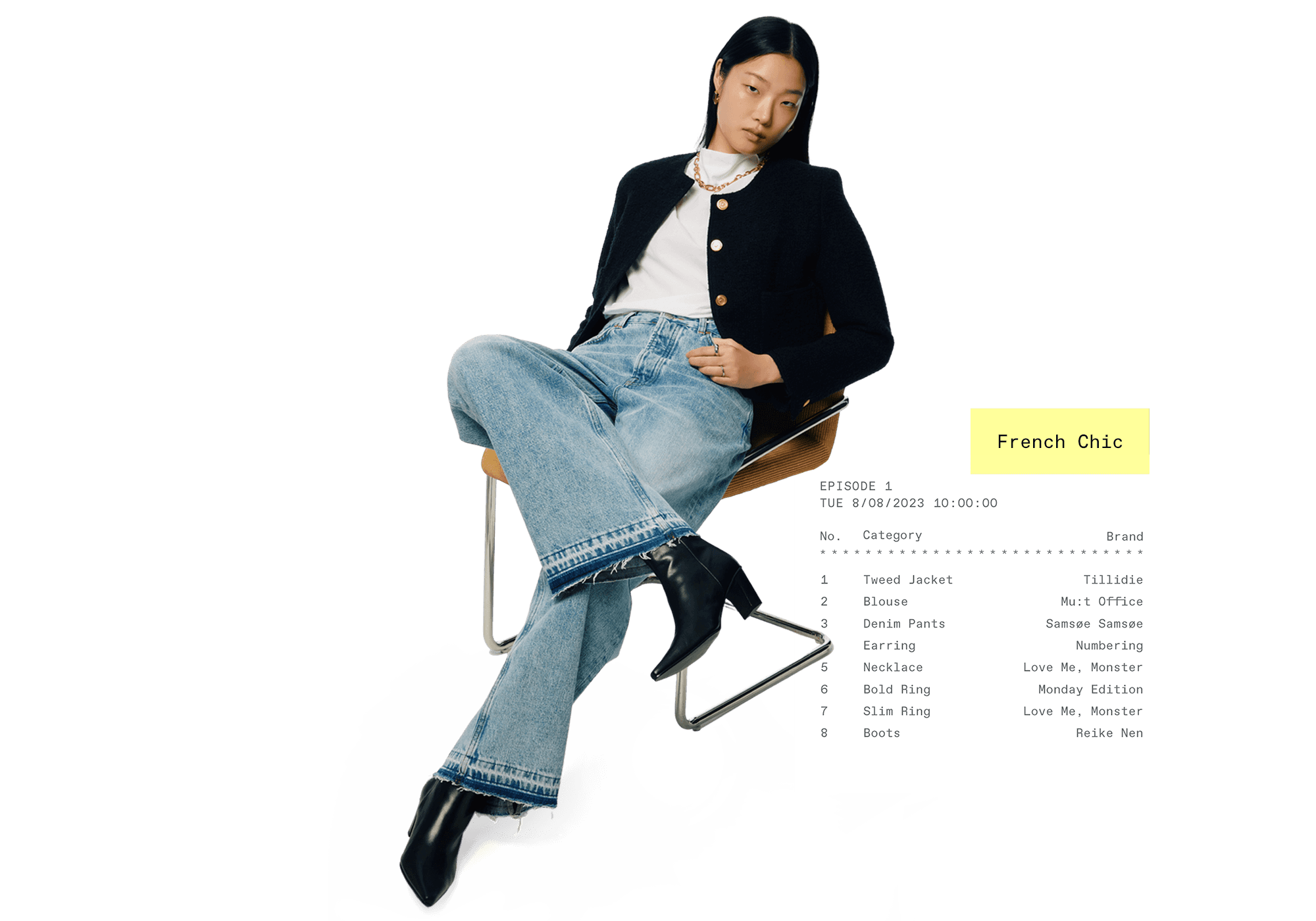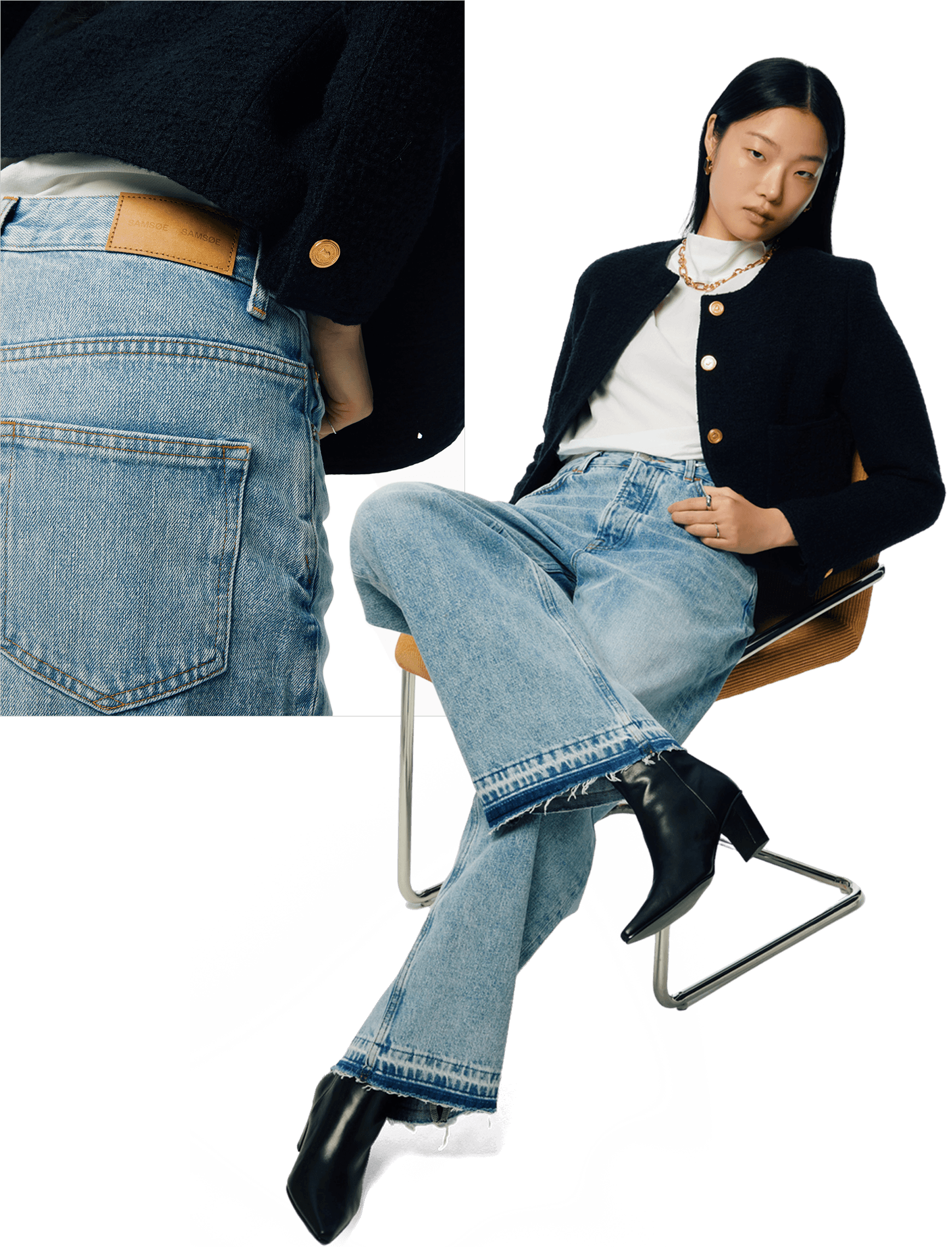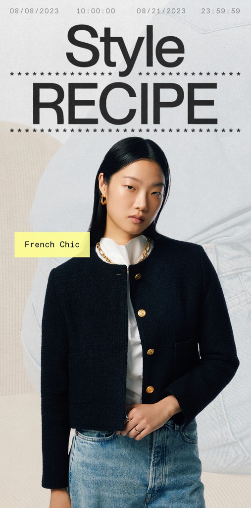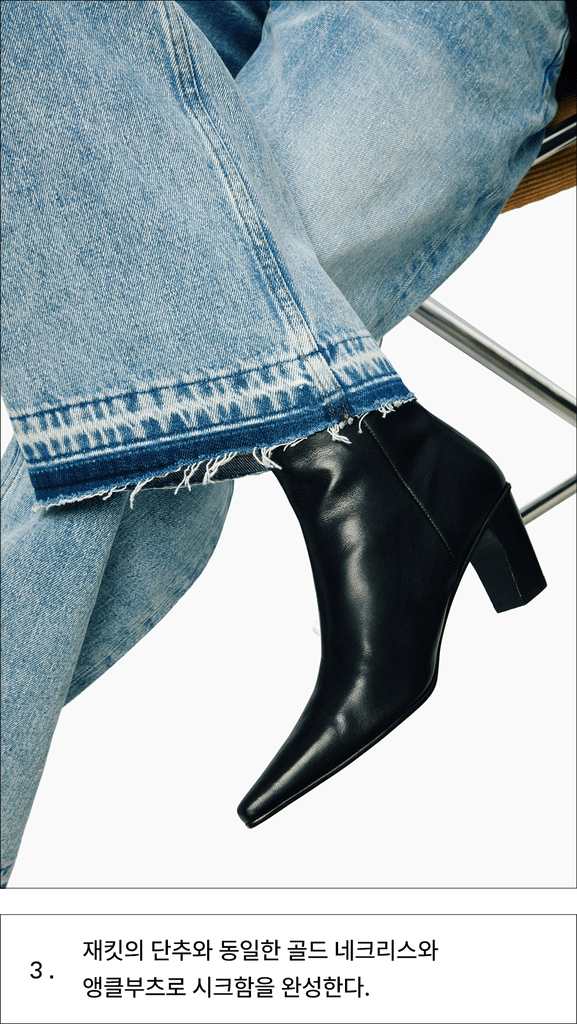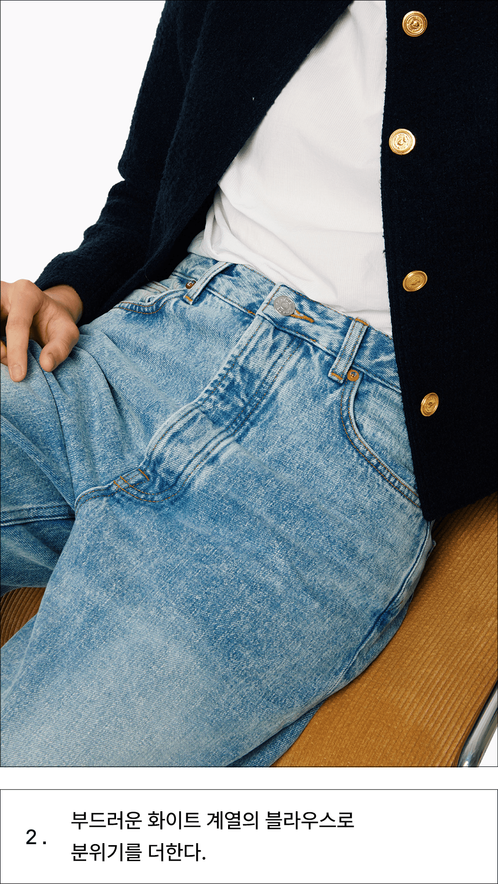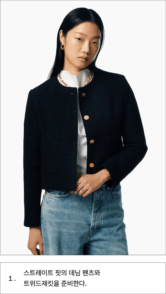 꾸민 듯 꾸미지 않은 느낌의 프렌치 시크 스타일은 내추럴한 헤어와 메이크업은 물론 스타일에도 힘을 빼는 것이 핵심이죠. 프렌치 시크의 정수라고 할 수 있는 셀린느처럼 골드 단추가 포인트인 트위드재킷과 스트레이트 핏 데님 팬츠만 있으면 손쉽게 완성할 수 있어요. 화이트 계열의 블라우스를 이너로 매치하면 우아하고 화사한 분위기를 더하기에 충분합니다.