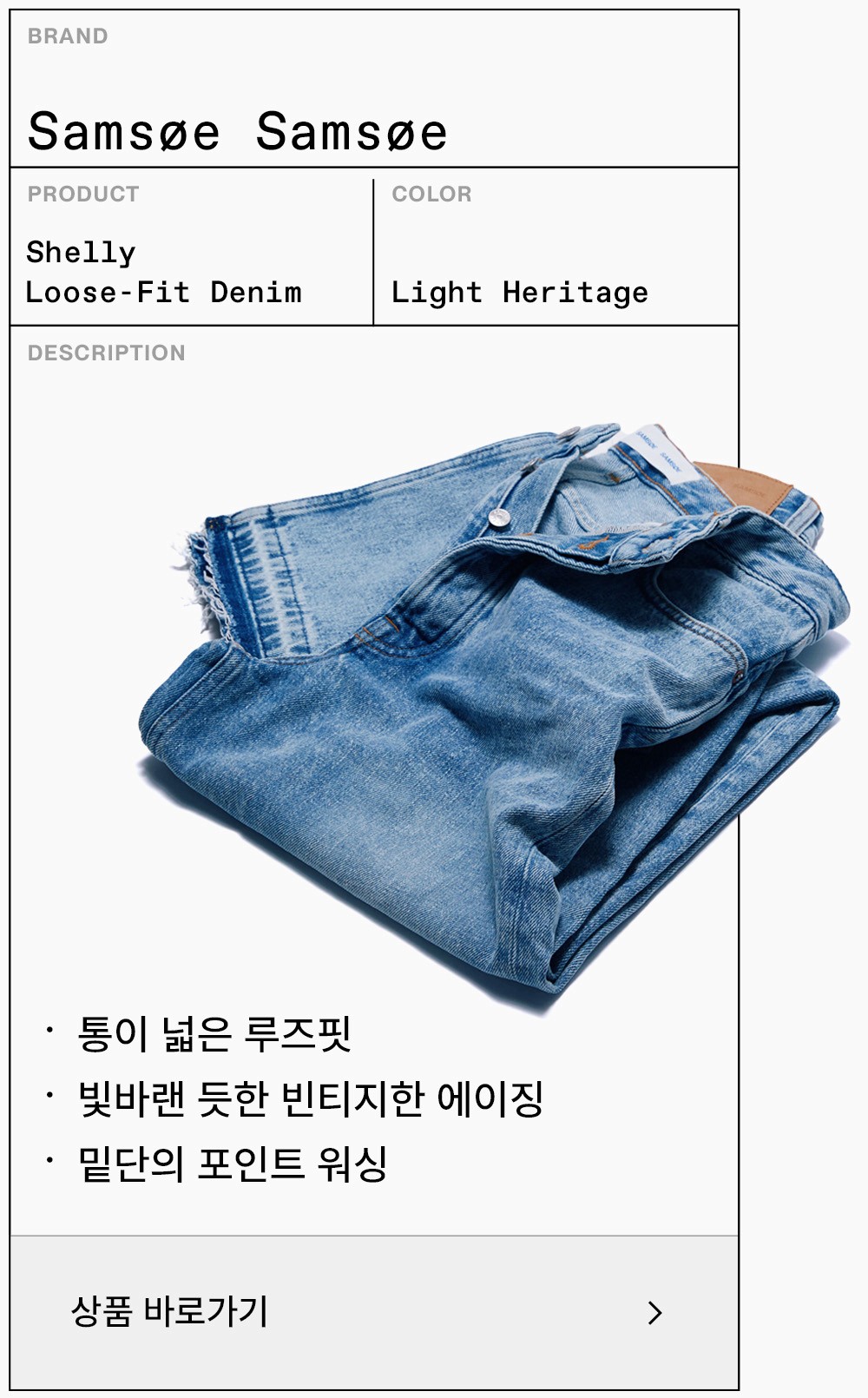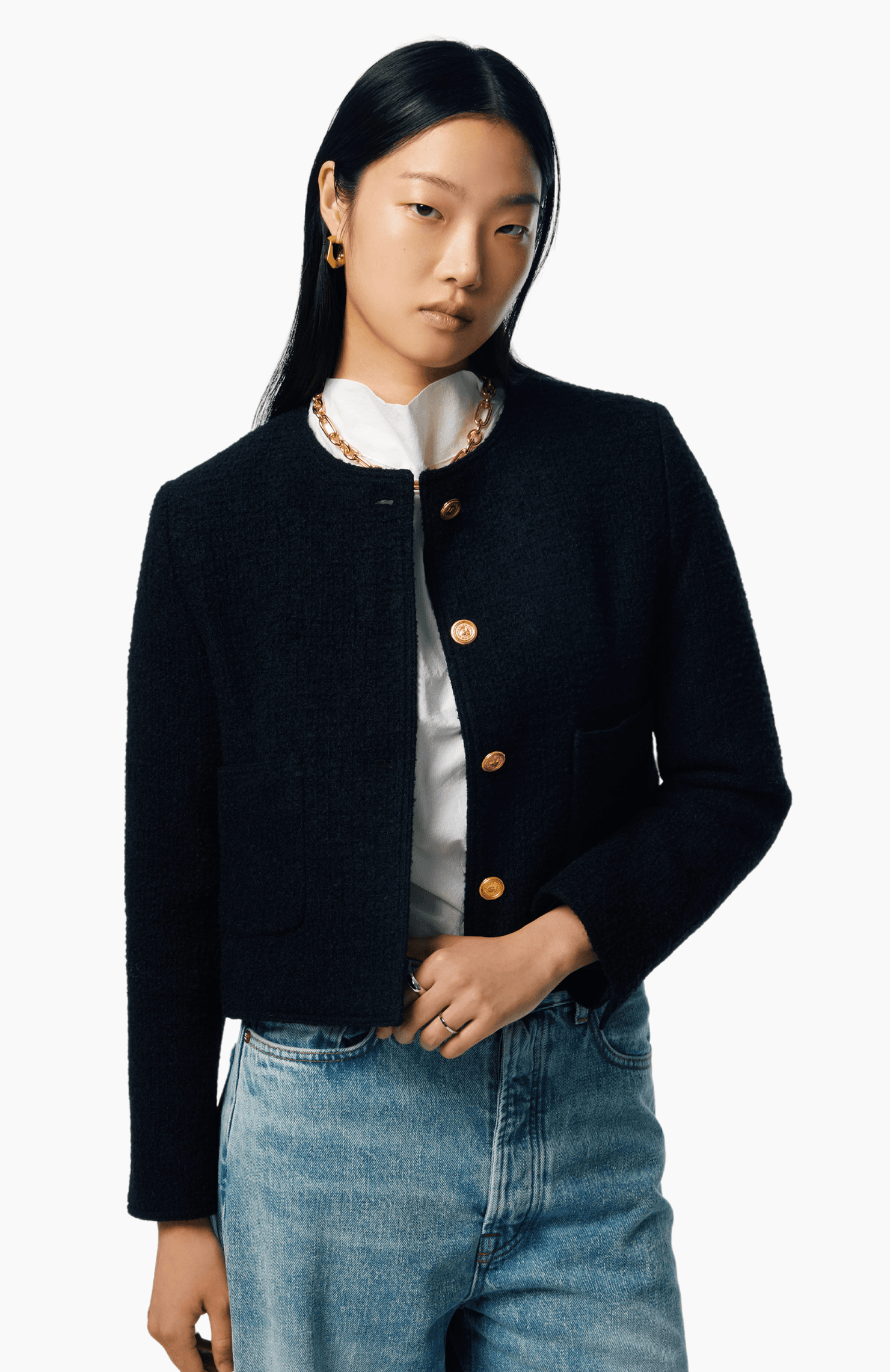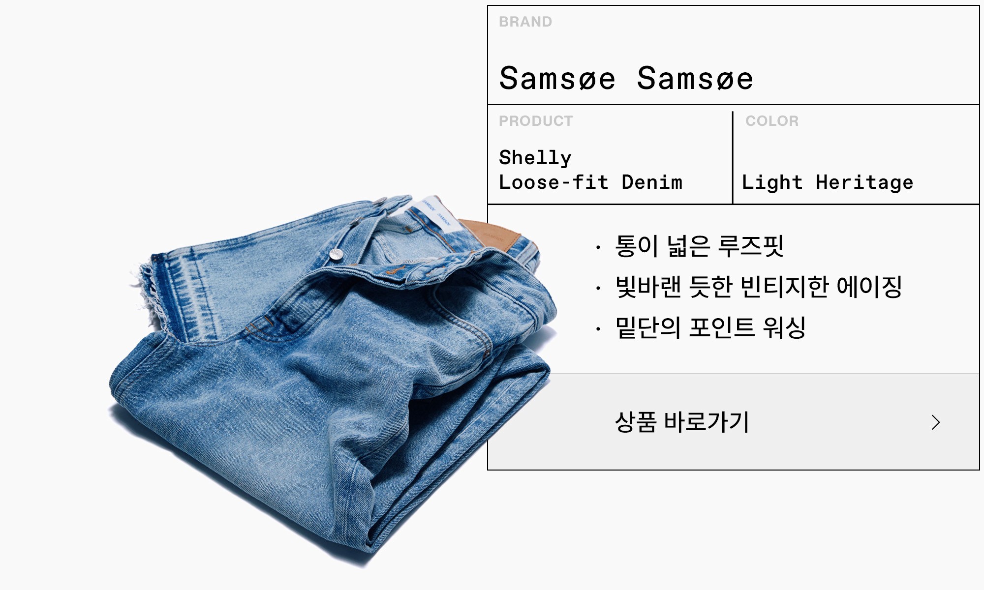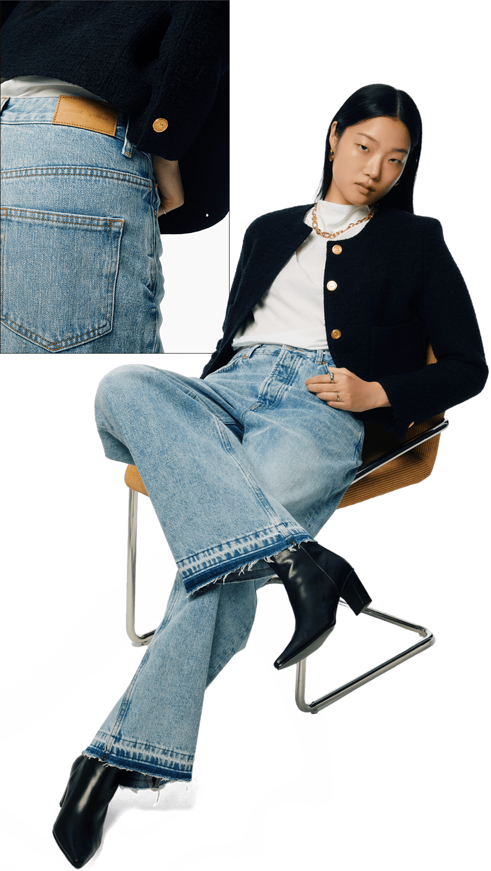 꾸민 듯 꾸미지 않은 느낌의 프렌치 시크 스타일은 내추럴한 헤어와 메이크업은 물론 스타일에도 힘을 빼는 것이 핵심이죠. 프렌치 시크의 정수라고 할 수 있는 셀린느처럼 골드 단추가 포인트인 트위드재킷과 스트레이트 핏 데님 팬츠만 있으면 손쉽게 완성할 수 있어요. 화이트 계열의 블라우스를 이너로 매치하면 우아하고 화사한 분위기를 더하기에 충분합니다.