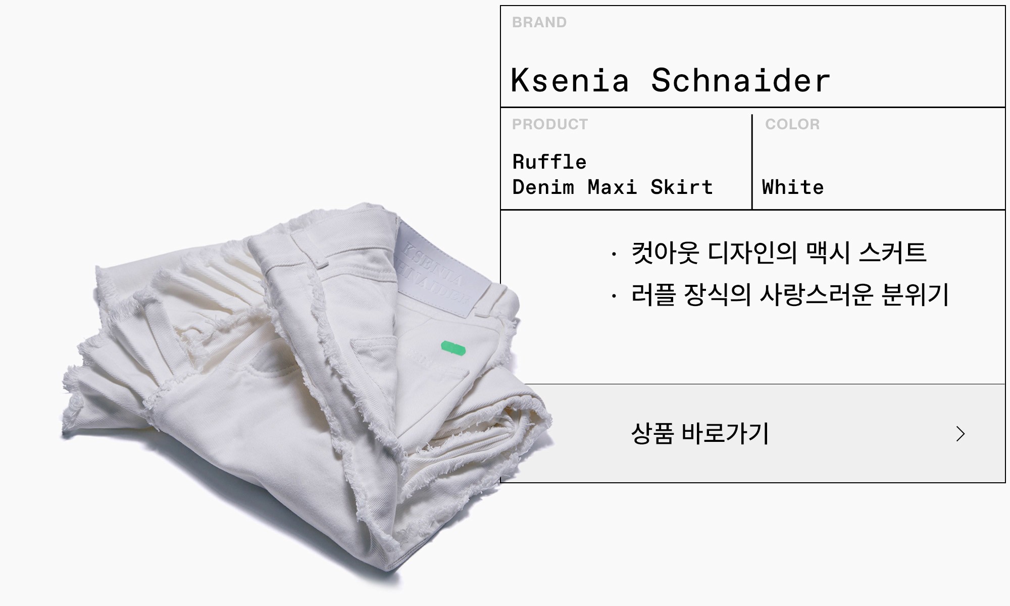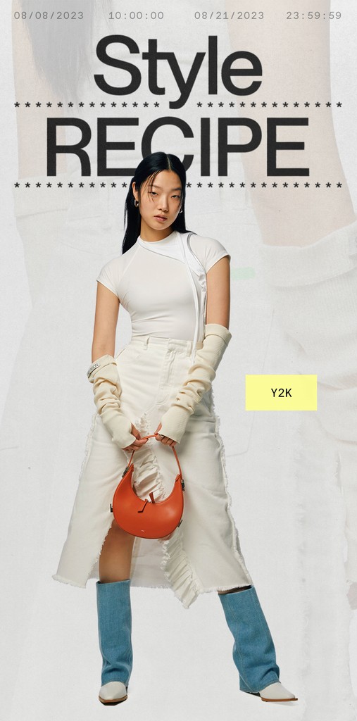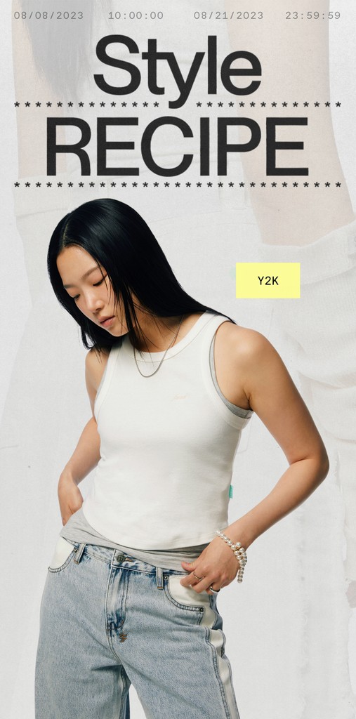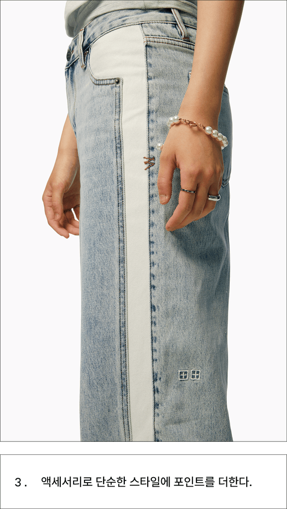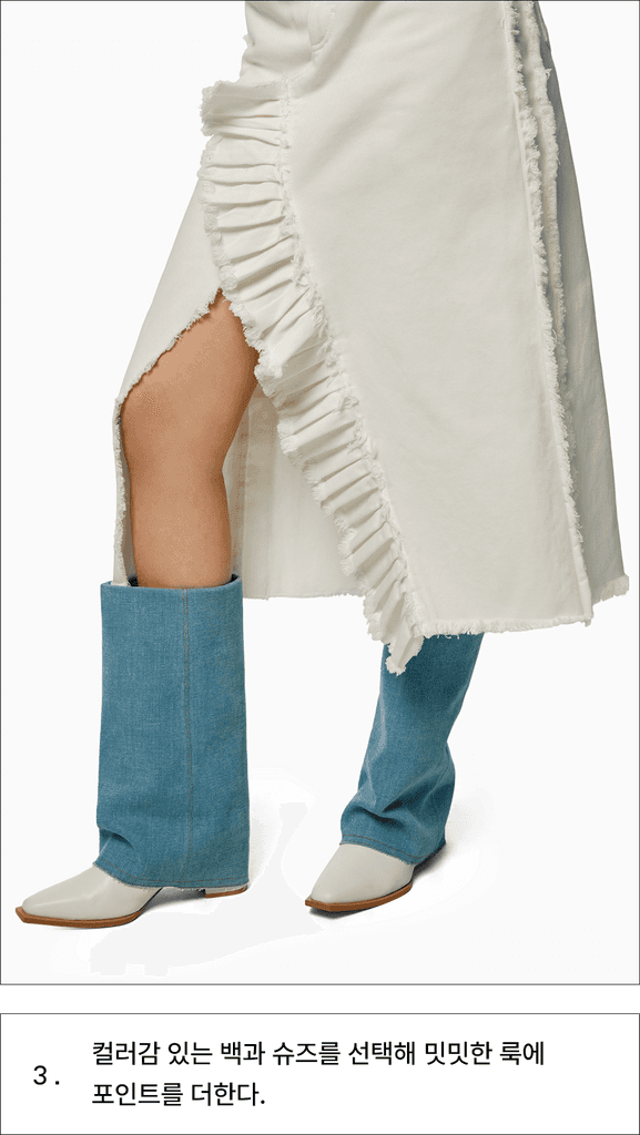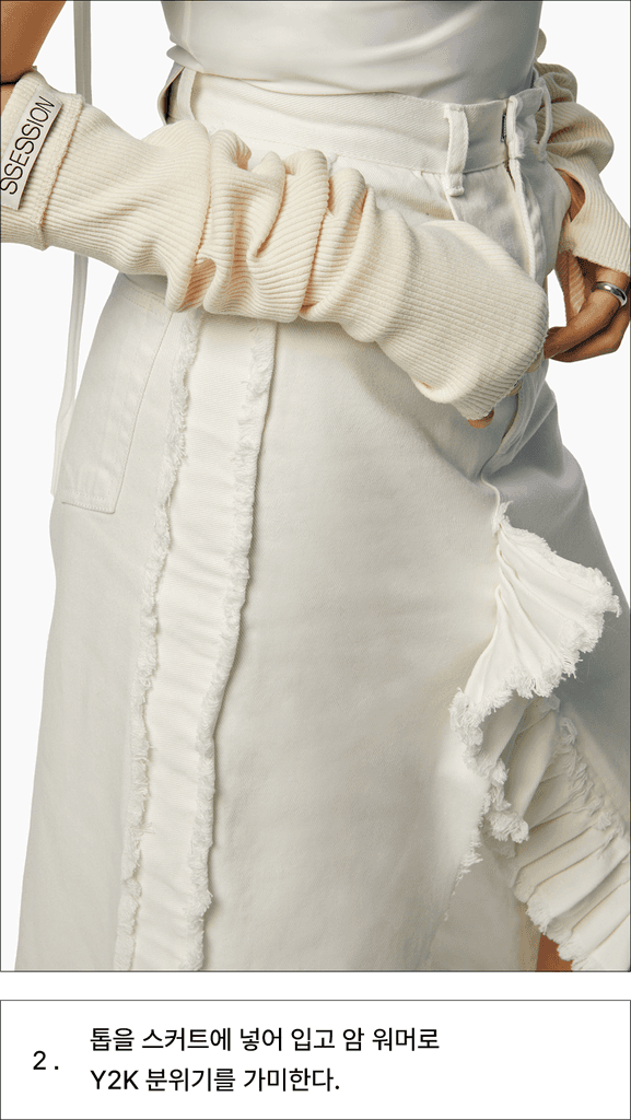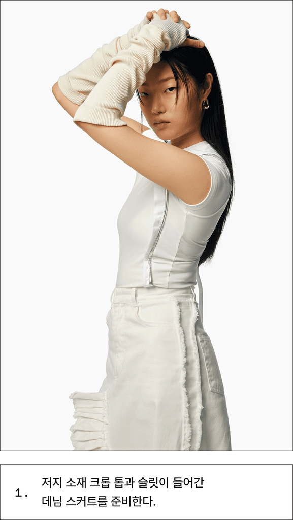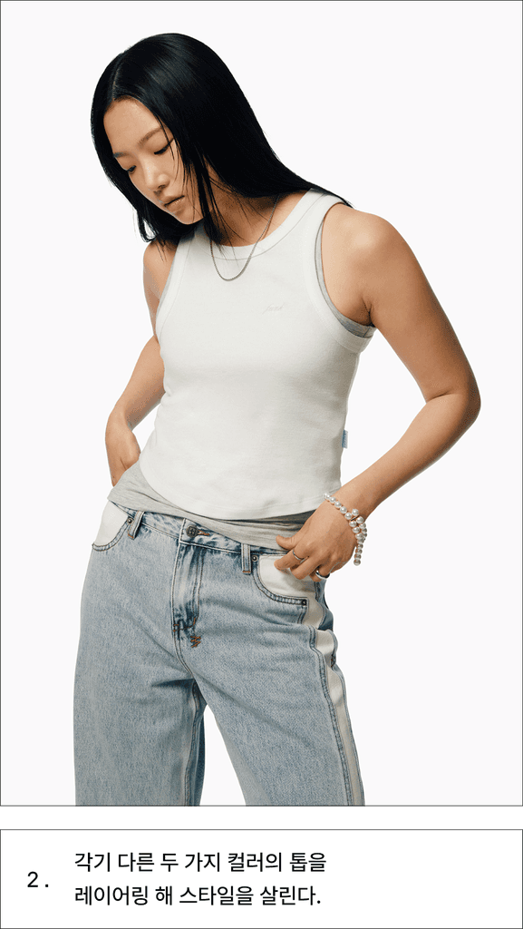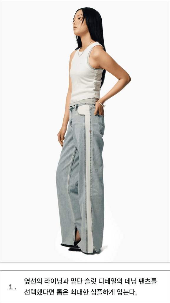 Y2K 트렌드는 여전히 유효합니다. 1990년대 유행했던 찢어진 데님은 Y2K 스타일을 연출하고 싶을 때 유용한 아이템! 깊은 슬릿에 러플 장식의 미디 데님 스커트와 밑단 옆선에 슬릿 디테일의 와이드 데님 팬츠는 하나만으로도 존재감이 강렬해요. 상의는 최대한 심플한 티셔츠를 매치하는 것이 관건입니다. 첫 번째 룩처럼 소재를 다르게 매치하면 컬러는 심플해도 더욱 스타일리시한 룩을 완성할 수 있어요. 화이트, 그레이의 기본 탱크톱을 레이어링한 두번째 스타일링도 참고해보세요.