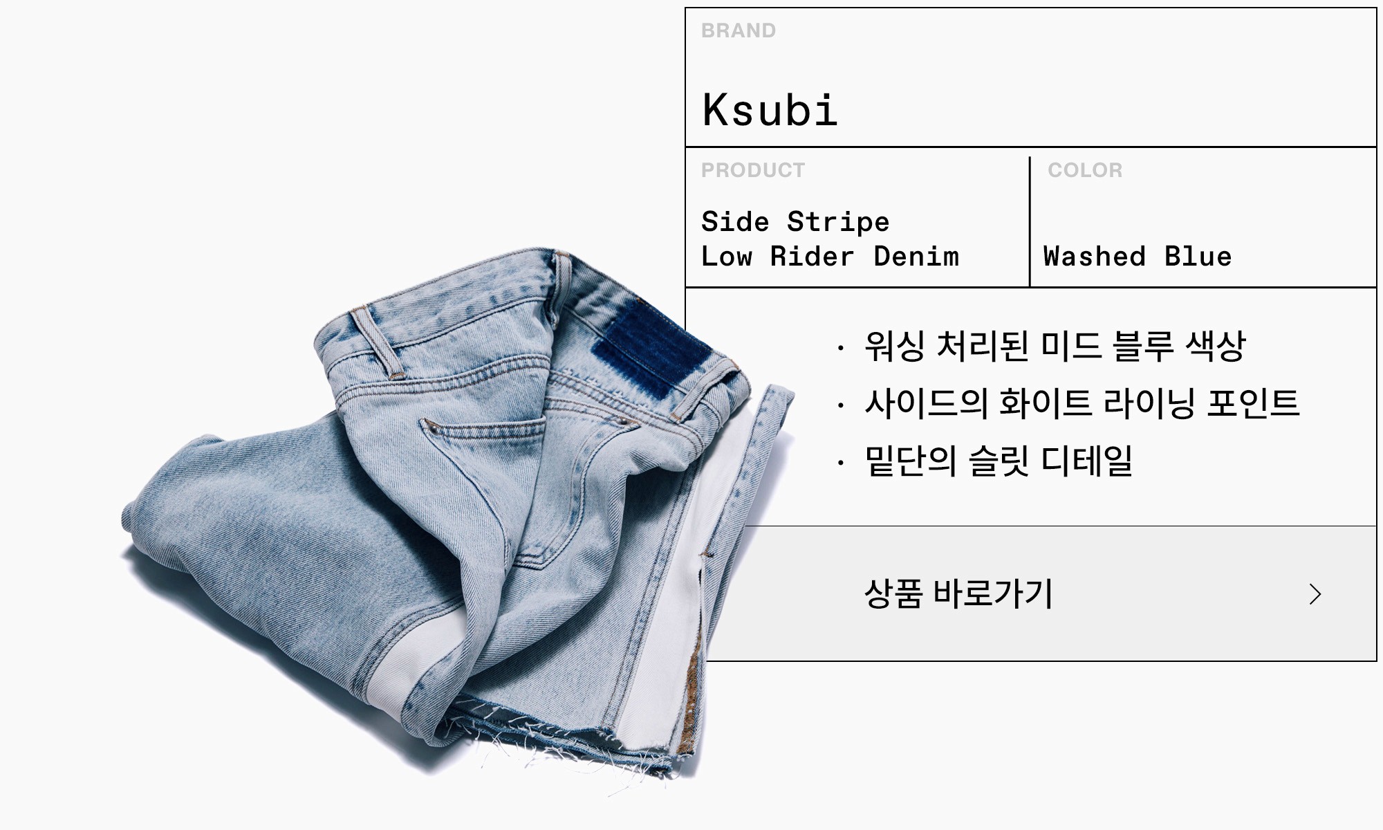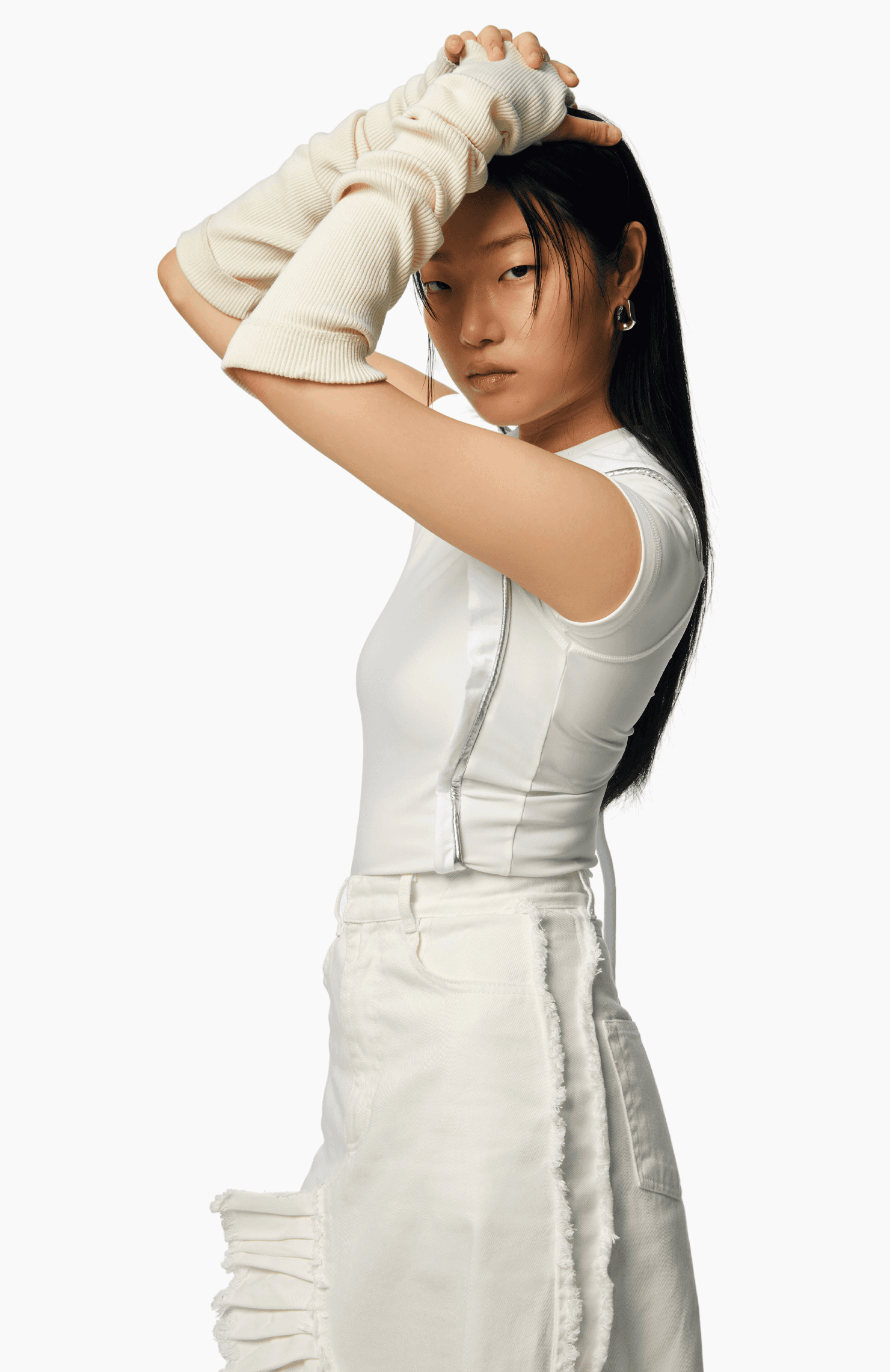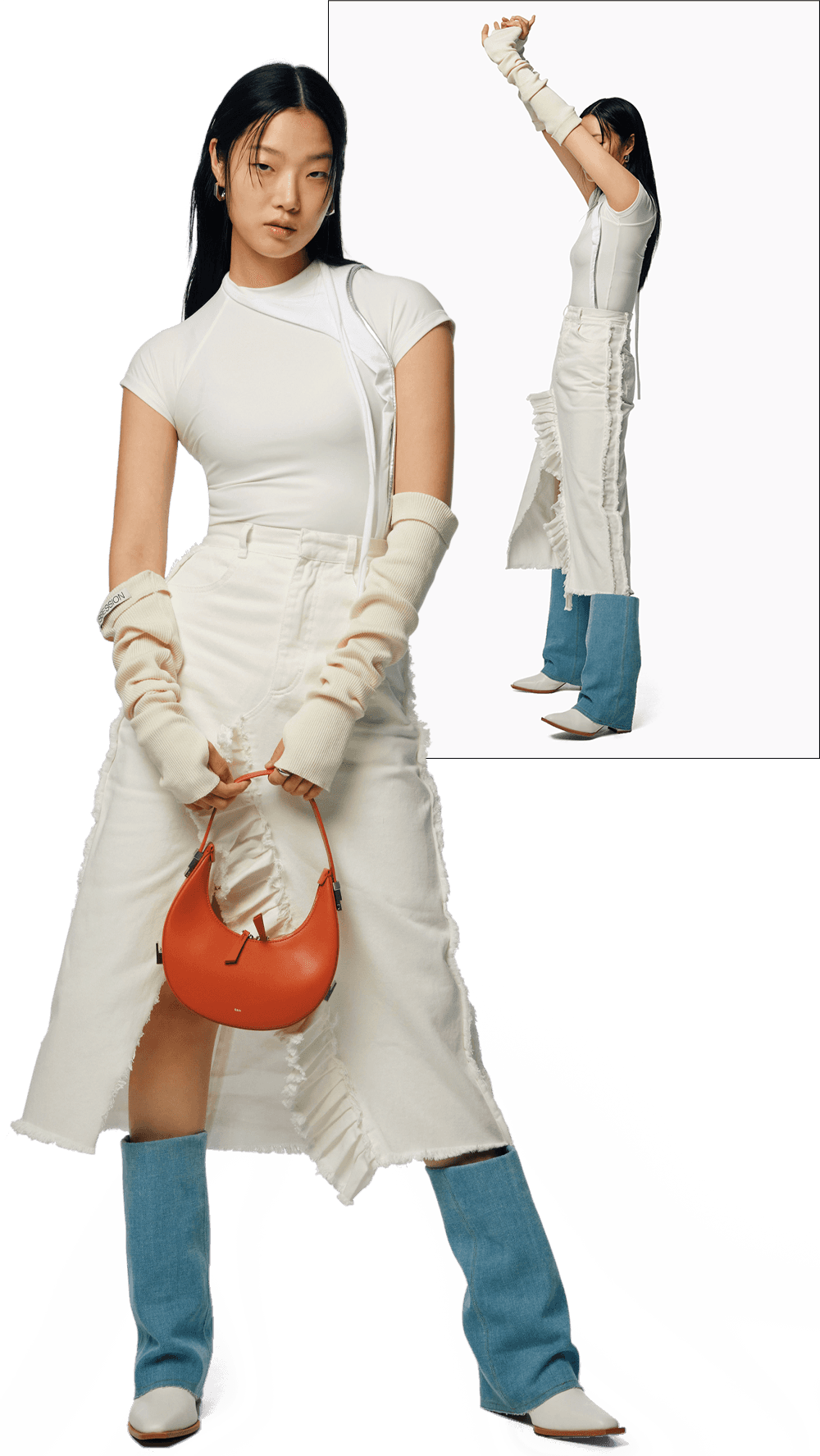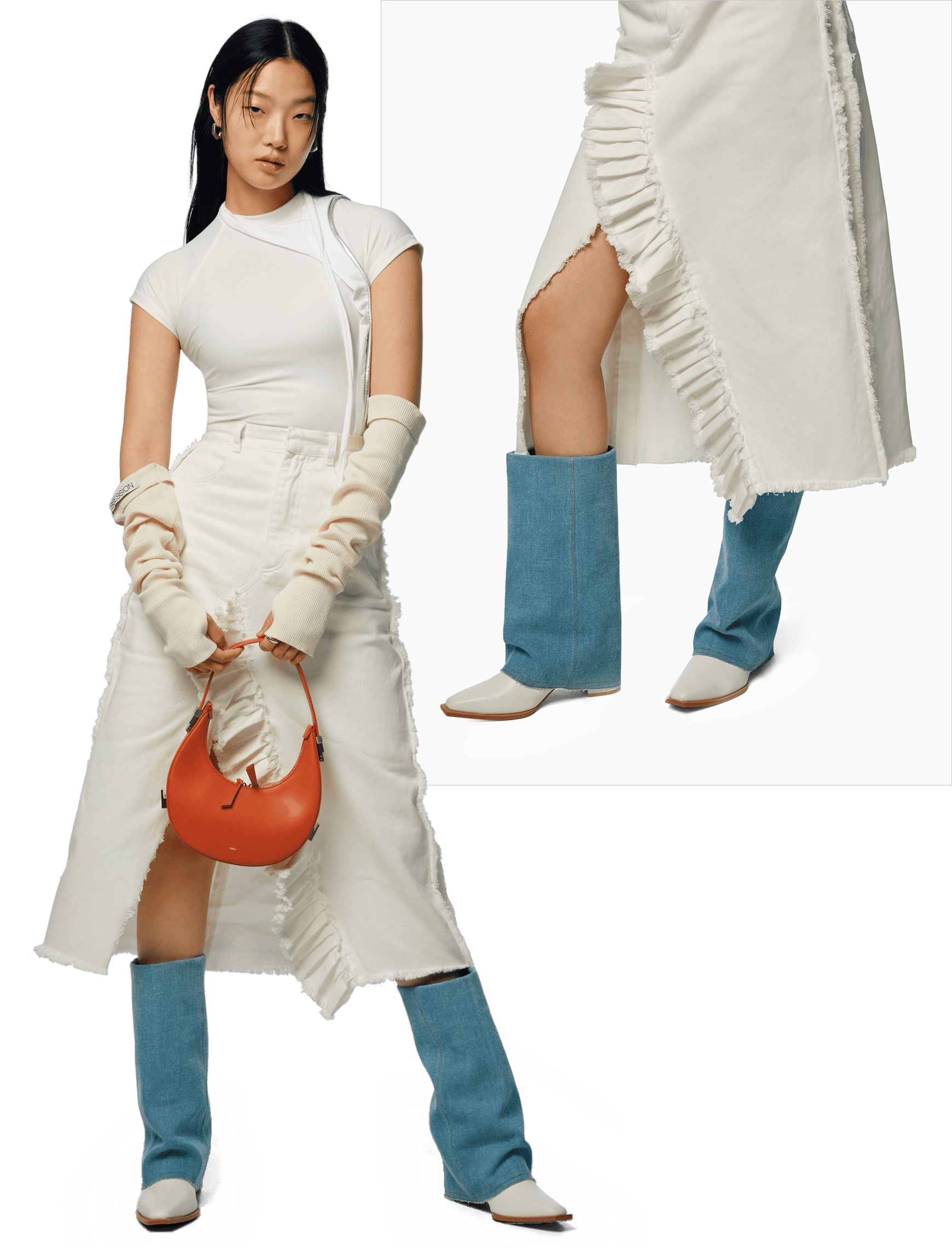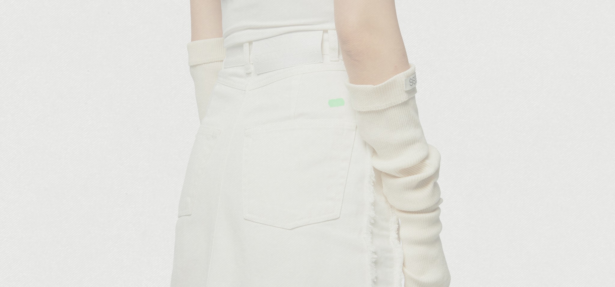 Y2K 트렌드는 여전히 유효합니다. 1990년대 유행했던 찢어진 데님은 Y2K 스타일을 연출하고 싶을 때 유용한 아이템! 깊은 슬릿에 러플 장식의 미디 데님 스커트와 밑단 옆선에 슬릿 디테일의 와이드 데님 팬츠는 하나만으로도 존재감이 강렬해요. 상의는 최대한 심플한 티셔츠를 매치하는 것이 관건입니다. 첫 번째 룩처럼 소재를 다르게 매치하면 컬러는 심플해도 더욱 스타일리시한 룩을 완성할 수 있어요. 화이트, 그레이의 기본 탱크톱을 레이어링한 두번째 스타일링도 참고해보세요.