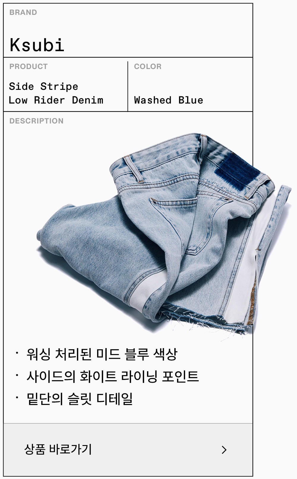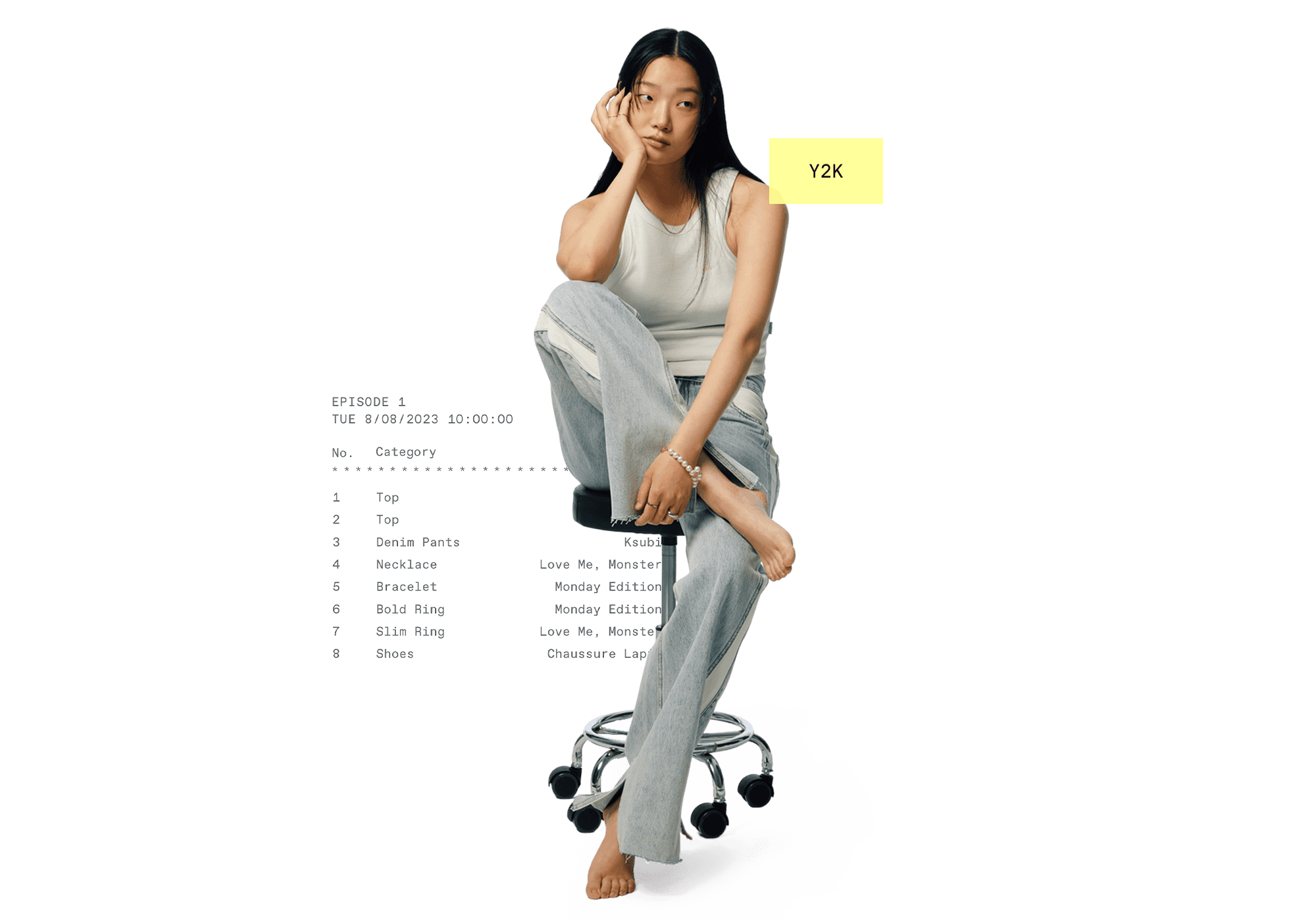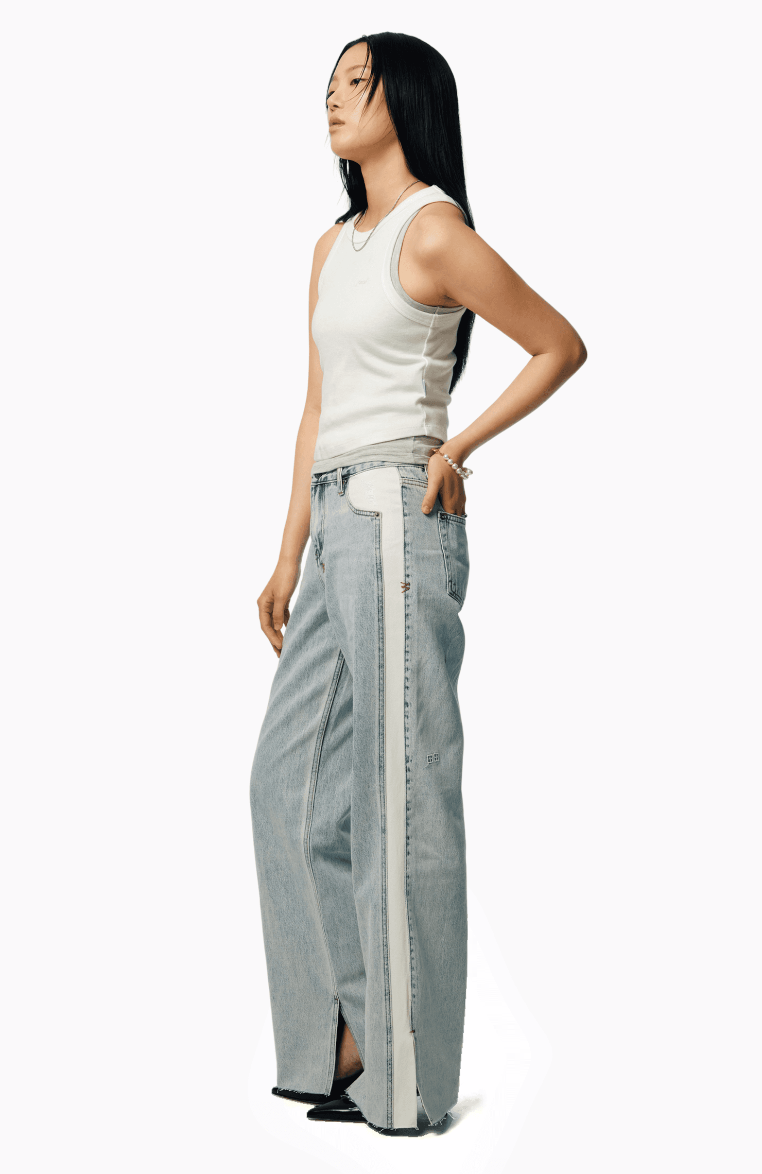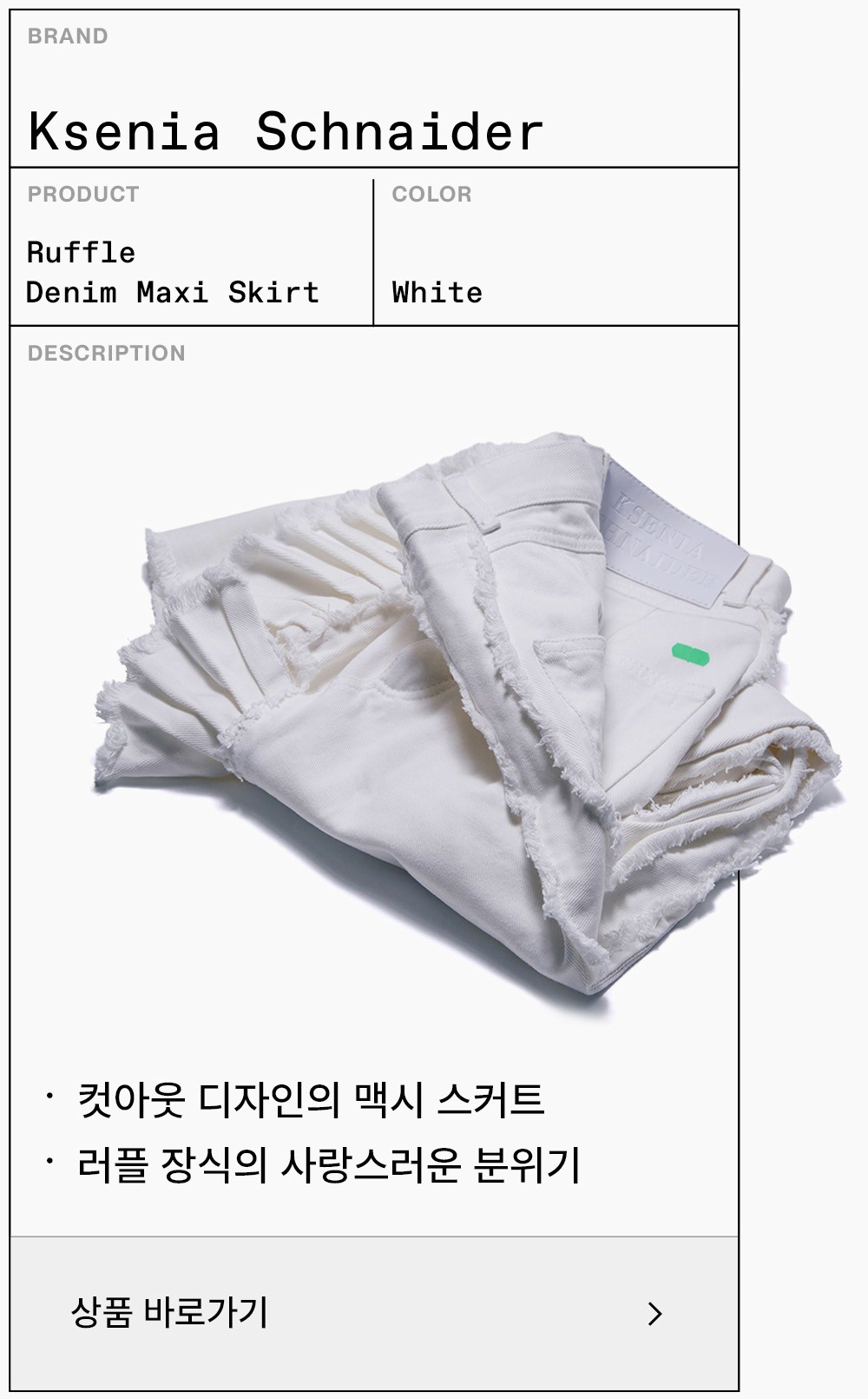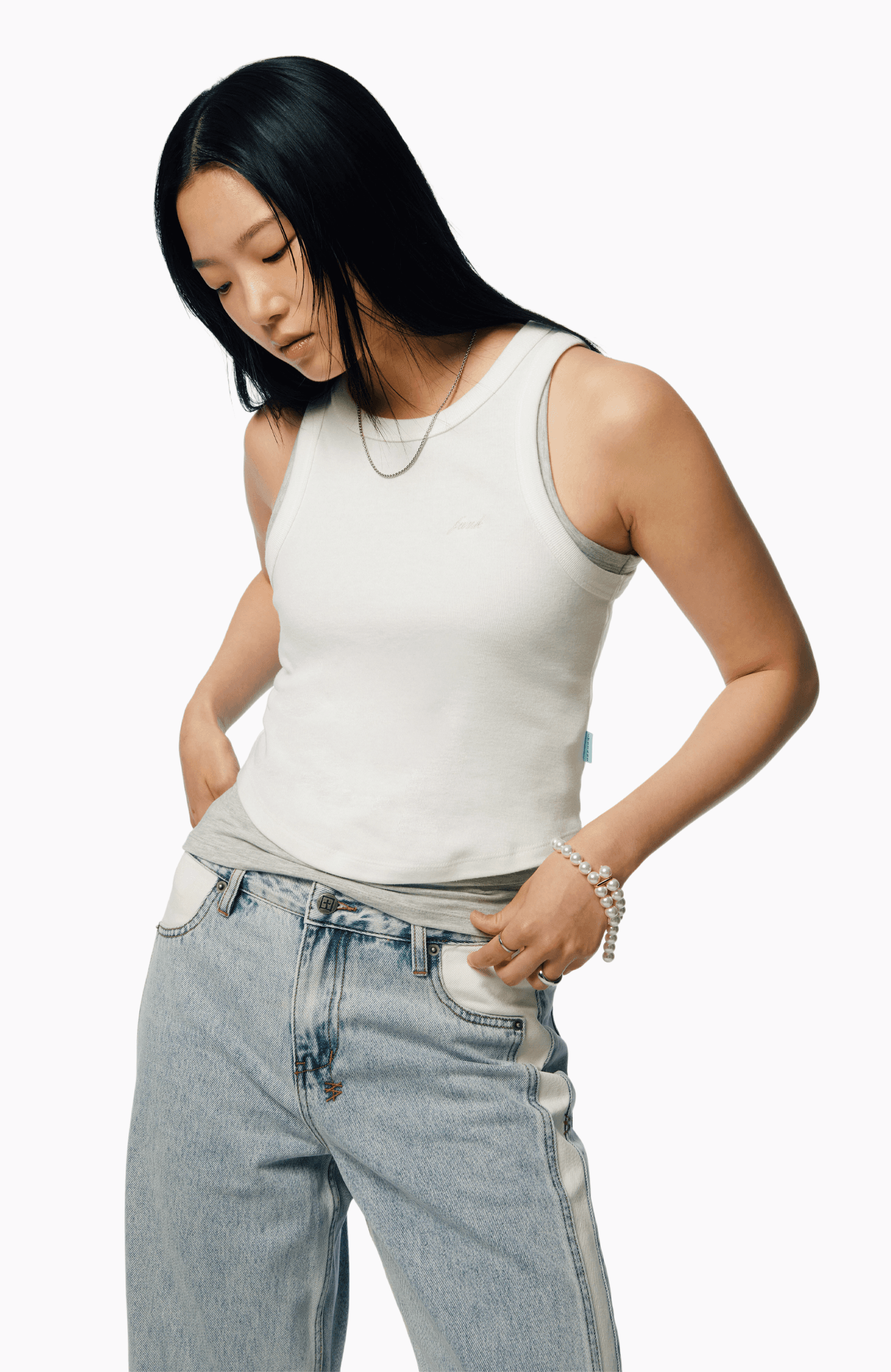 Y2K 트렌드는 여전히 유효합니다. 1990년대 유행했던 찢어진 데님은 Y2K 스타일을 연출하고 싶을 때 유용한 아이템! 깊은 슬릿에 러플 장식의 미디 데님 스커트와 밑단 옆선에 슬릿 디테일의 와이드 데님 팬츠는 하나만으로도 존재감이 강렬해요. 상의는 최대한 심플한 티셔츠를 매치하는 것이 관건입니다. 첫 번째 룩처럼 소재를 다르게 매치하면 컬러는 심플해도 더욱 스타일리시한 룩을 완성할 수 있어요. 화이트, 그레이의 기본 탱크톱을 레이어링한 두번째 스타일링도 참고해보세요.