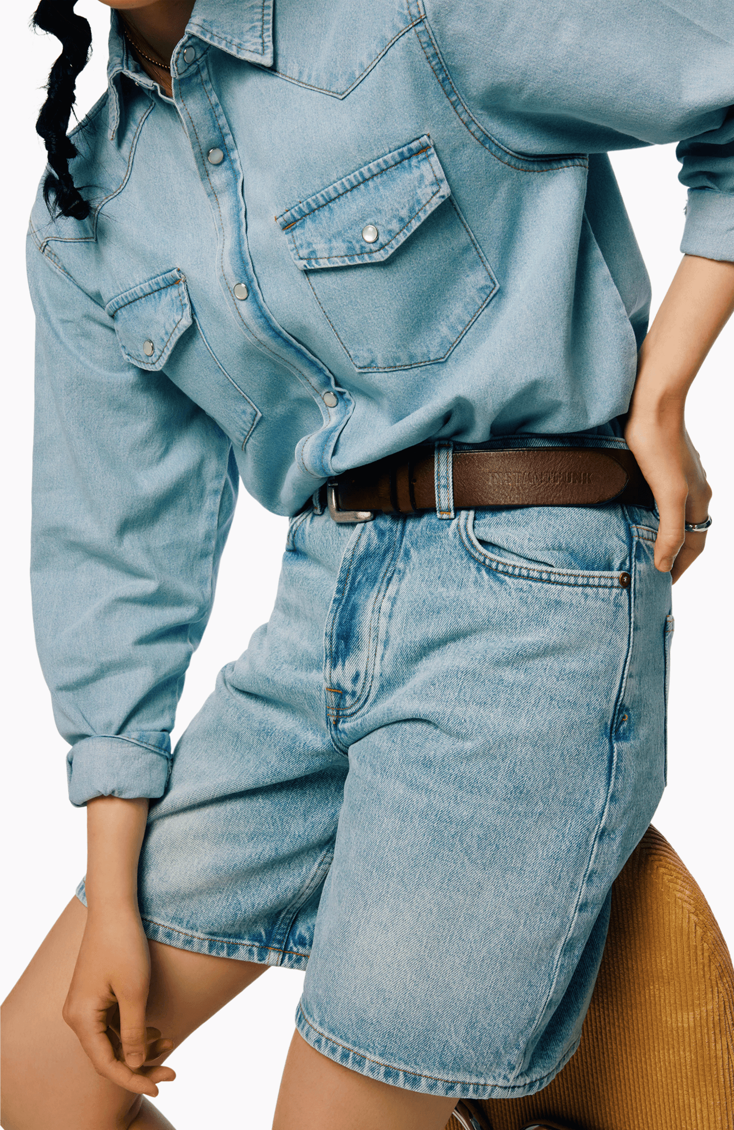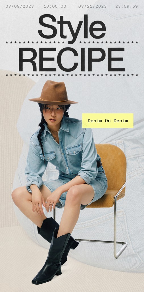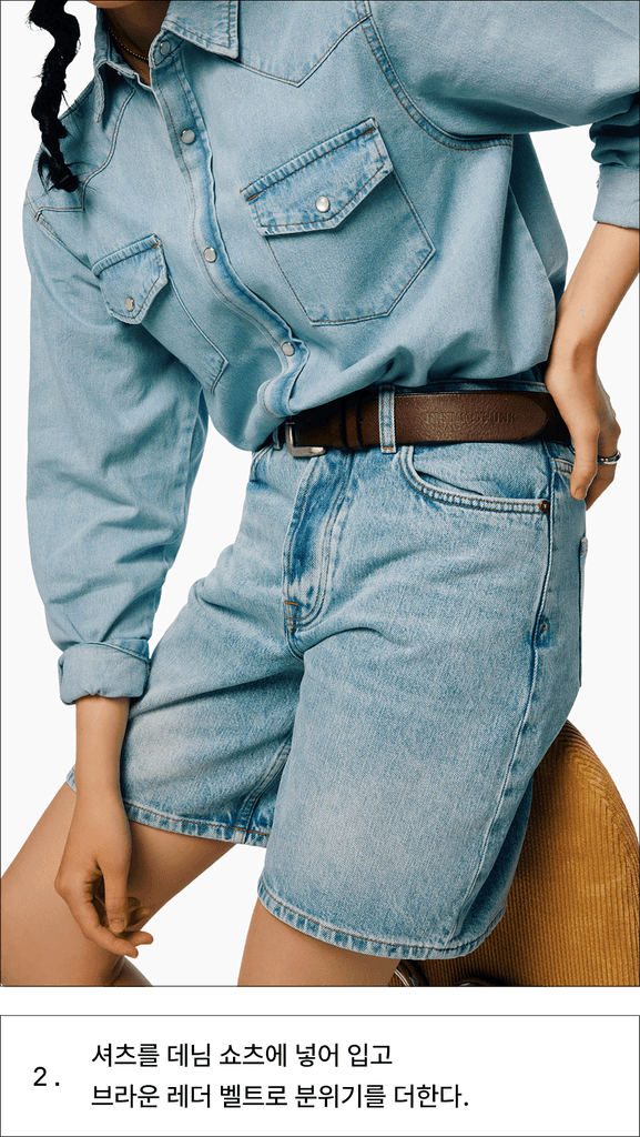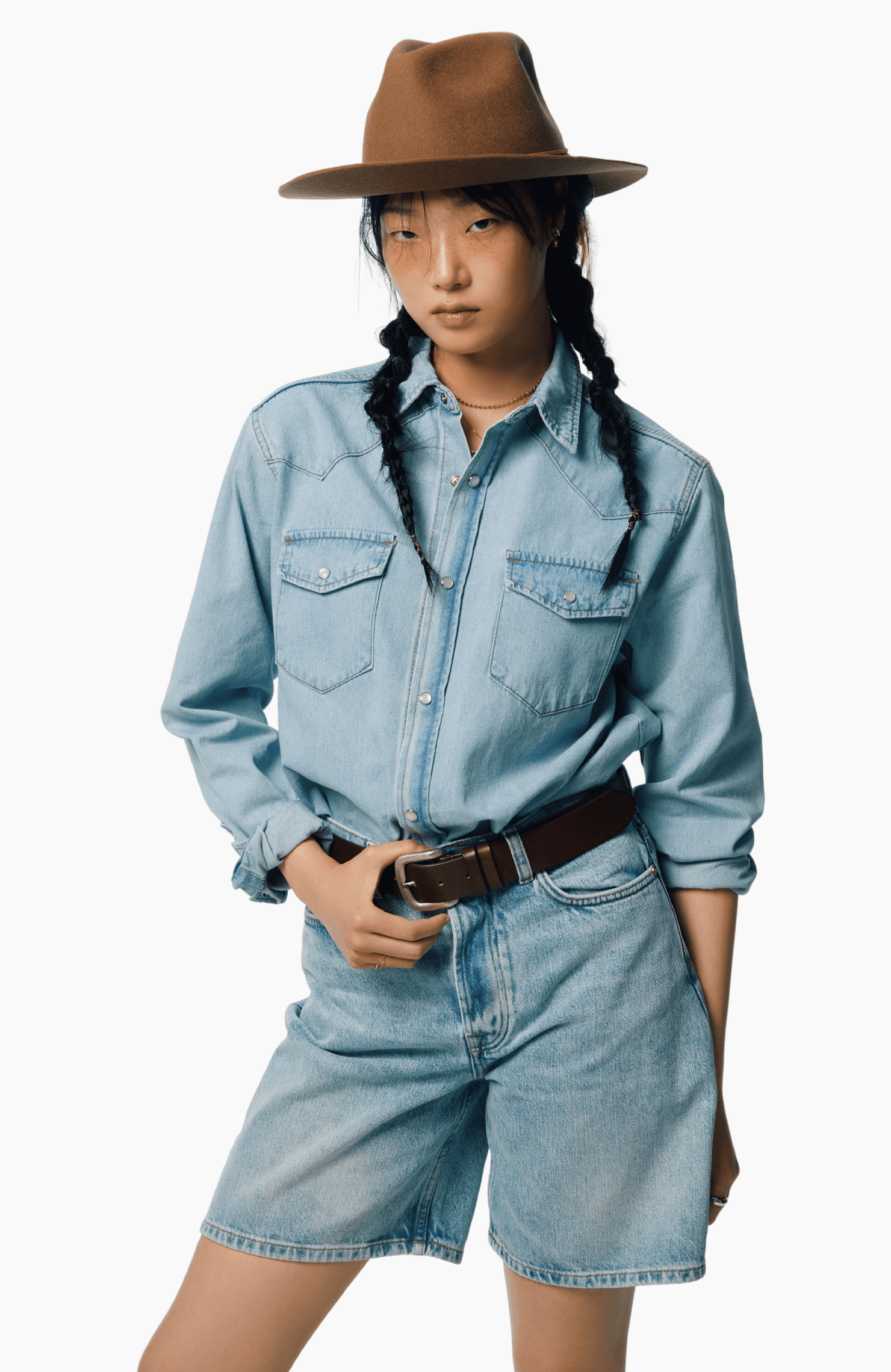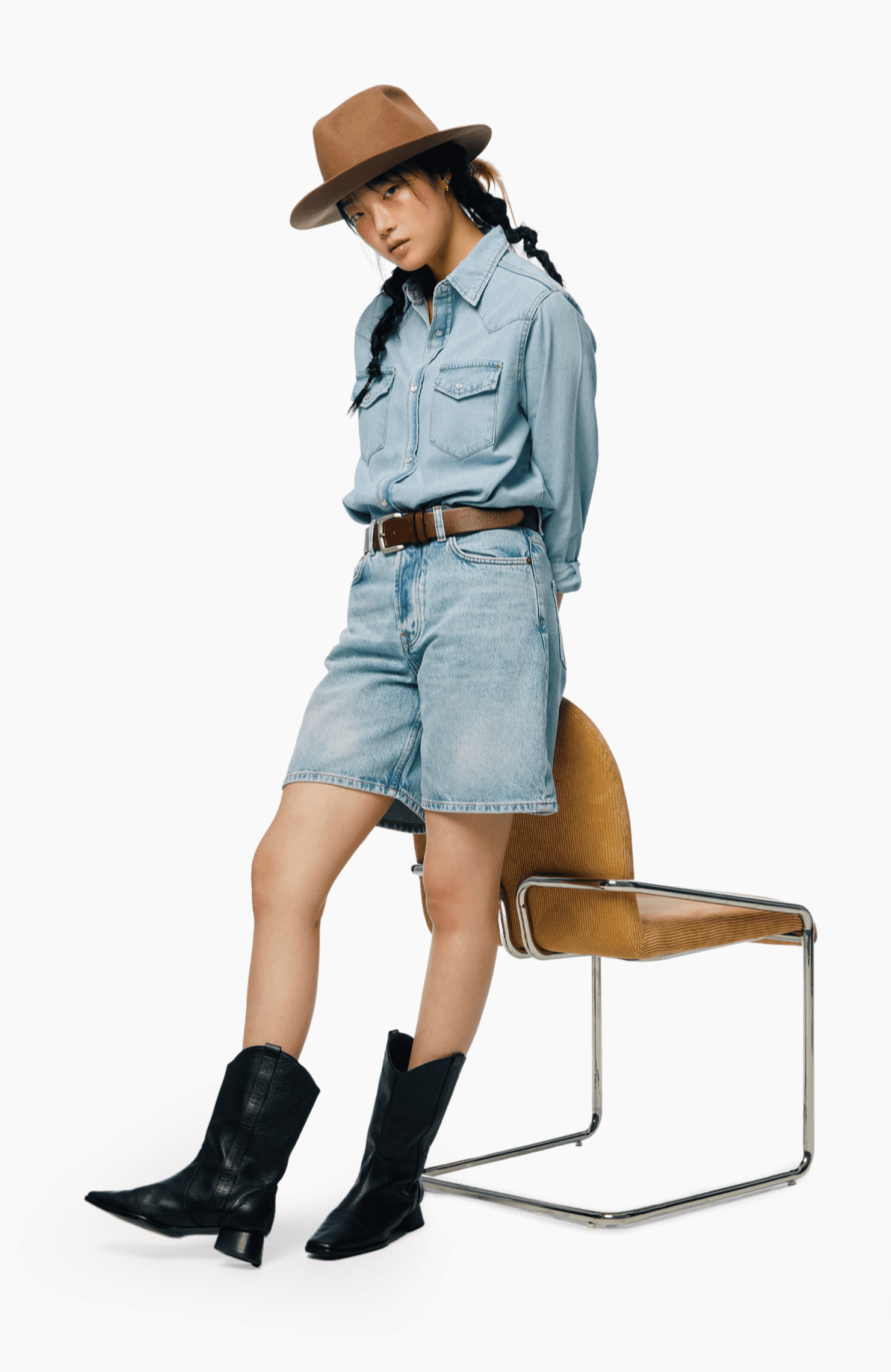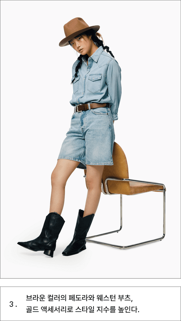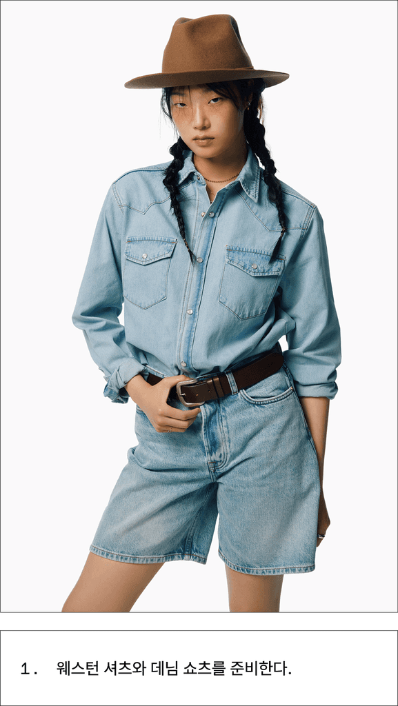 청청 패션은 자칫 잘못하면 촌스러워 보일 수 있기 때문에 상, 하의 데님의 컬러와 워싱을 비슷하게 맞추는 것이 좋아요. 웨스턴 셔츠와 데님 쇼츠를 활용해 웨스턴 무드를 즐겨보세요. 웨스턴 스타일링을 즐겨 입는 지지 하디드처럼 데님 팬츠에 레더 재킷, 웨스턴 부츠만 더해도 심플하게 완성할 수 있습니다. 단, 웨스턴 부츠나 페도라처럼 웨스턴 무드를 극대화할 수 있는 액세서리를 적극 활용해보세요.