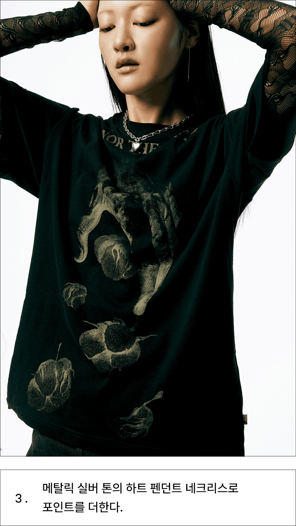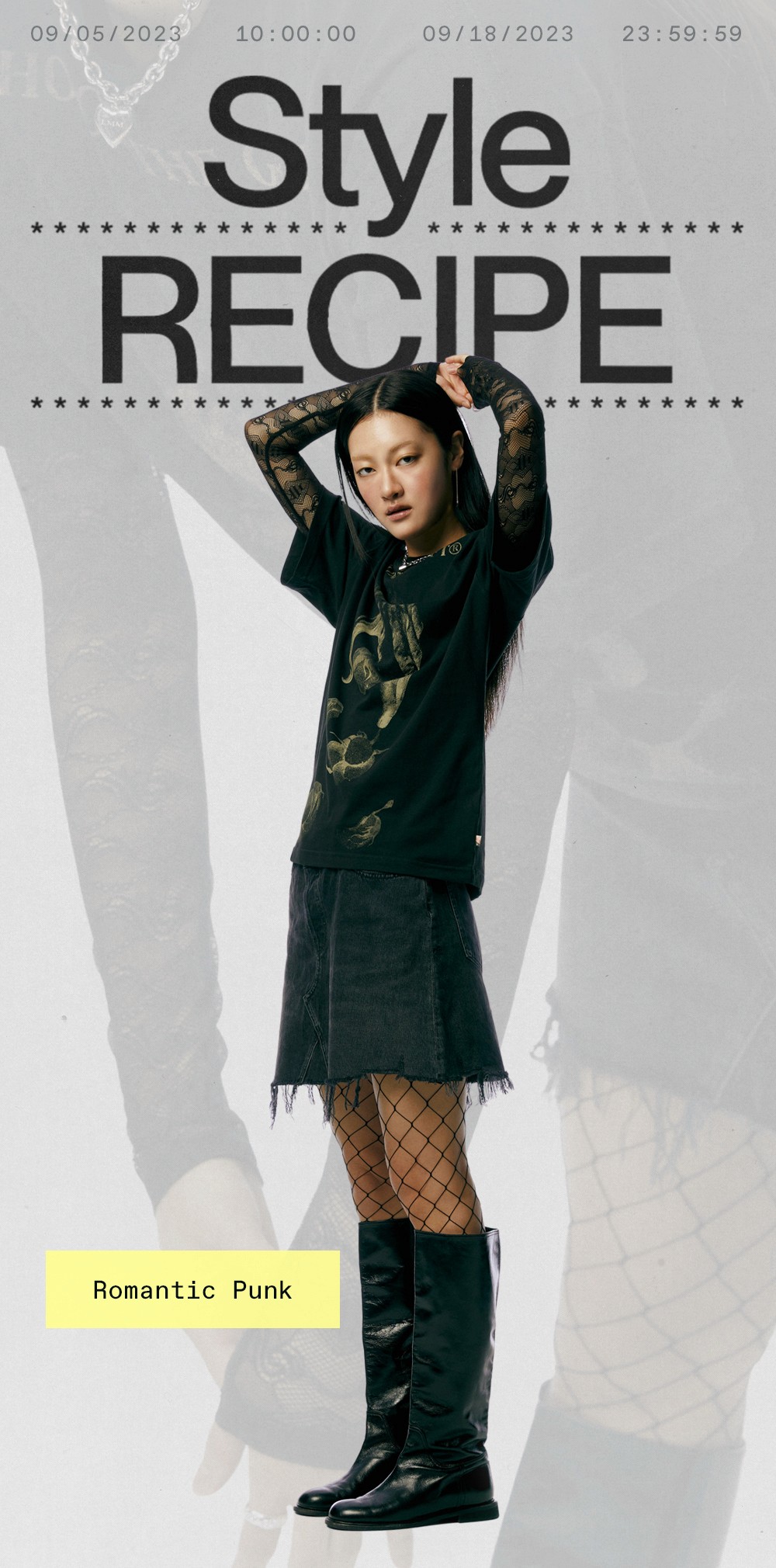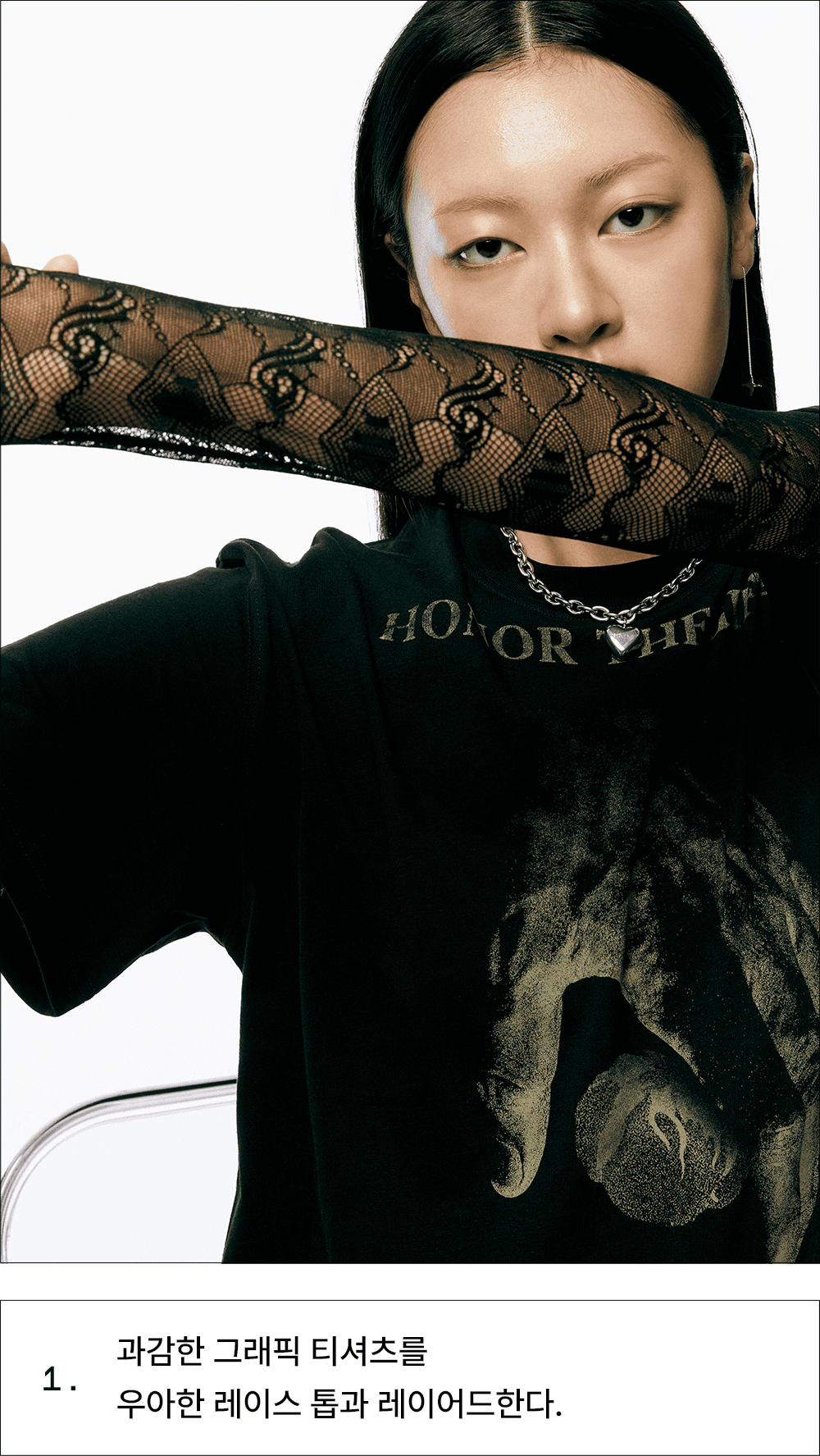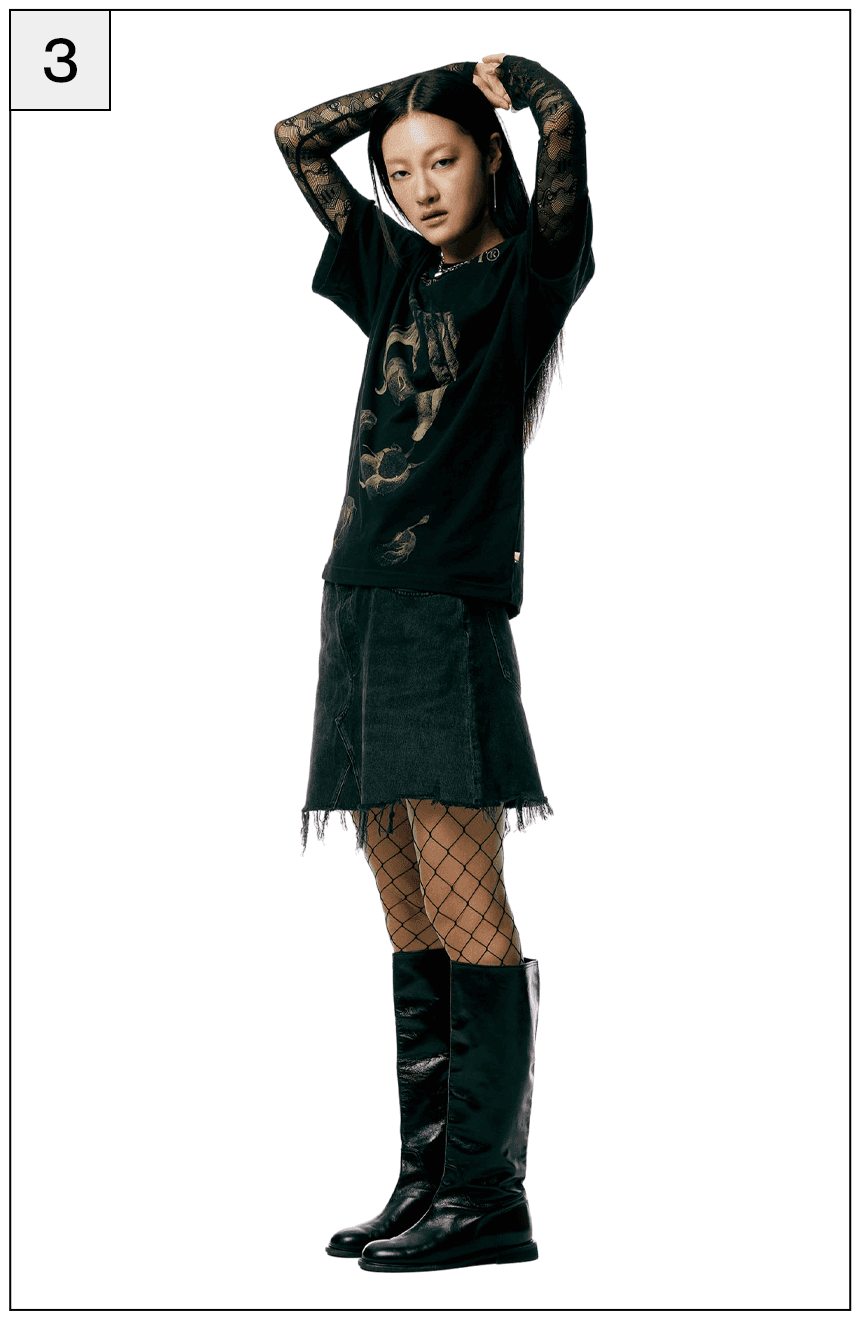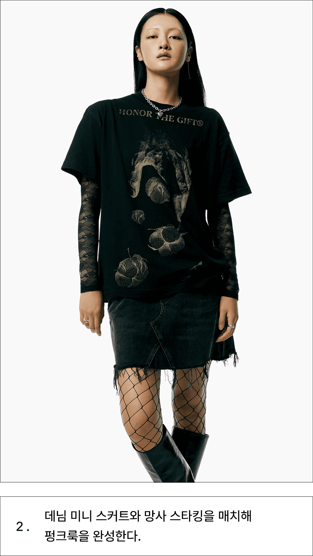 기존 질서에 대한 반항으로 시작된 도전적인 펑크 룩을 2023년 버전으로 재해석한 흐름이 떠올랐어요. 고유의 펑크룩을 연상시키는 과감한 그래픽 반소매 티셔츠를 센슈얼한 레이스 톱과 매치해보세요. 헤진 듯 올이 풀린 데님 미니 스커트와 망사 스타킹을 더하면 그야말로 완벽한 펑크룩 완성! 여기에 메탈릭 실버 톤의 주얼리를 더해 로맨틱한 변주가 더해진 데일리룩을 시도해보세요.