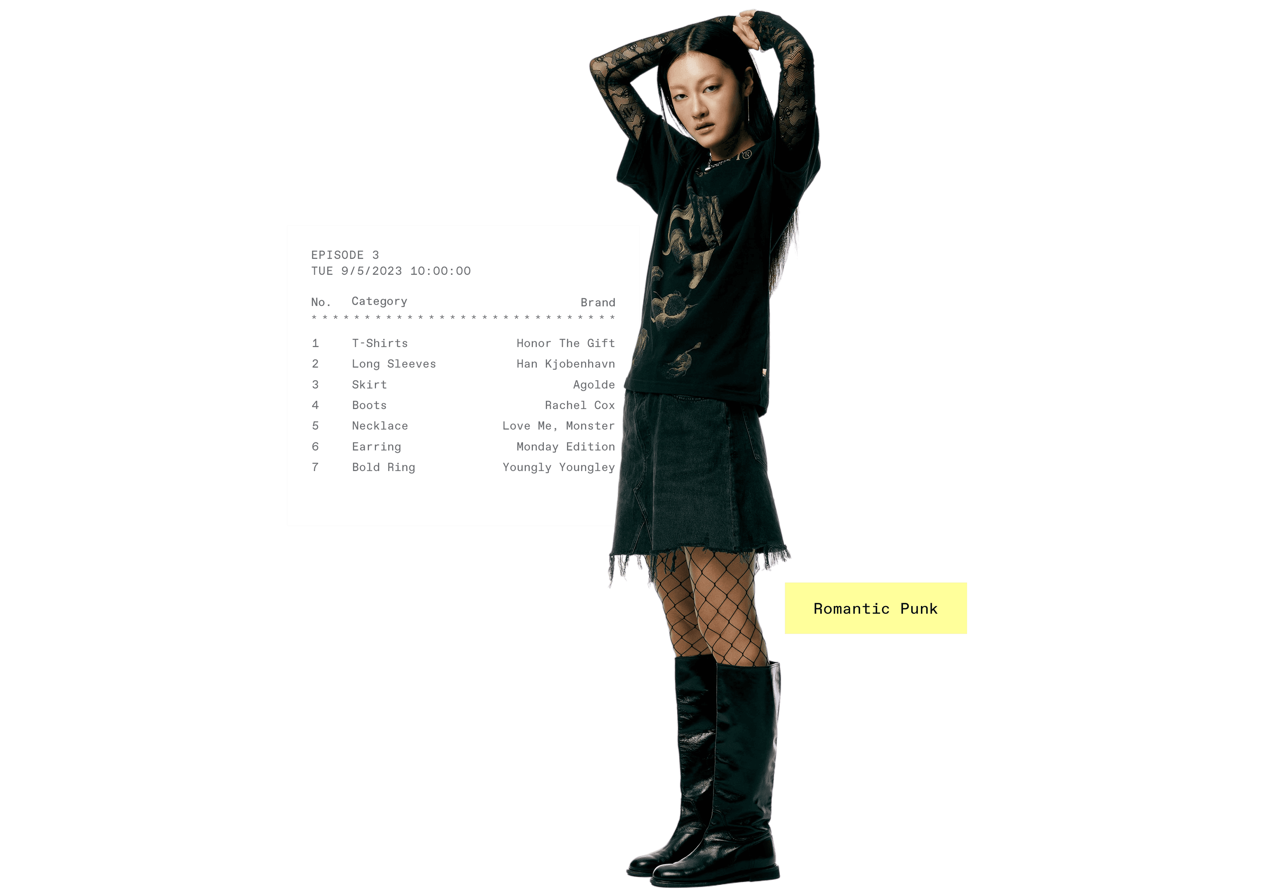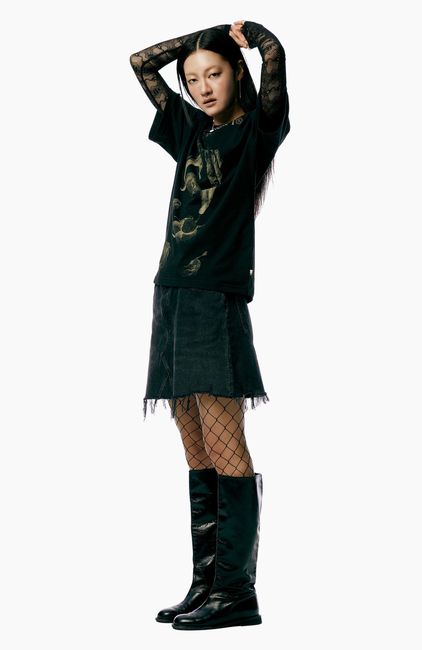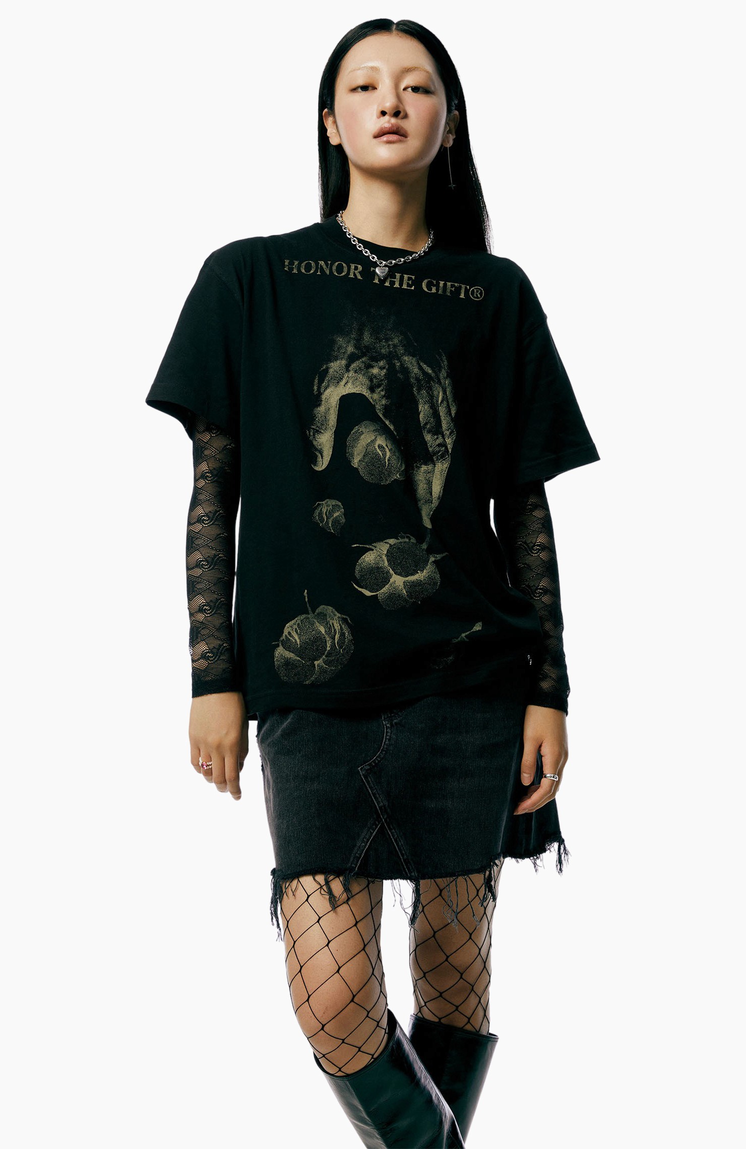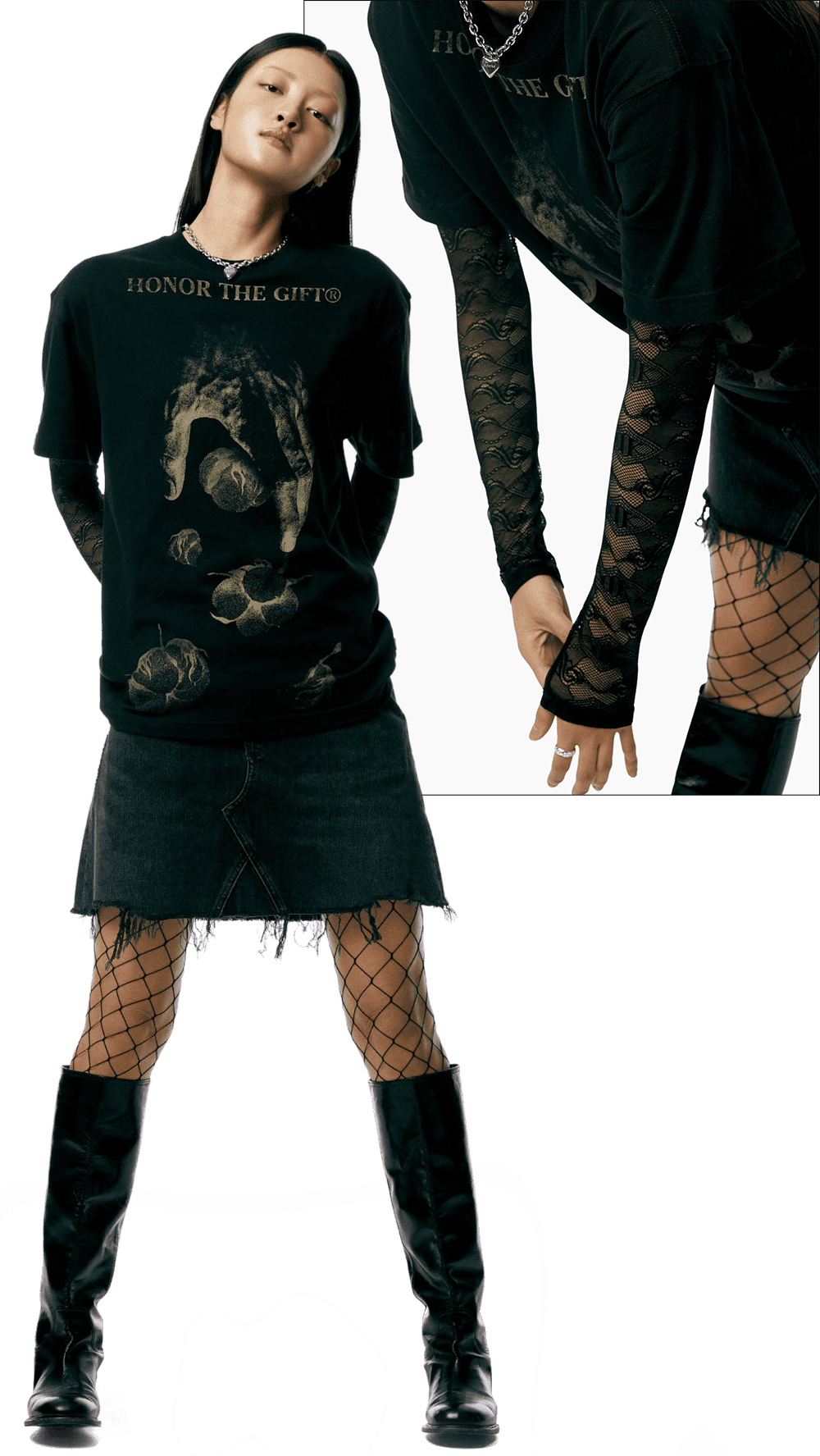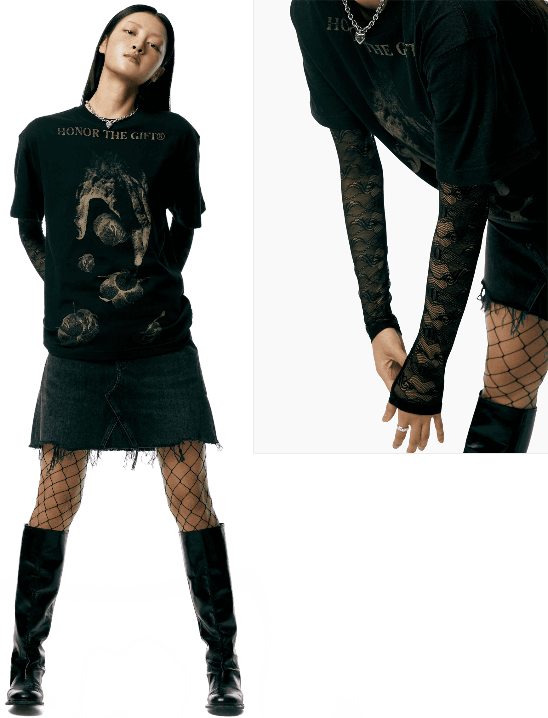 기존 질서에 대한 반항으로 시작된 도전적인 펑크 룩을 2023년 버전으로 재해석한 흐름이 떠올랐어요. 고유의 펑크룩을 연상시키는 과감한 그래픽 반소매 티셔츠를 센슈얼한 레이스 톱과 매치해보세요. 헤진 듯 올이 풀린 데님 미니 스커트와 망사 스타킹을 더하면 그야말로 완벽한 펑크룩 완성! 여기에 메탈릭 실버 톤의 주얼리를 더해 로맨틱한 변주가 더해진 데일리룩을 시도해보세요.
