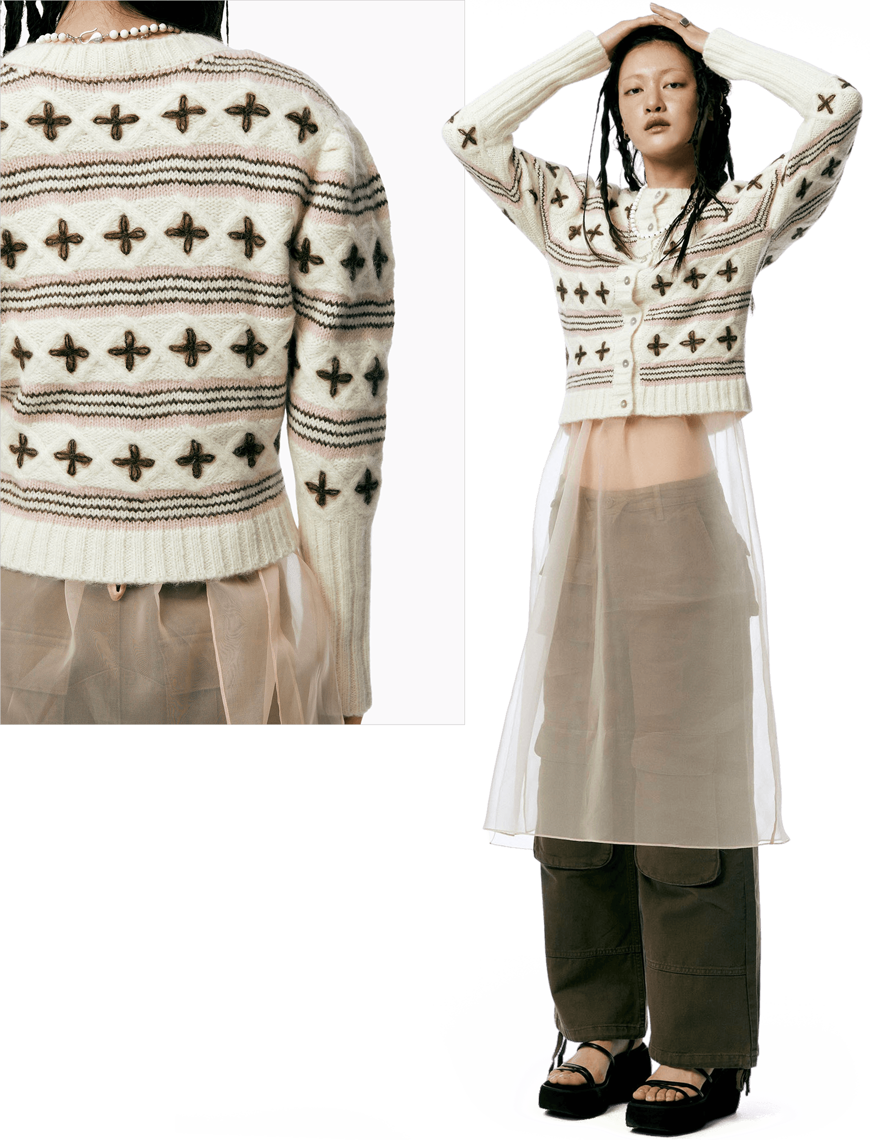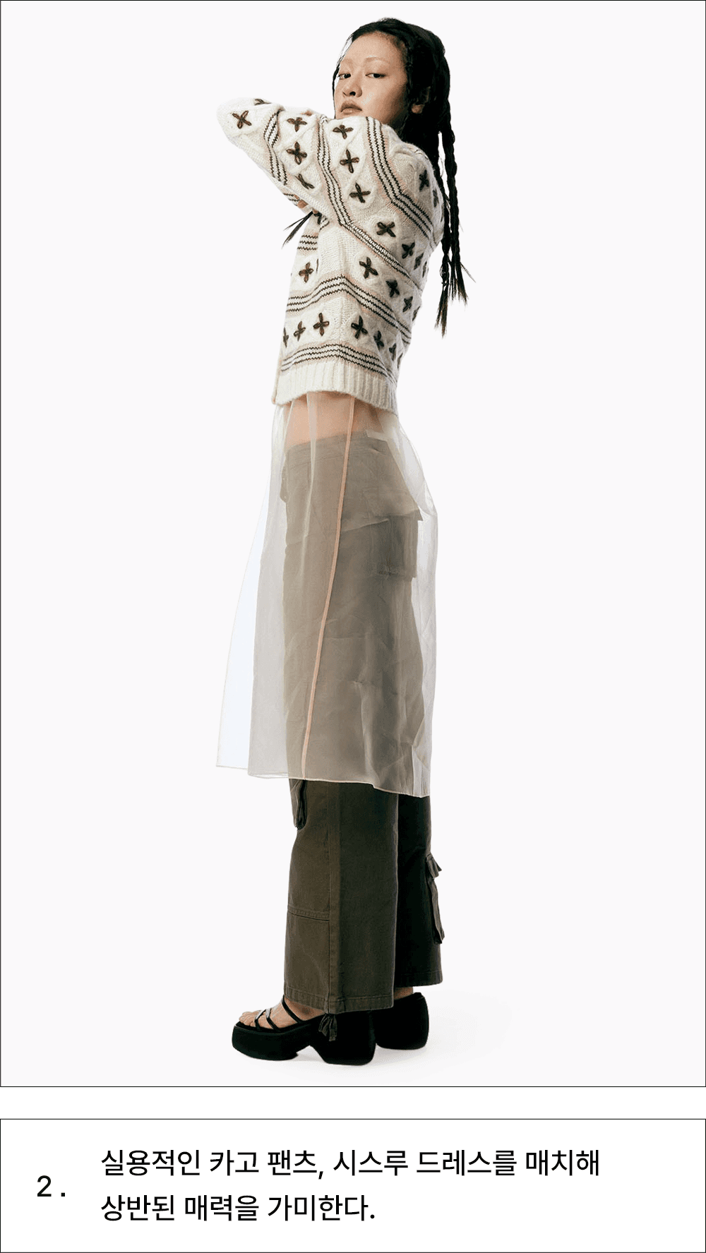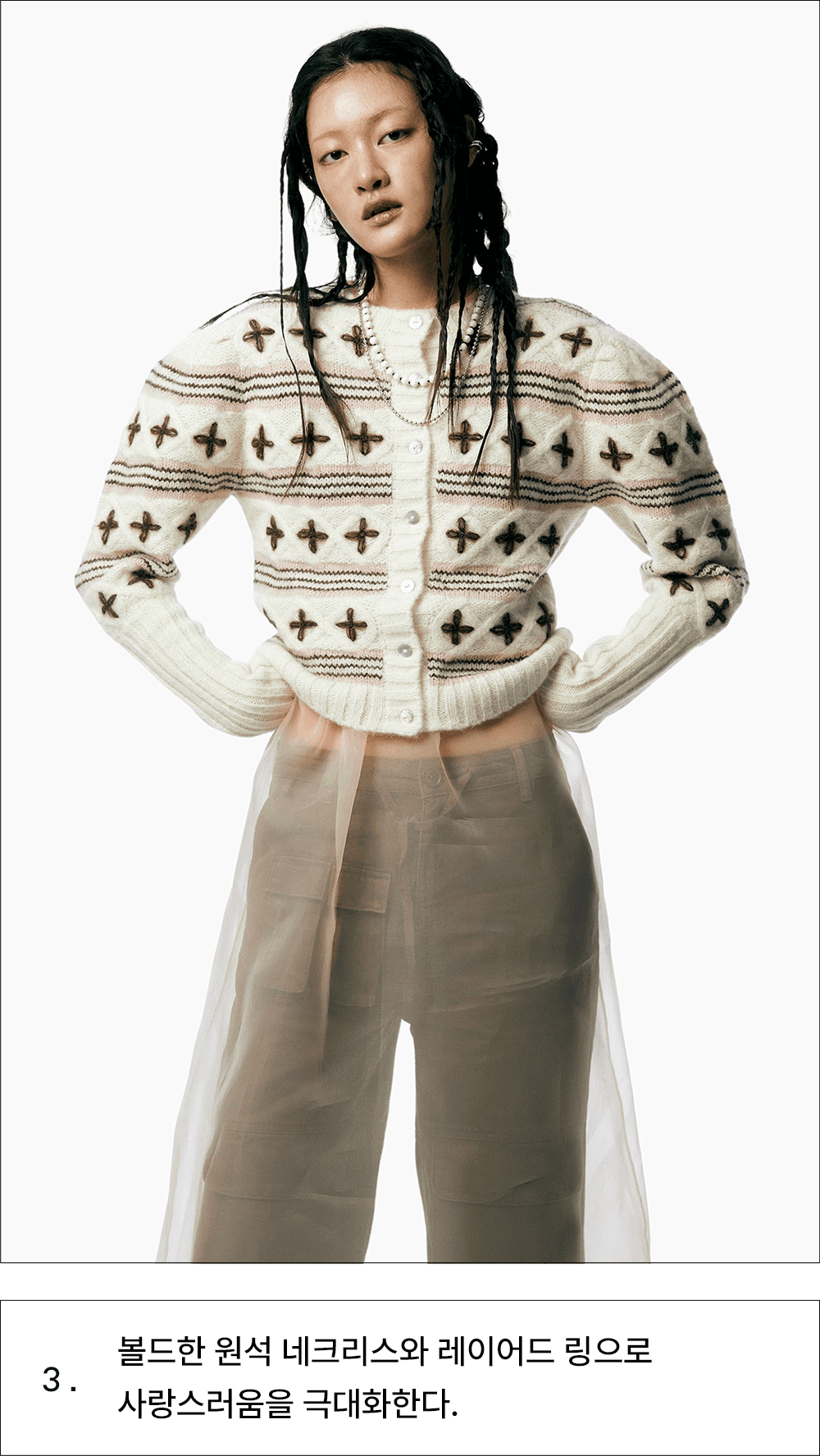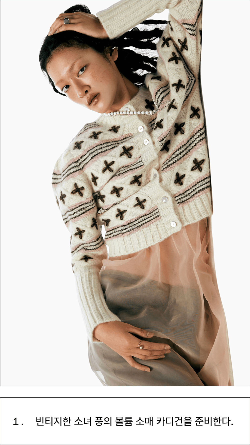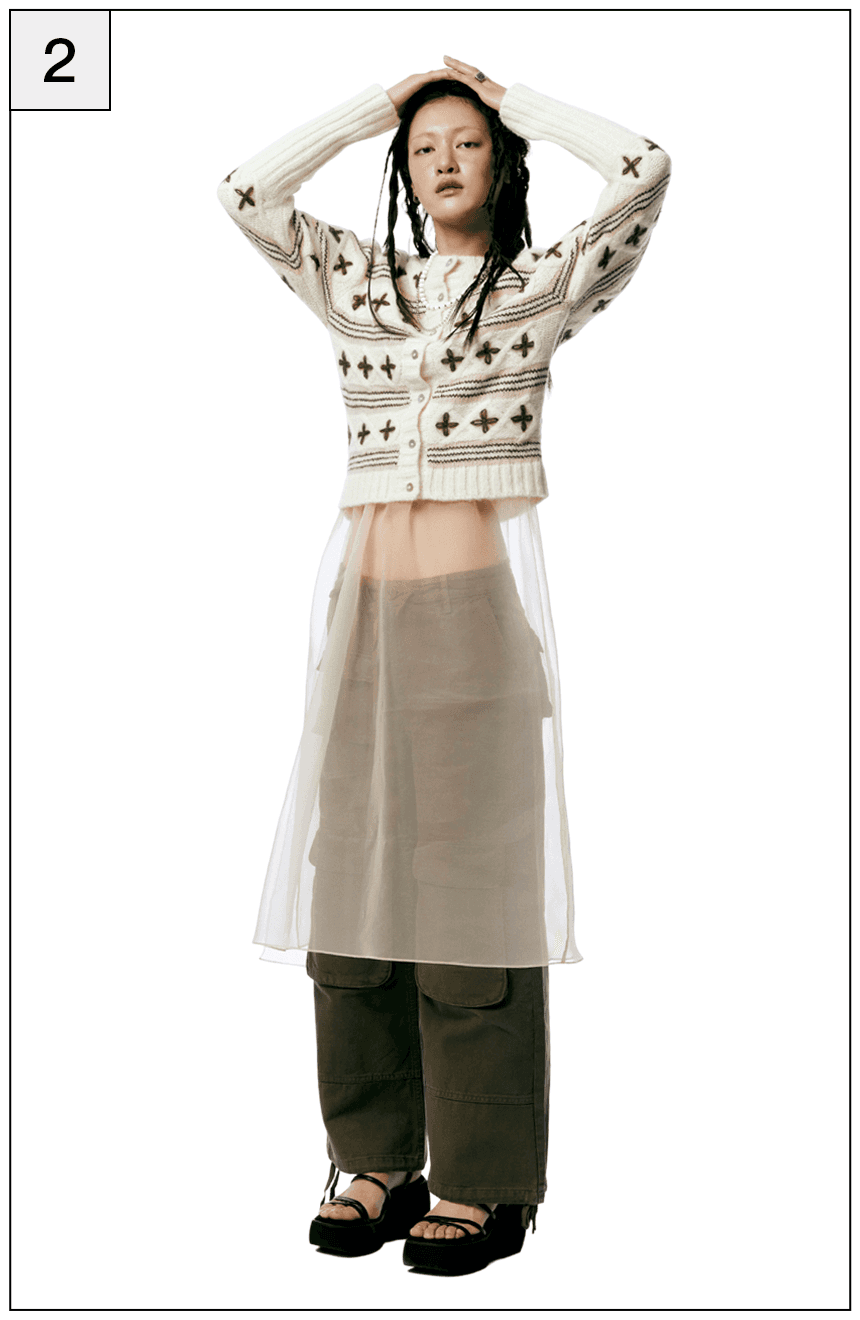 할머니 옷장에서 막 꺼내 입은 듯한 빈티지한 매력의 카디건 하나면 지금부터 찬바람이 부는 한겨울까지 포근한 데일리 아이템이 되어줄 거예요. 아름다운 전원이 떠오르는 코티지코어의 인기는 올해까지 유효하다는 사실. 다만 이전과는 달리 상반된 매력의 유틸리티 카고팬츠 혹은 트랙팬츠를 새롭게 더해주세요. 마냥 귀여운 시골 소녀 느낌이 아닌 중화된 매력의 스타일리시한 코티지룩이 완성됩니다.